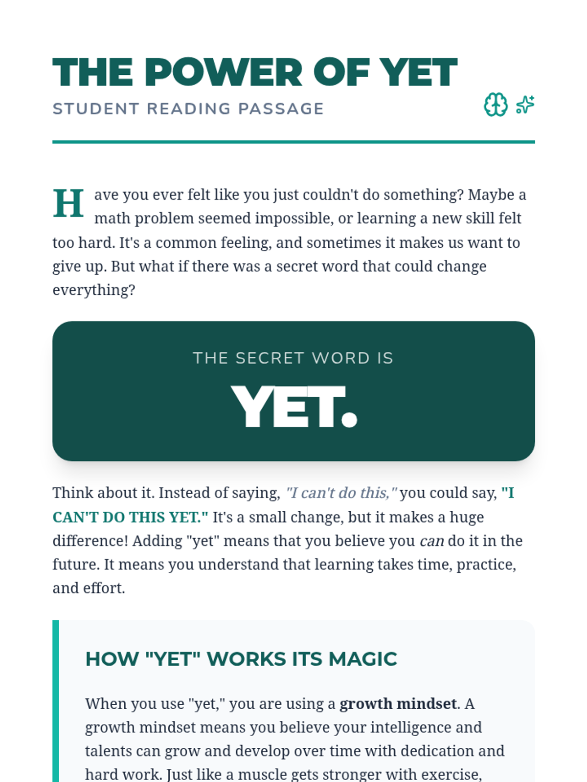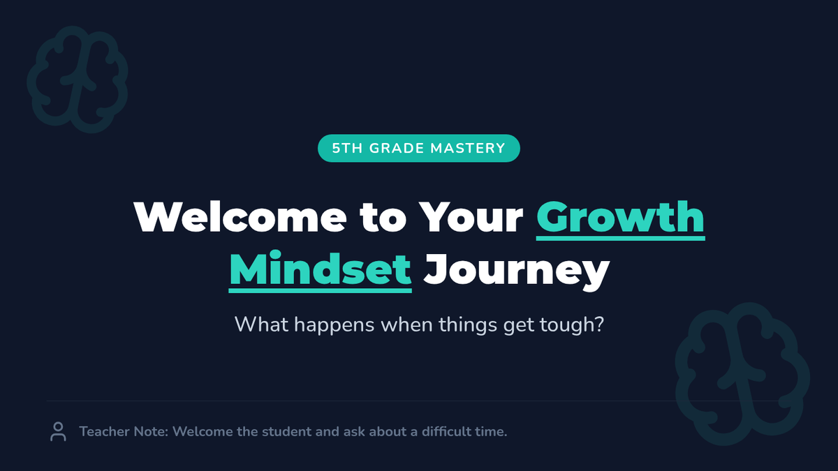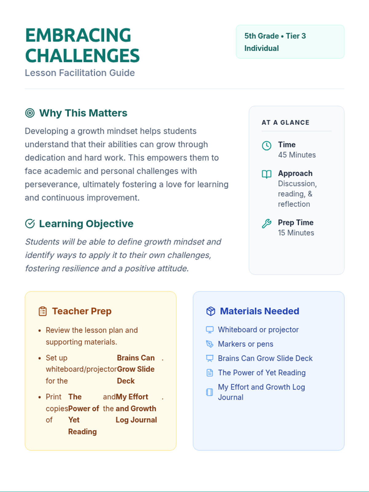 A transformative individual lesson for 5th graders that introduces the concept of neuroplasticity and the 'power of yet' to build resilience and academic confidence.