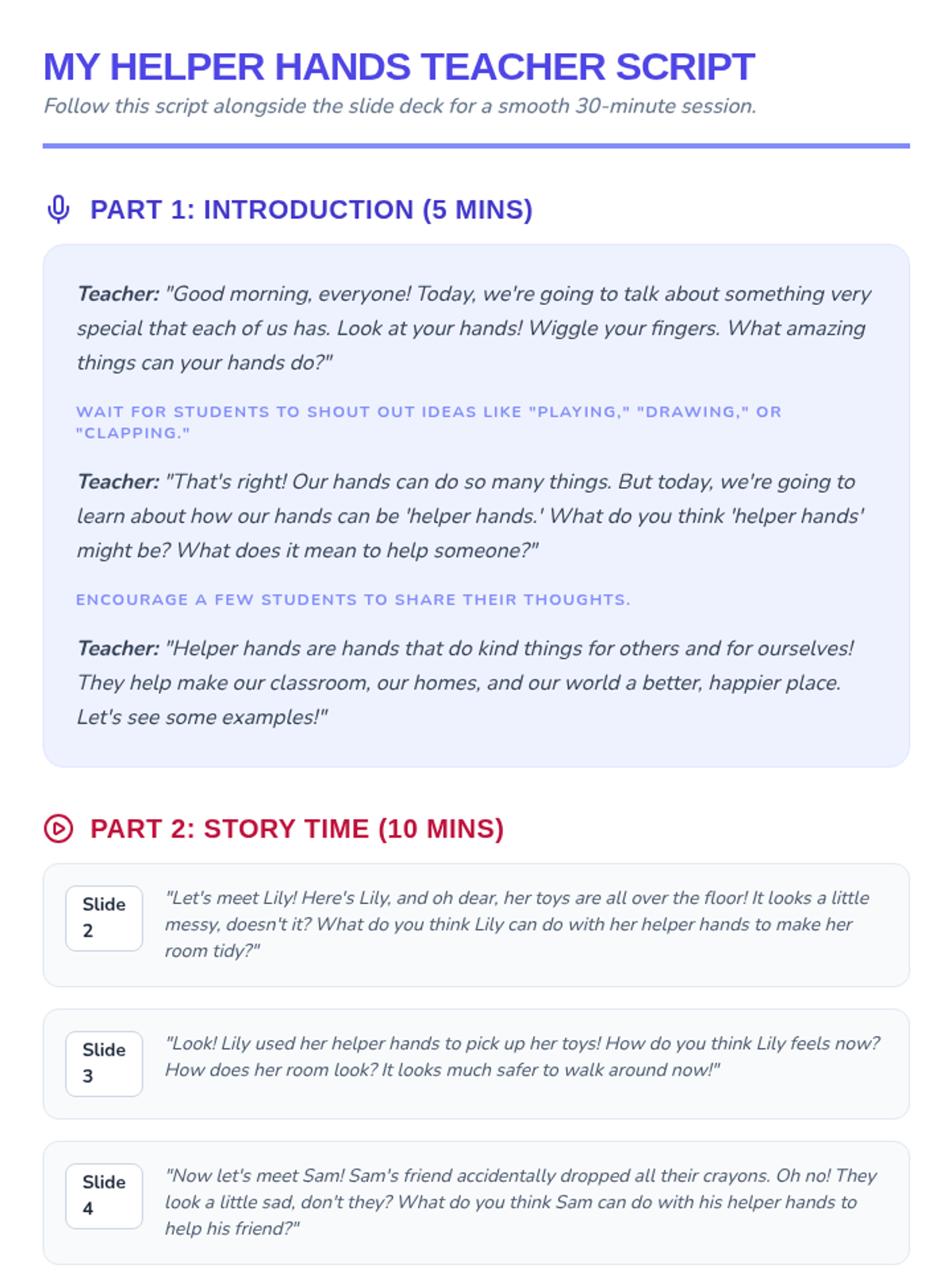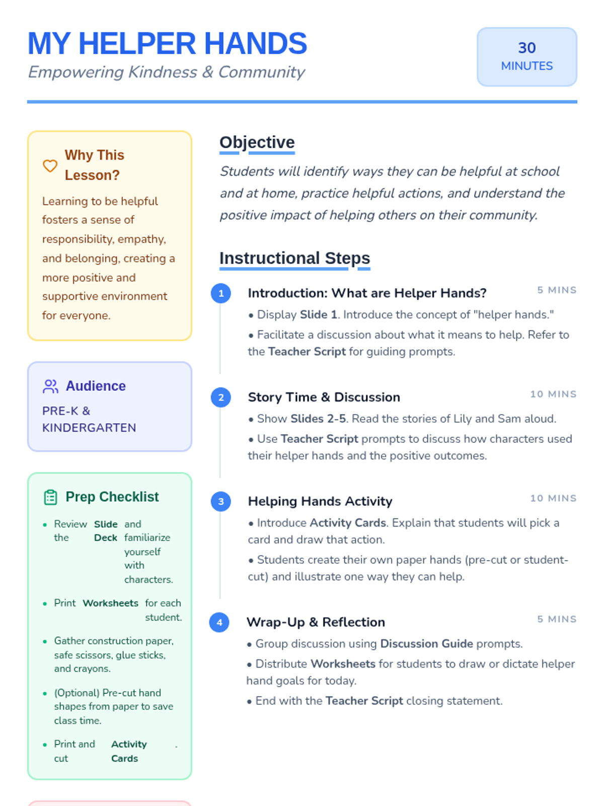 This lesson empowers Pre-K and Kindergarten students to understand the importance of helping others and contributing positively to their classroom community through interactive stories and hands-on activities.