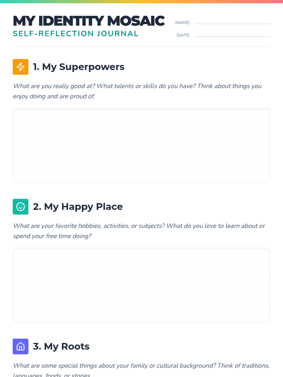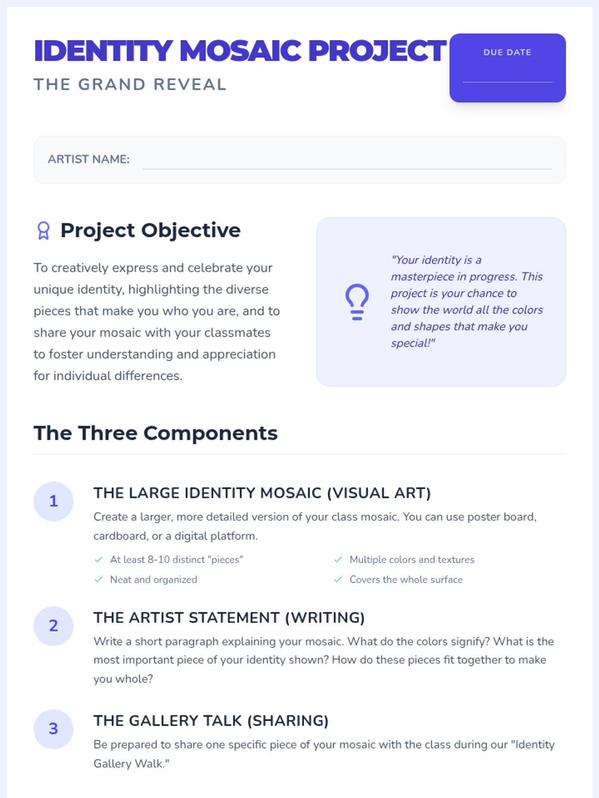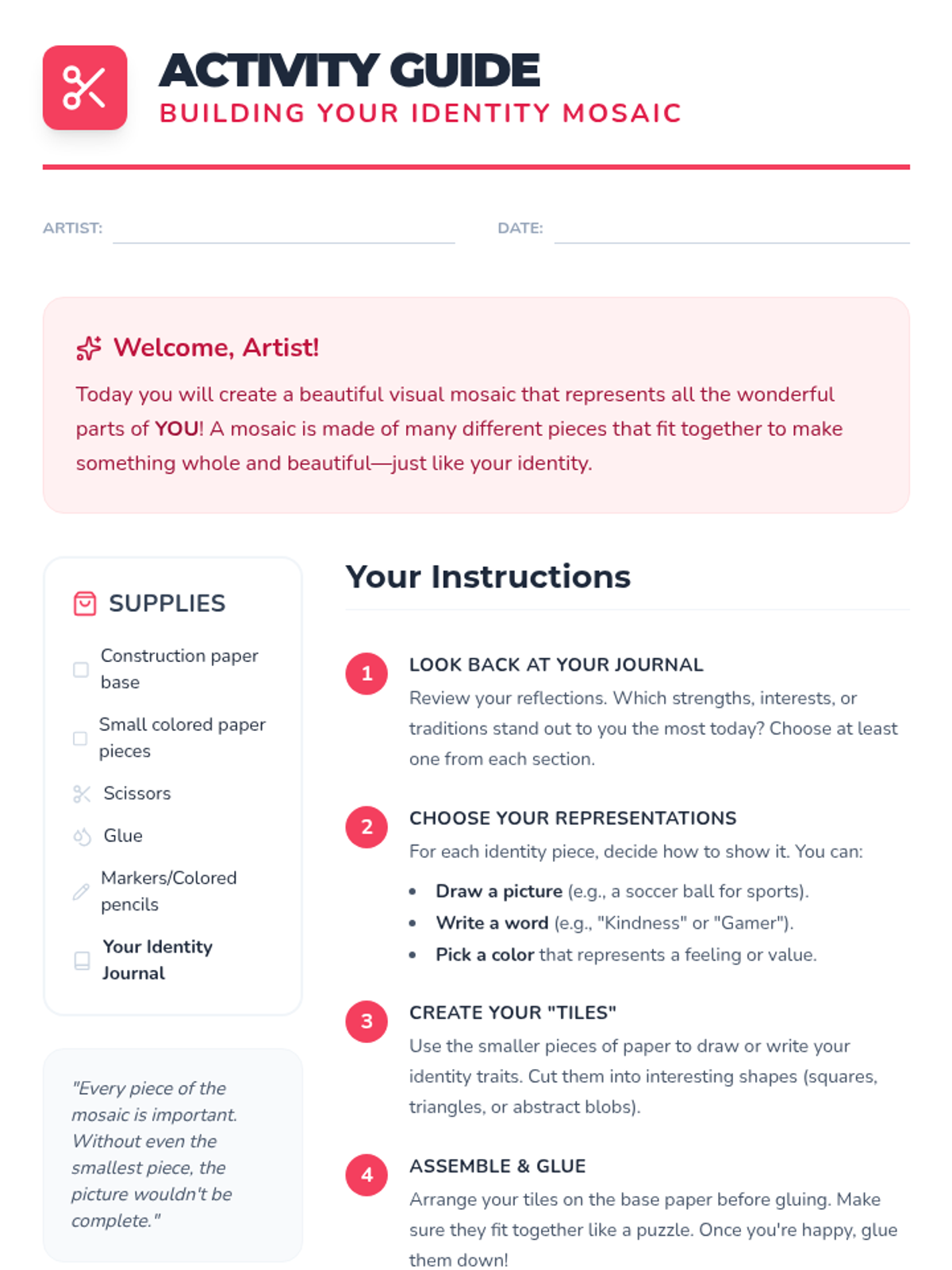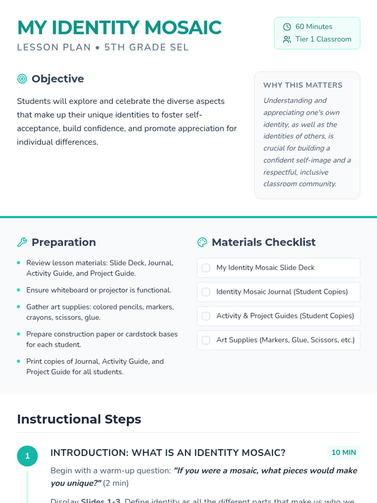 A 60-minute SEL lesson for 5th graders to explore their personal identity through the metaphor of a mosaic, culminating in a creative visual project.