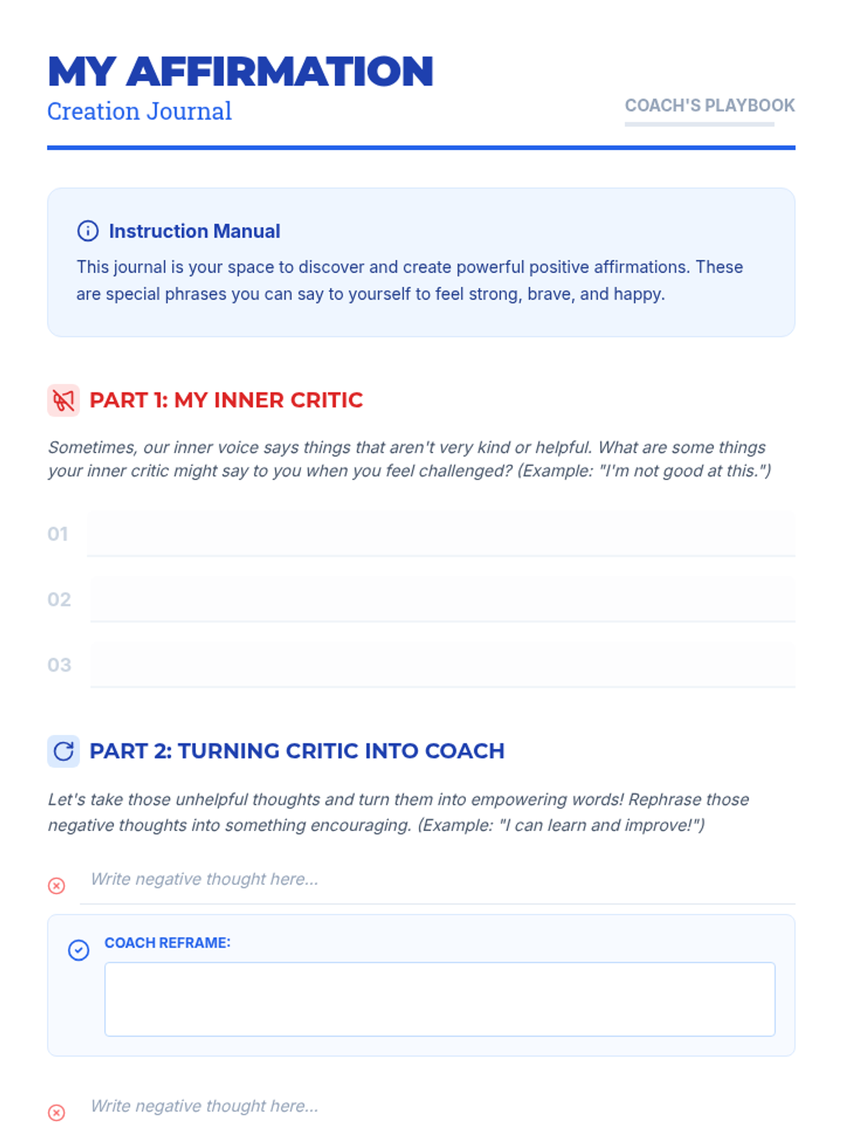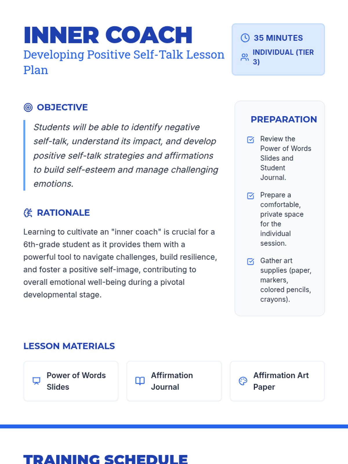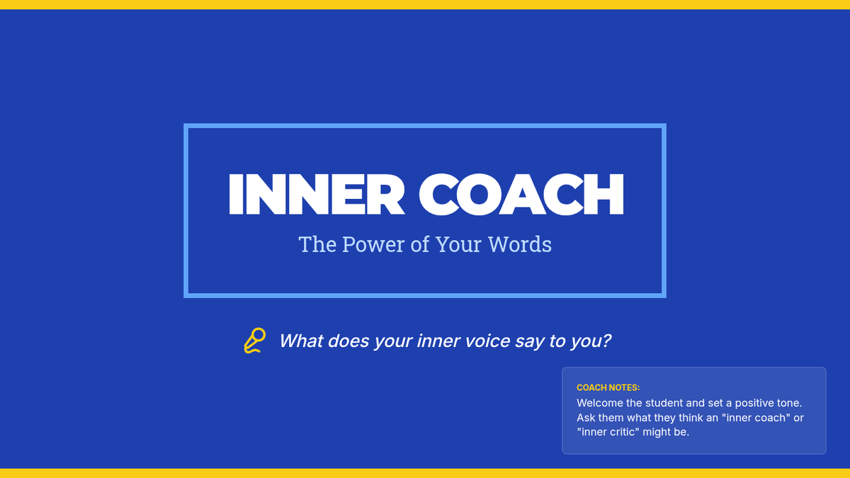 This Tier 3 individual lesson empowers 6th-grade students to develop positive self-talk and affirmations to manage negative thoughts and build self-esteem. Through the metaphor of an 'inner coach,' students learn to identify and reframe their inner critic.