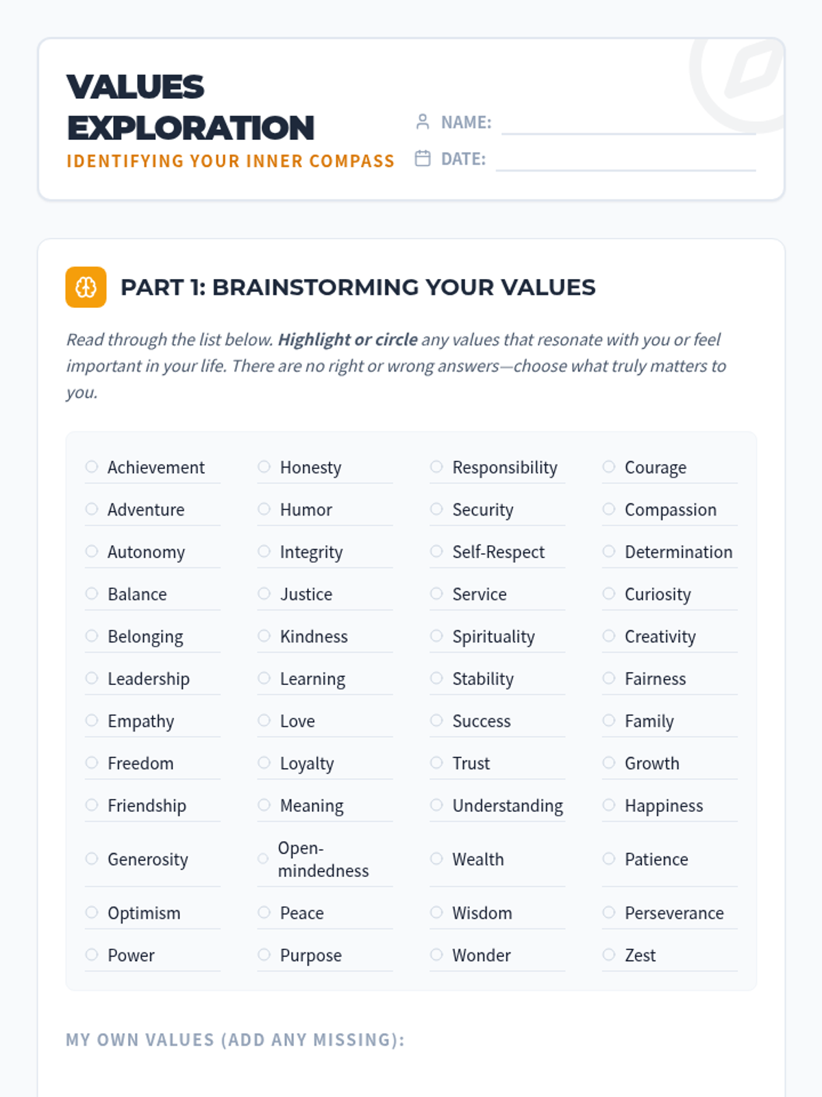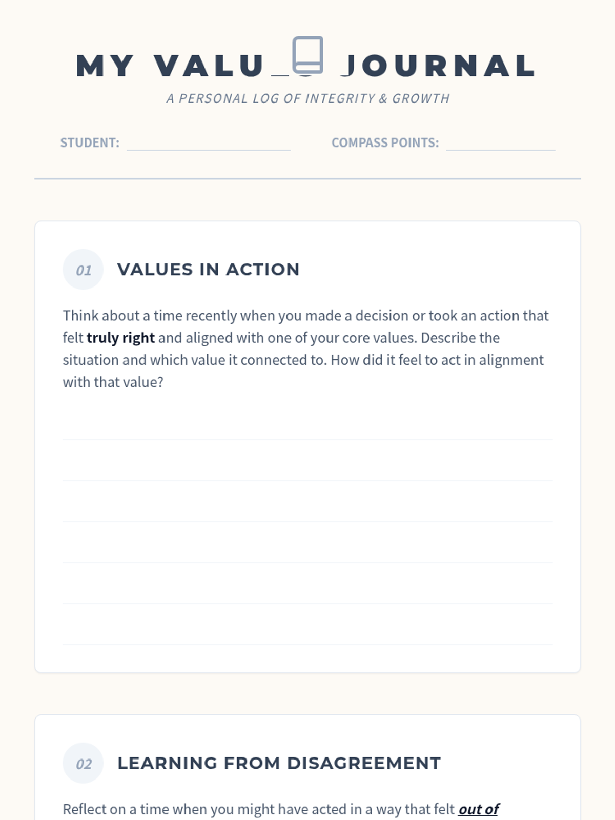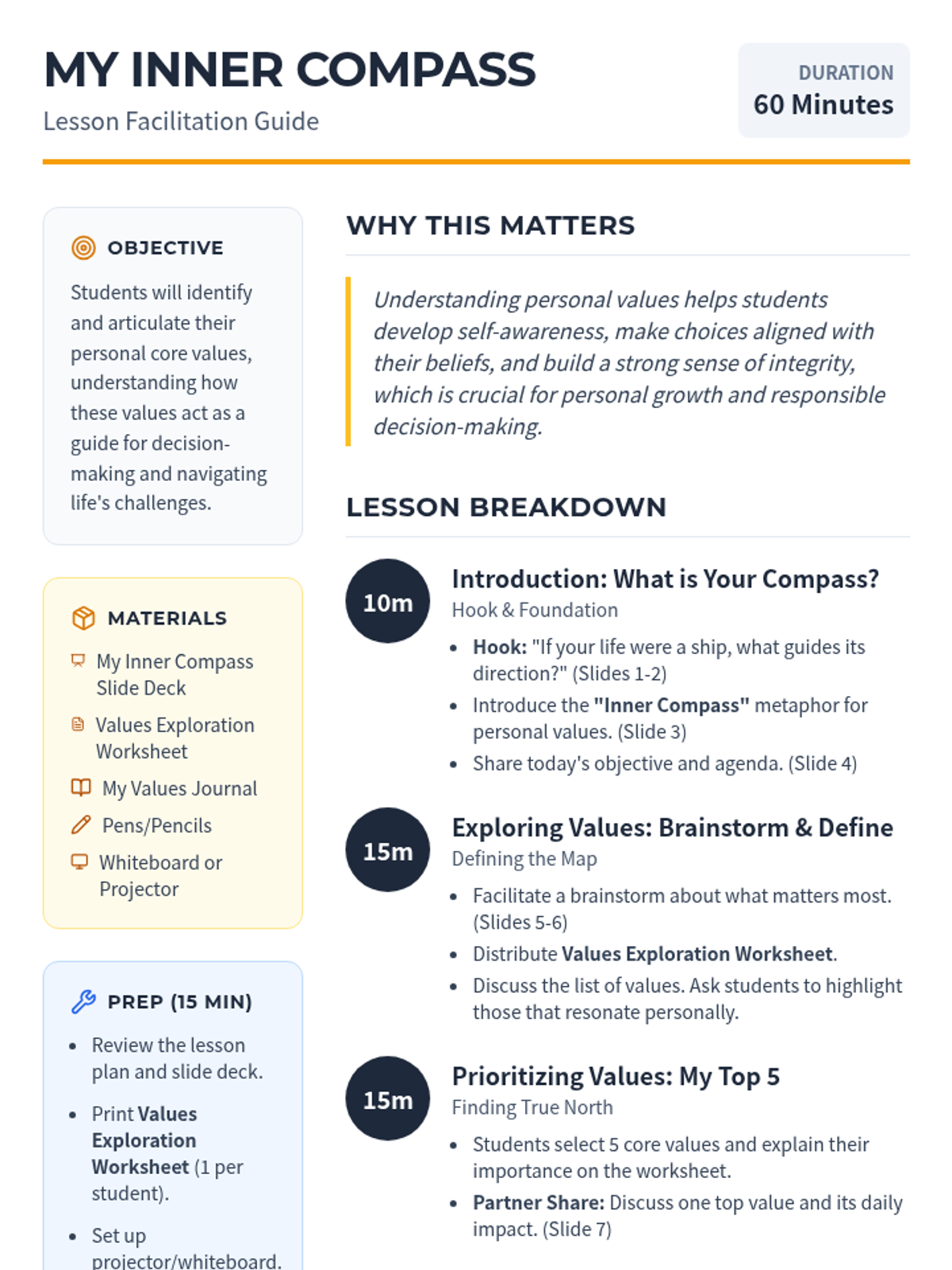 This lesson guides middle and high school students to identify and understand their core personal values, serving as an internal compass for decision-making and navigating challenges. Through reflective activities and group discussion, students will articulate what truly matters to them, fostering self-awareness and integrity.