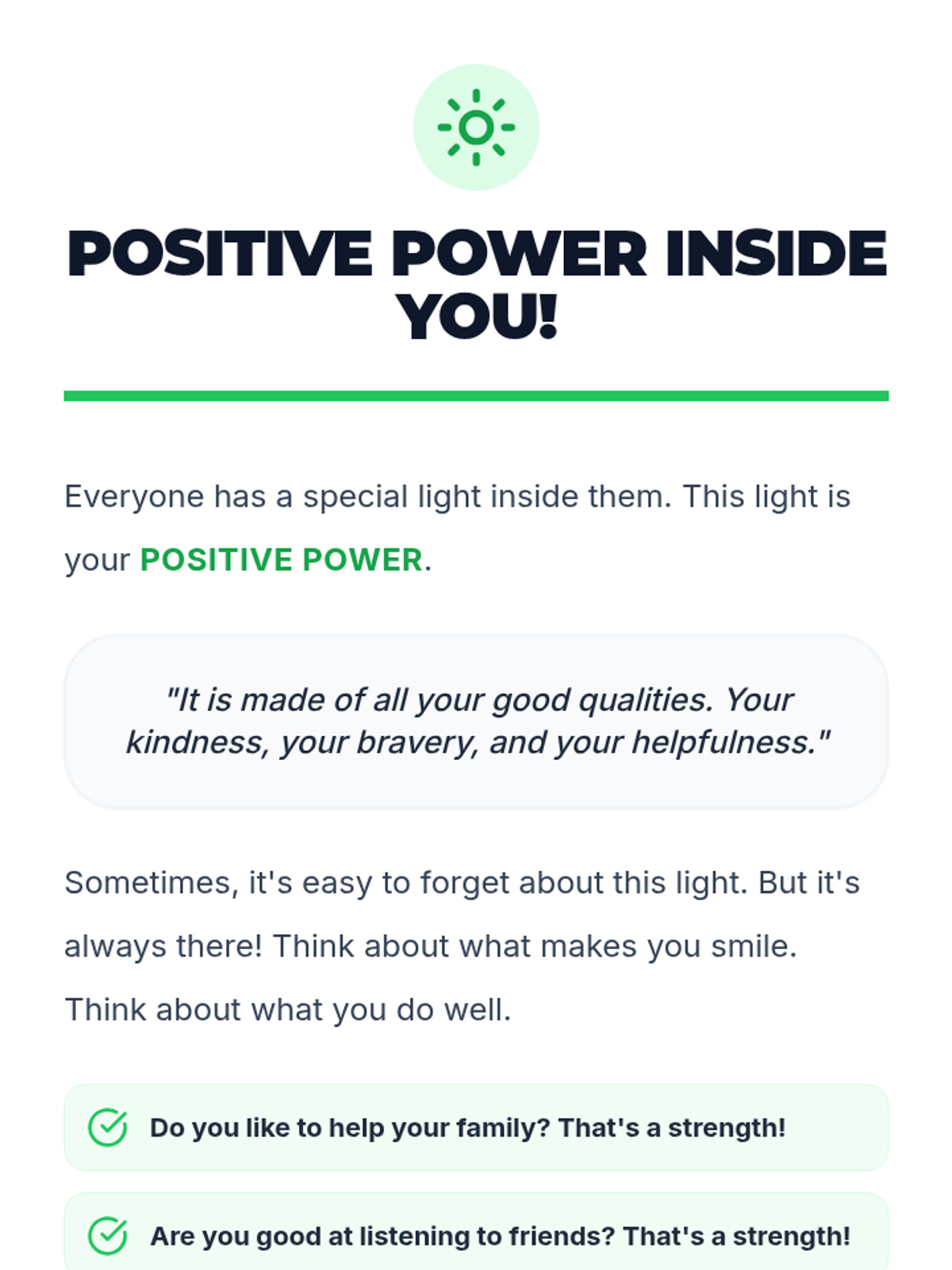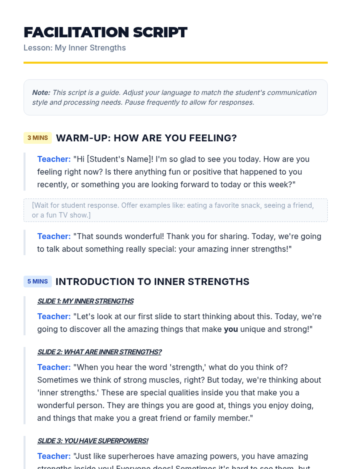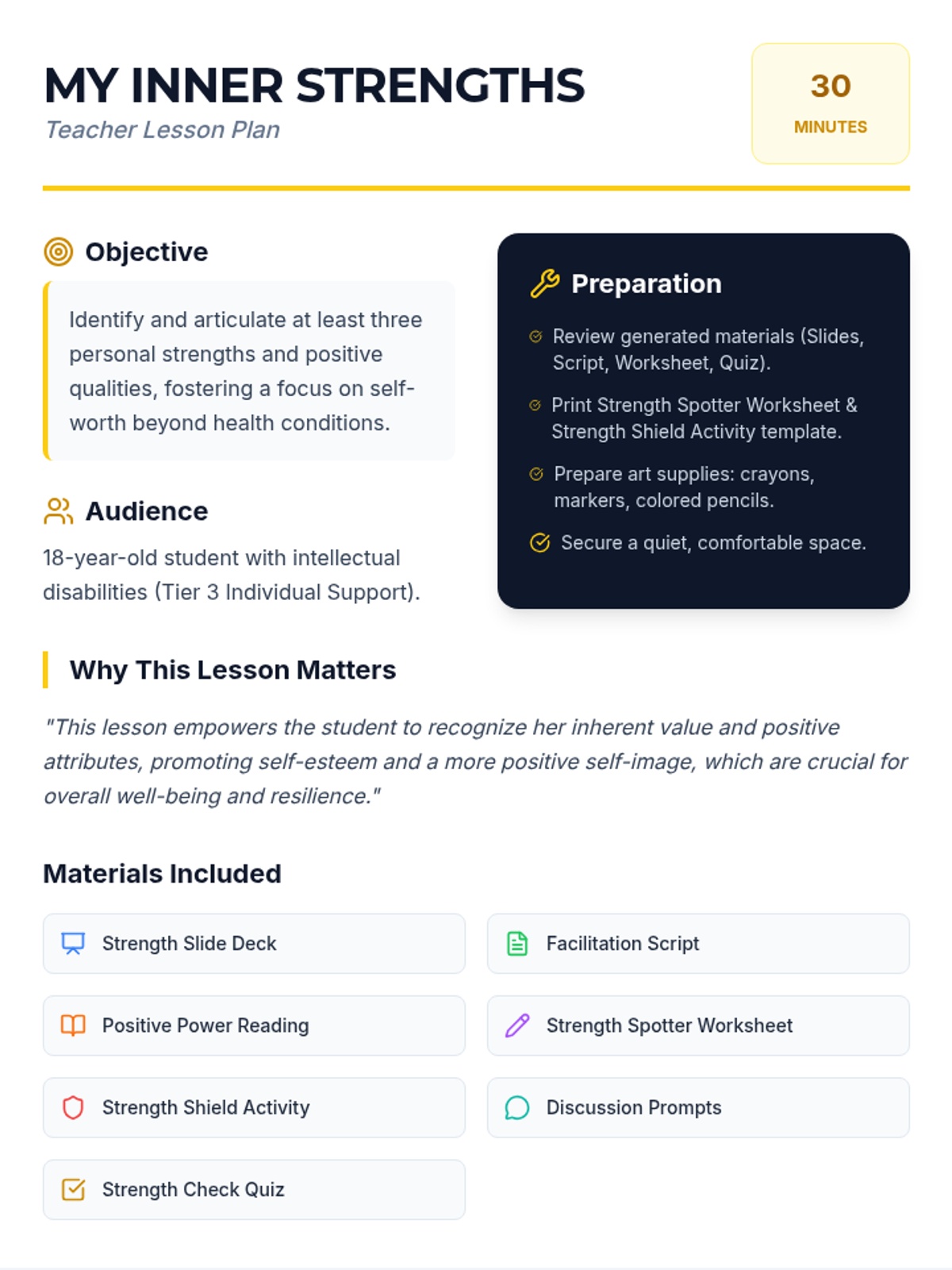 This 30-minute individual lesson for an 18-year-old student with intellectual disabilities focuses on identifying and appreciating personal strengths and positive qualities. Through guided discussion and creative activities, the student learns to shift focus away from health conditions and toward their unique 'inner superpowers'.