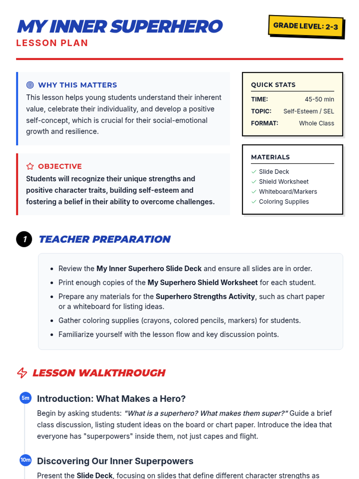 A self-esteem building lesson for 2nd and 3rd graders that uses a superhero metaphor to help students identify and celebrate their unique character strengths and positive traits.