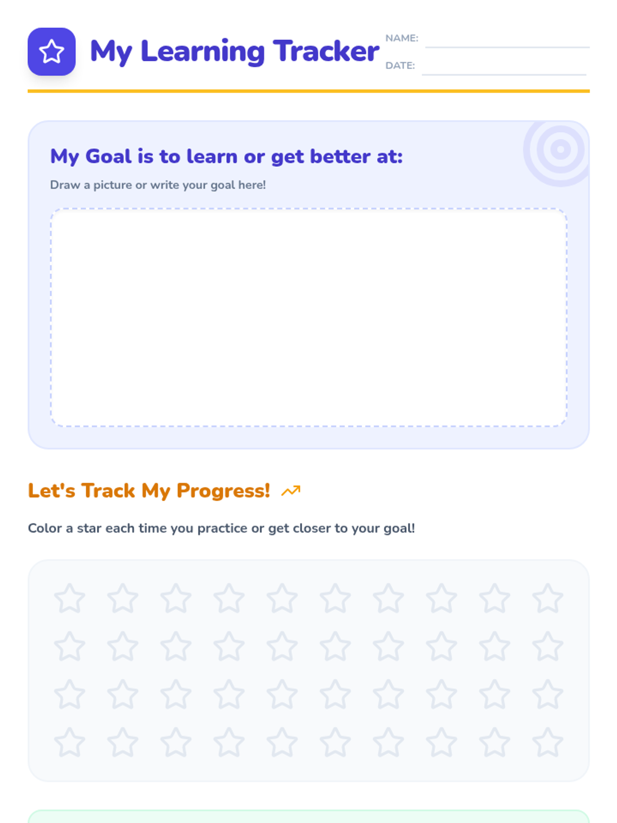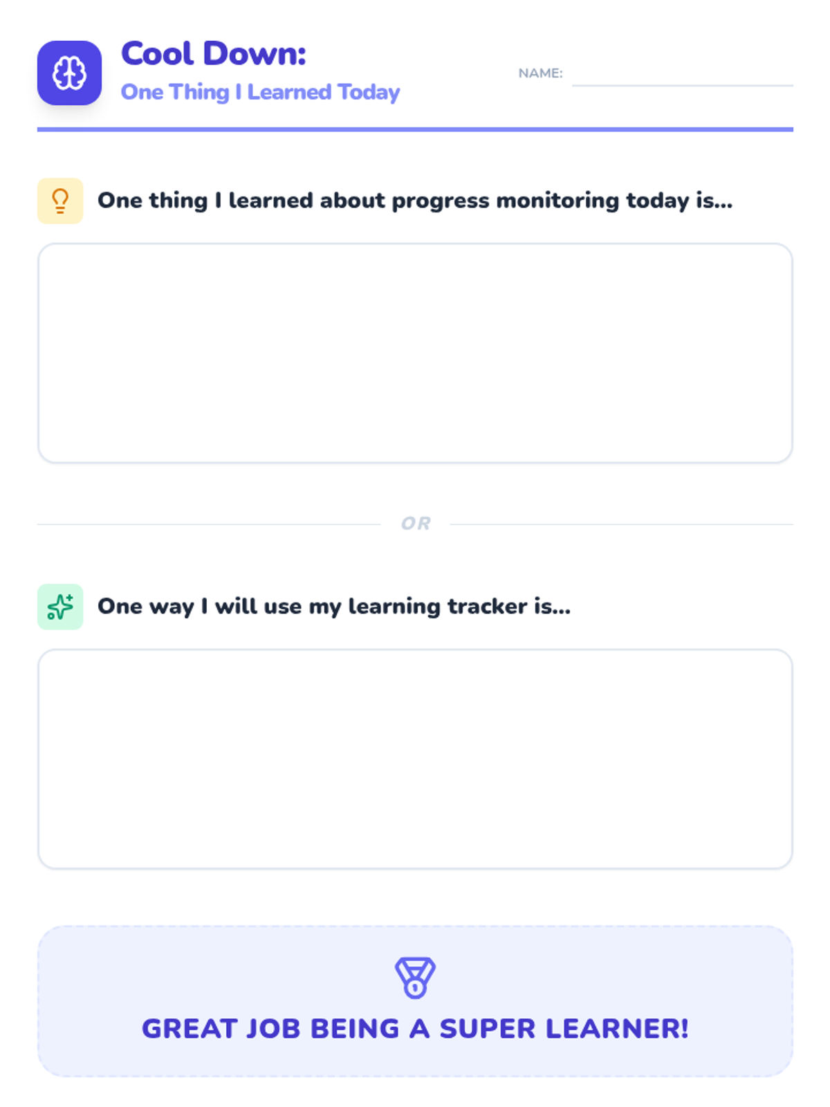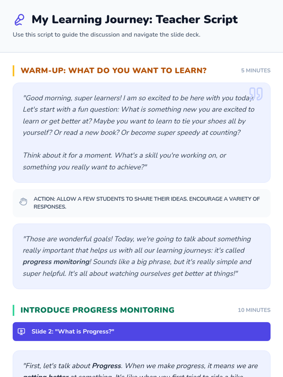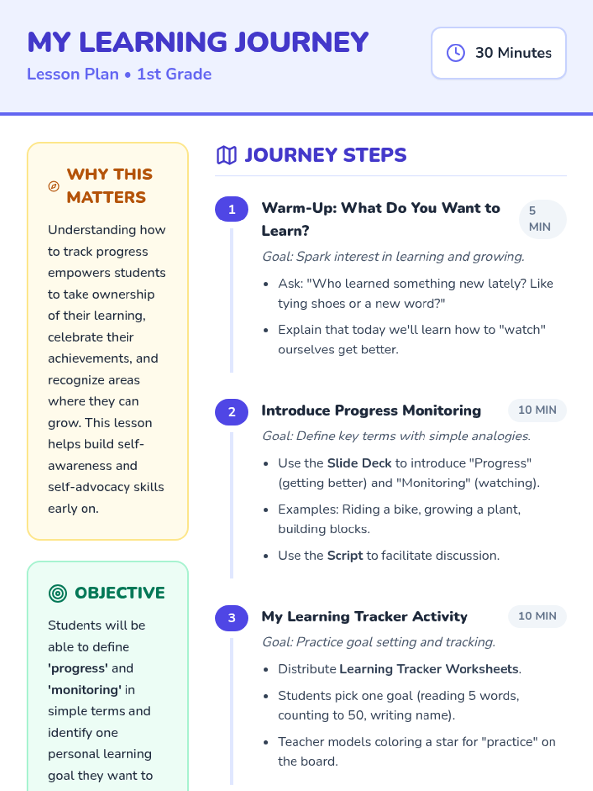 This 30-minute lesson introduces 1st-grade students to the concept of progress monitoring in a fun and accessible way. It helps them understand that learning is a journey and they can track their own growth, fostering a sense of ownership and motivation.