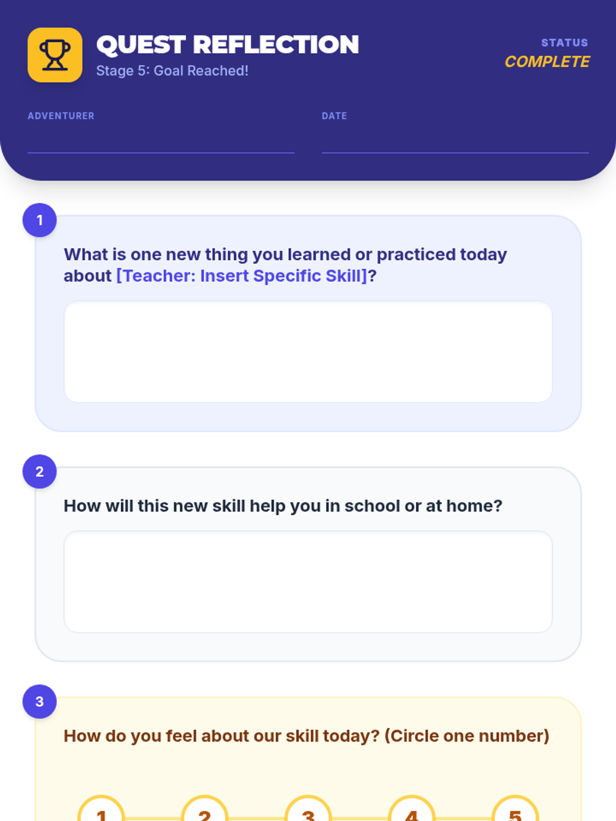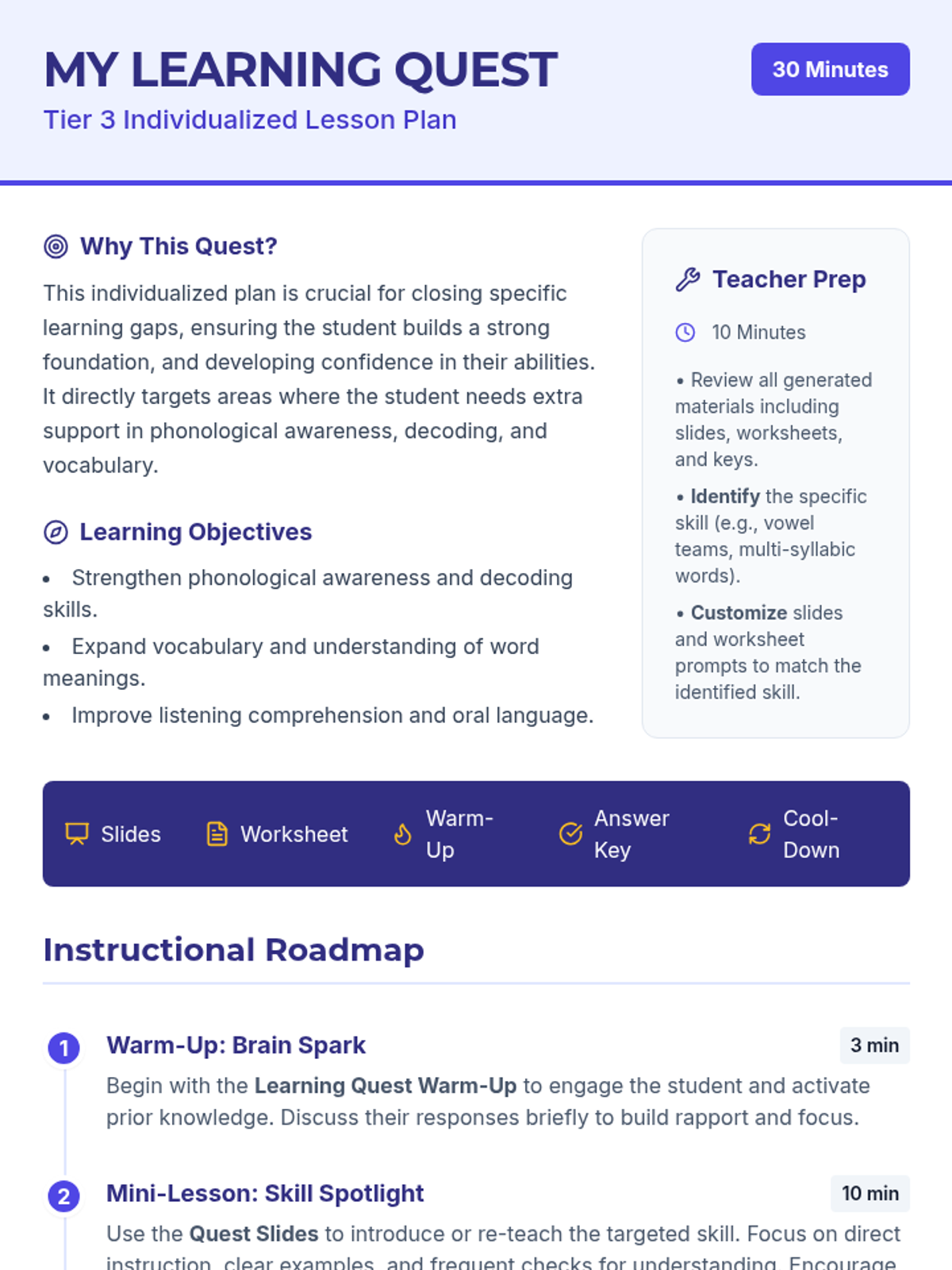An individualized Tier 3 learning plan for 3rd-grade students focused on specific literacy skills like decoding, vocabulary, and comprehension through a guided 'quest' format.