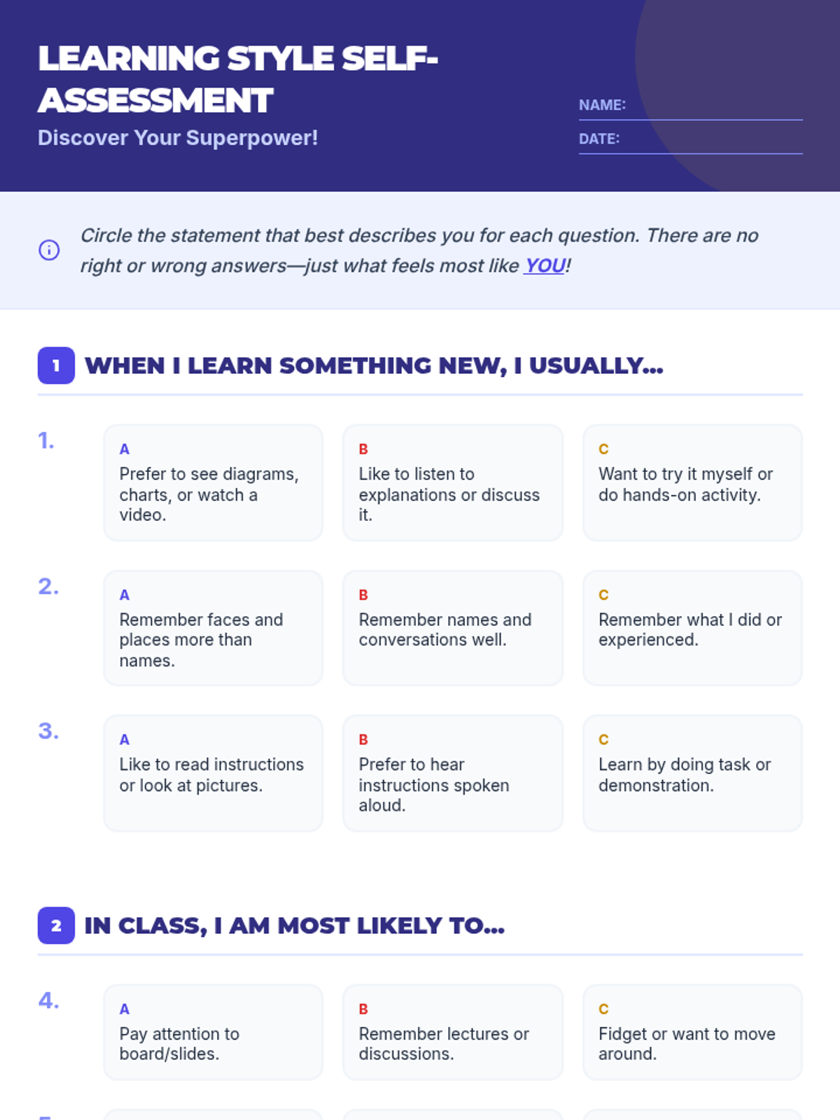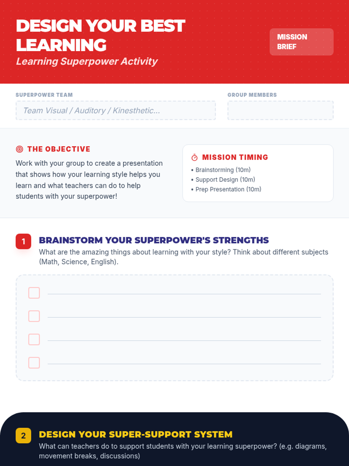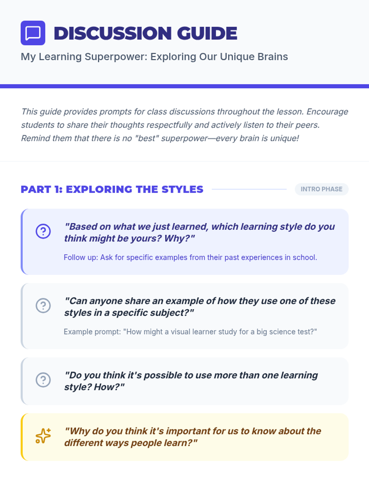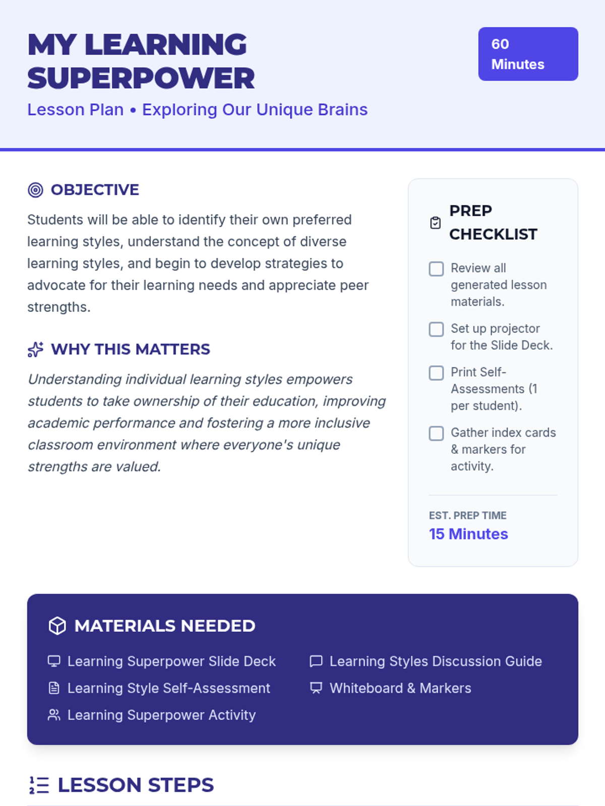 This lesson introduces 6th-grade students to the concept of diverse learning styles (Visual, Auditory, Kinesthetic), helping them identify their preferred processing methods and develop self-advocacy strategies.