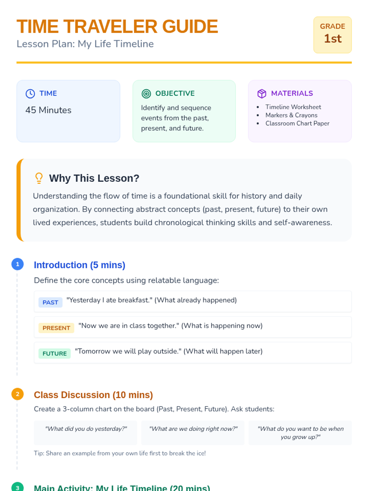 Students explore the concepts of past, present, and future by creating personal timelines. This hands-on lesson helps 1st graders practice sequencing and understanding the flow of time through drawing and discussion.