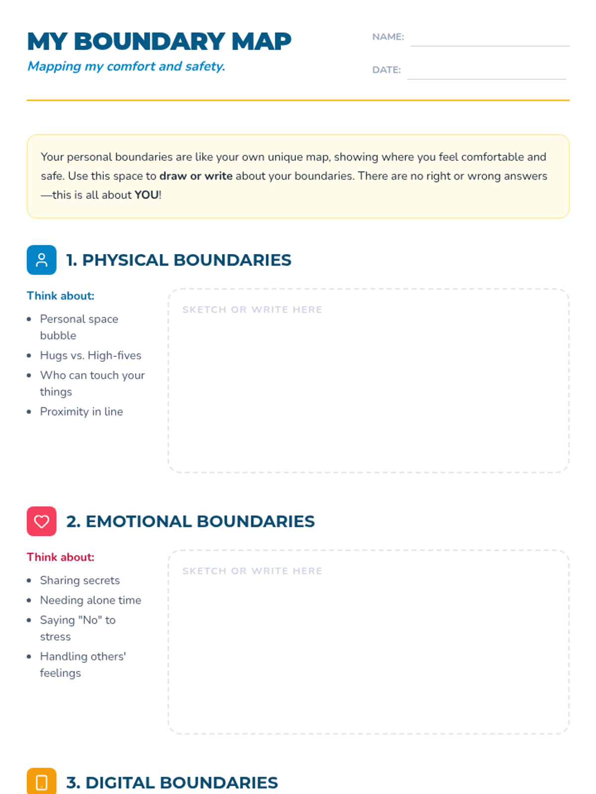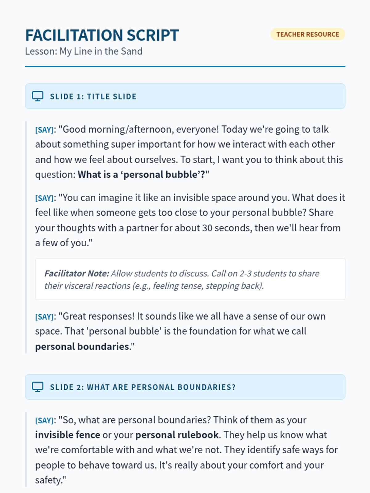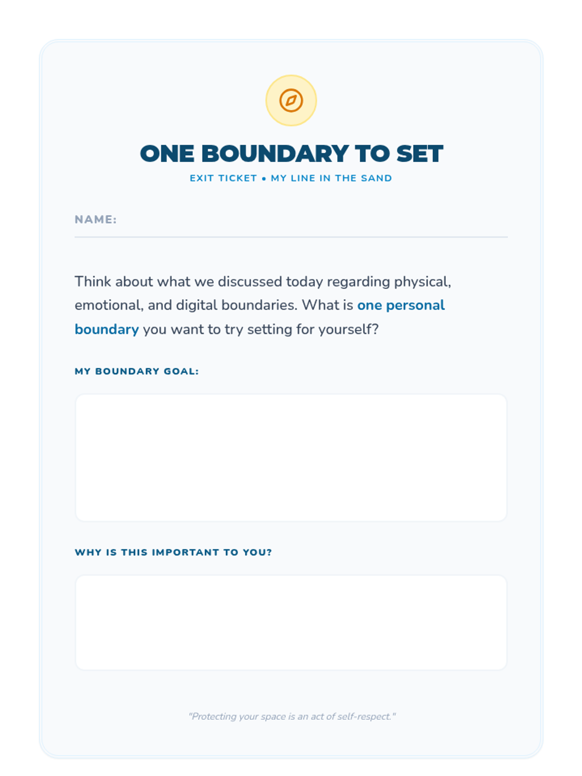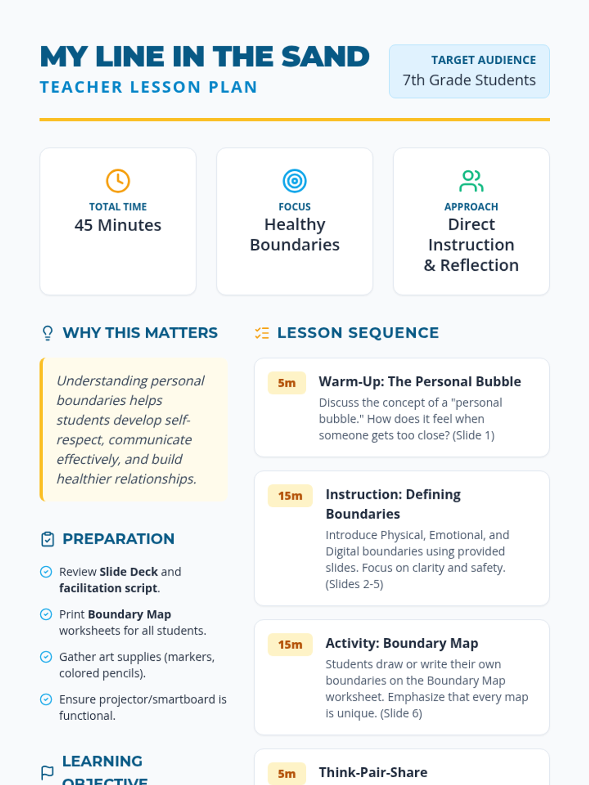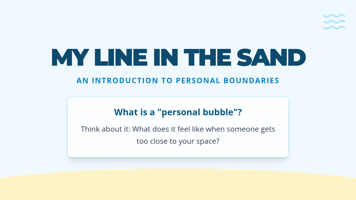 A 45-minute lesson for 7th graders on identifying and communicating personal physical, emotional, and digital boundaries using a 'line in the sand' metaphor.