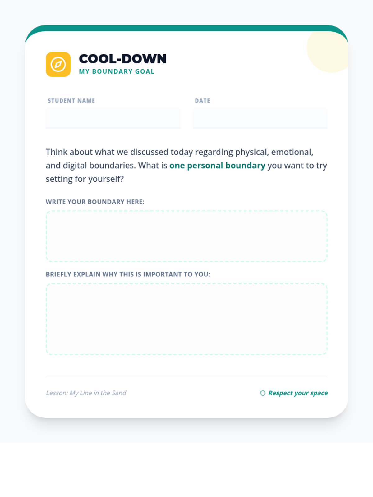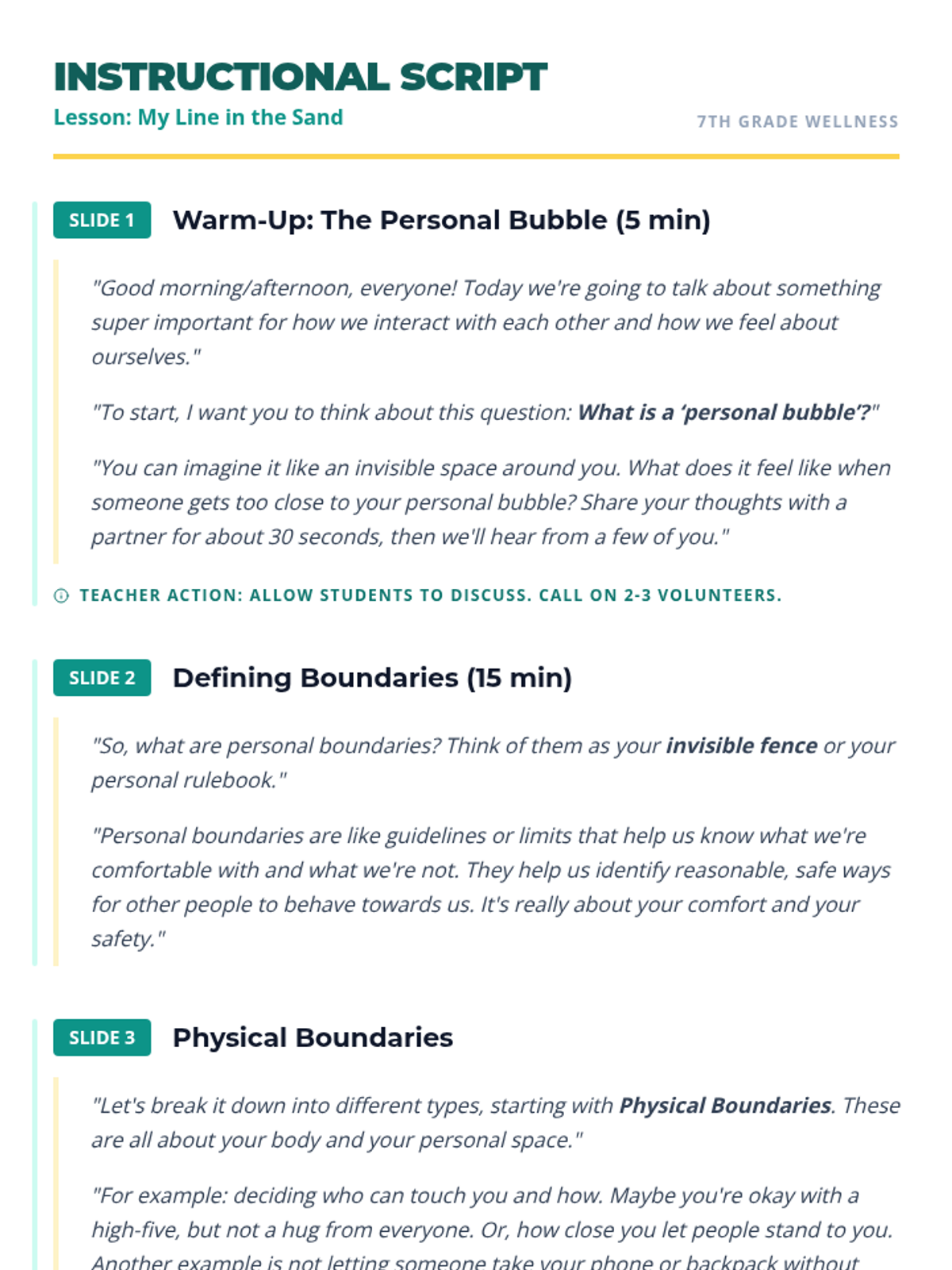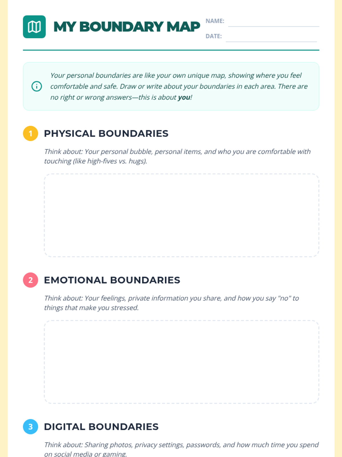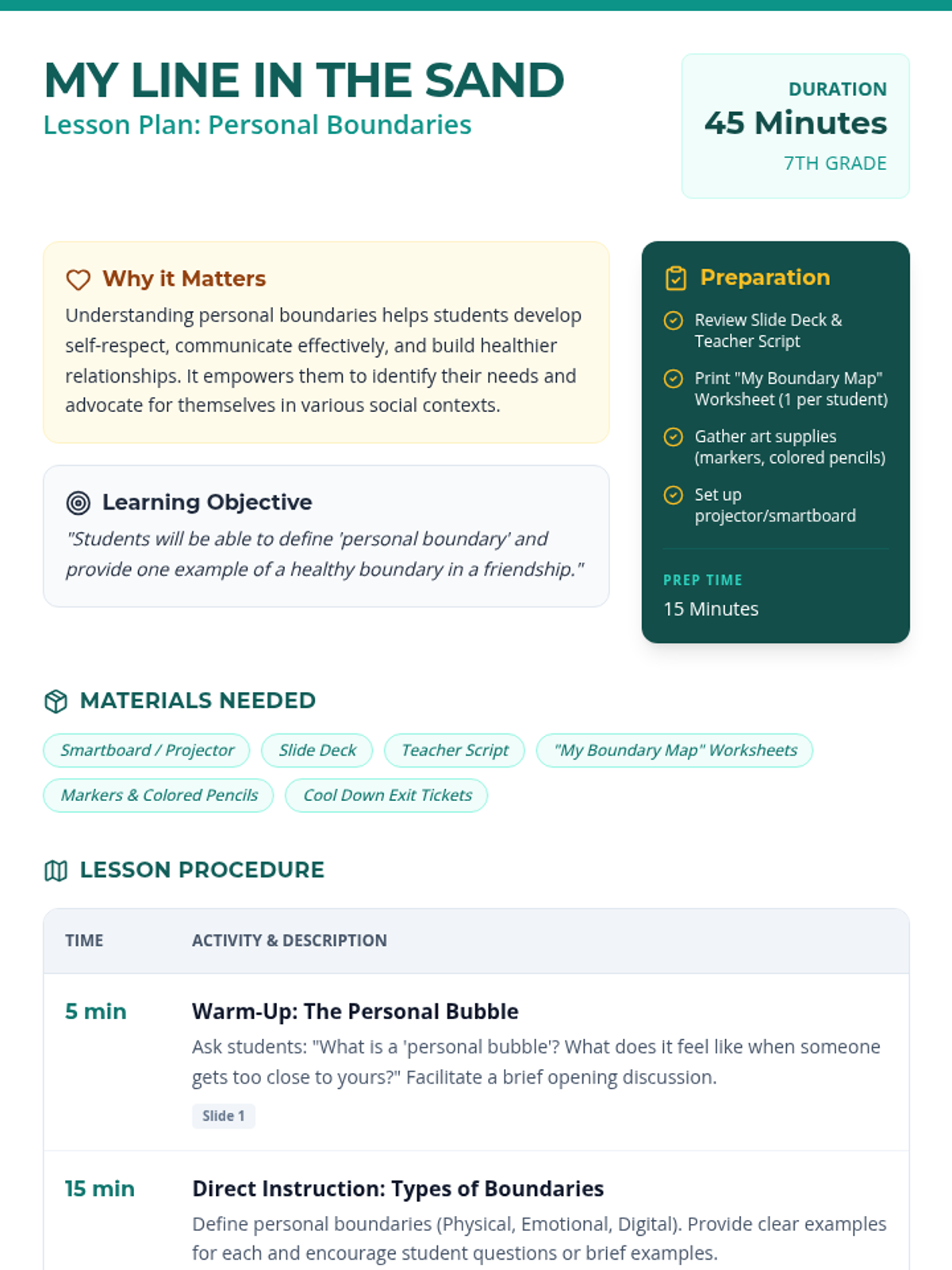 A 45-minute lesson for 7th-grade students introducing the concept of personal boundaries (physical, emotional, and digital) through discussion and creative mapping.