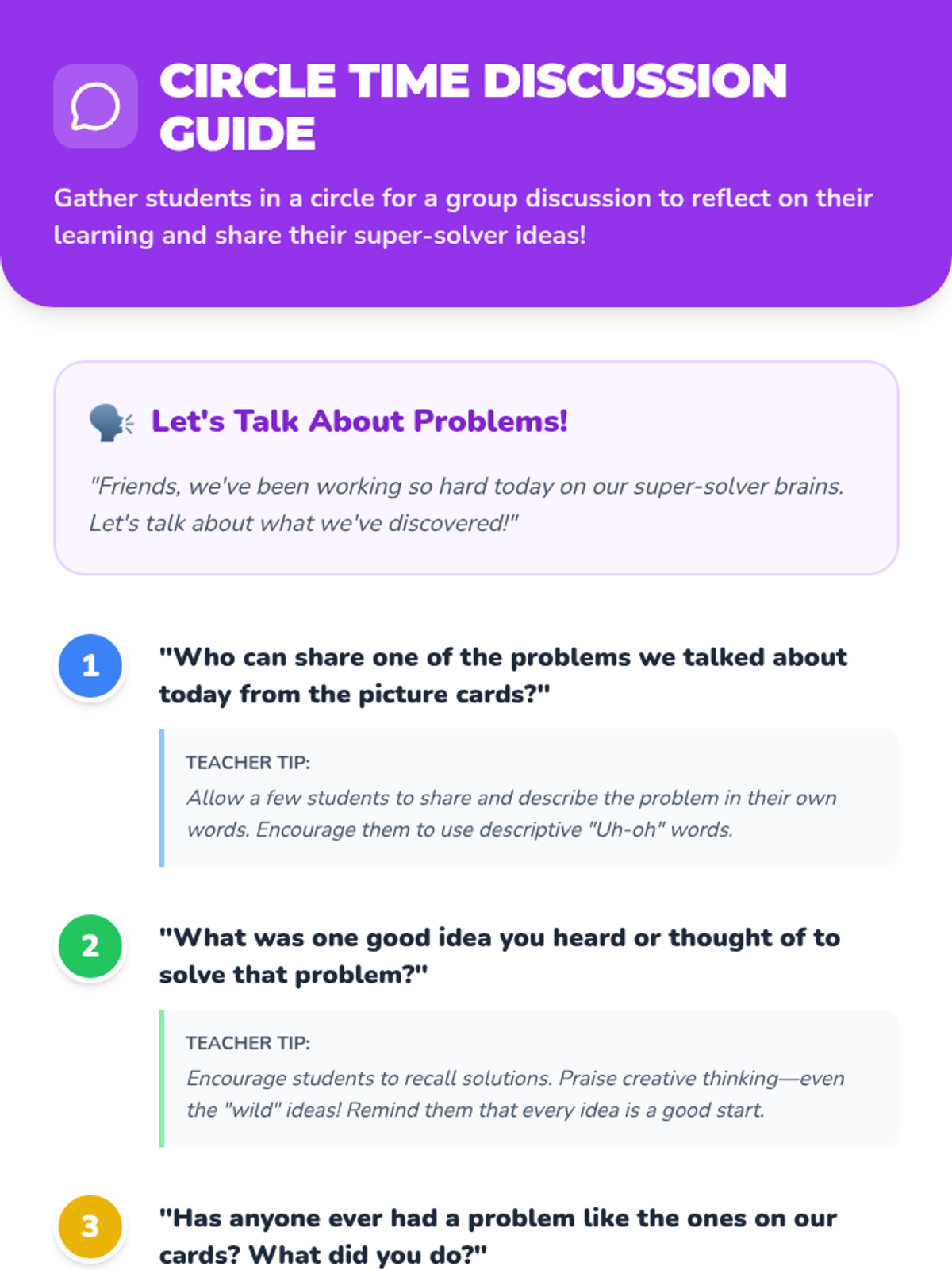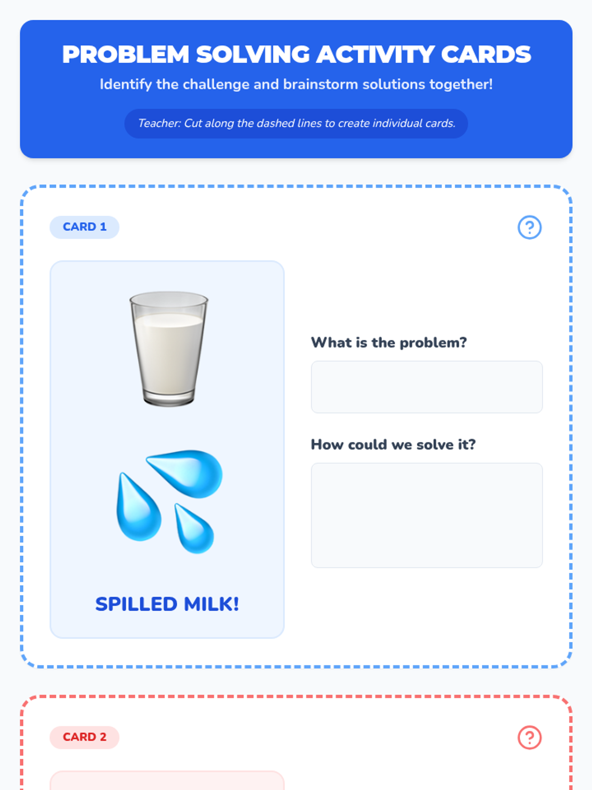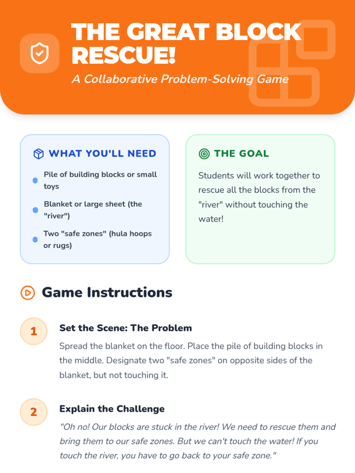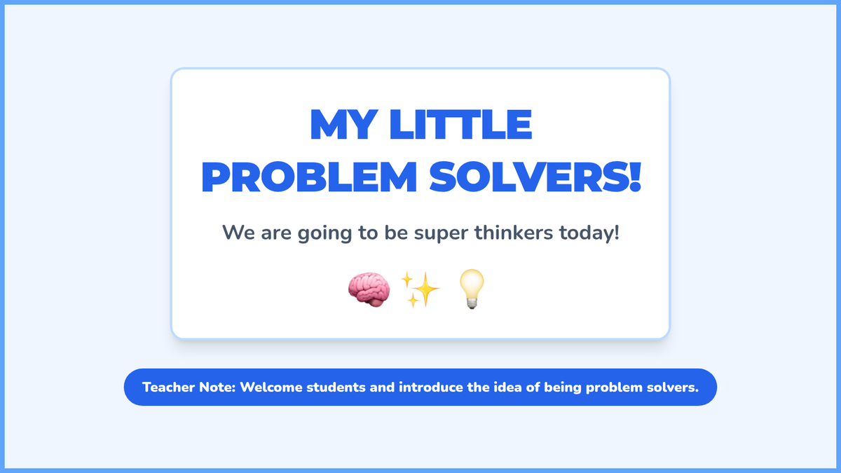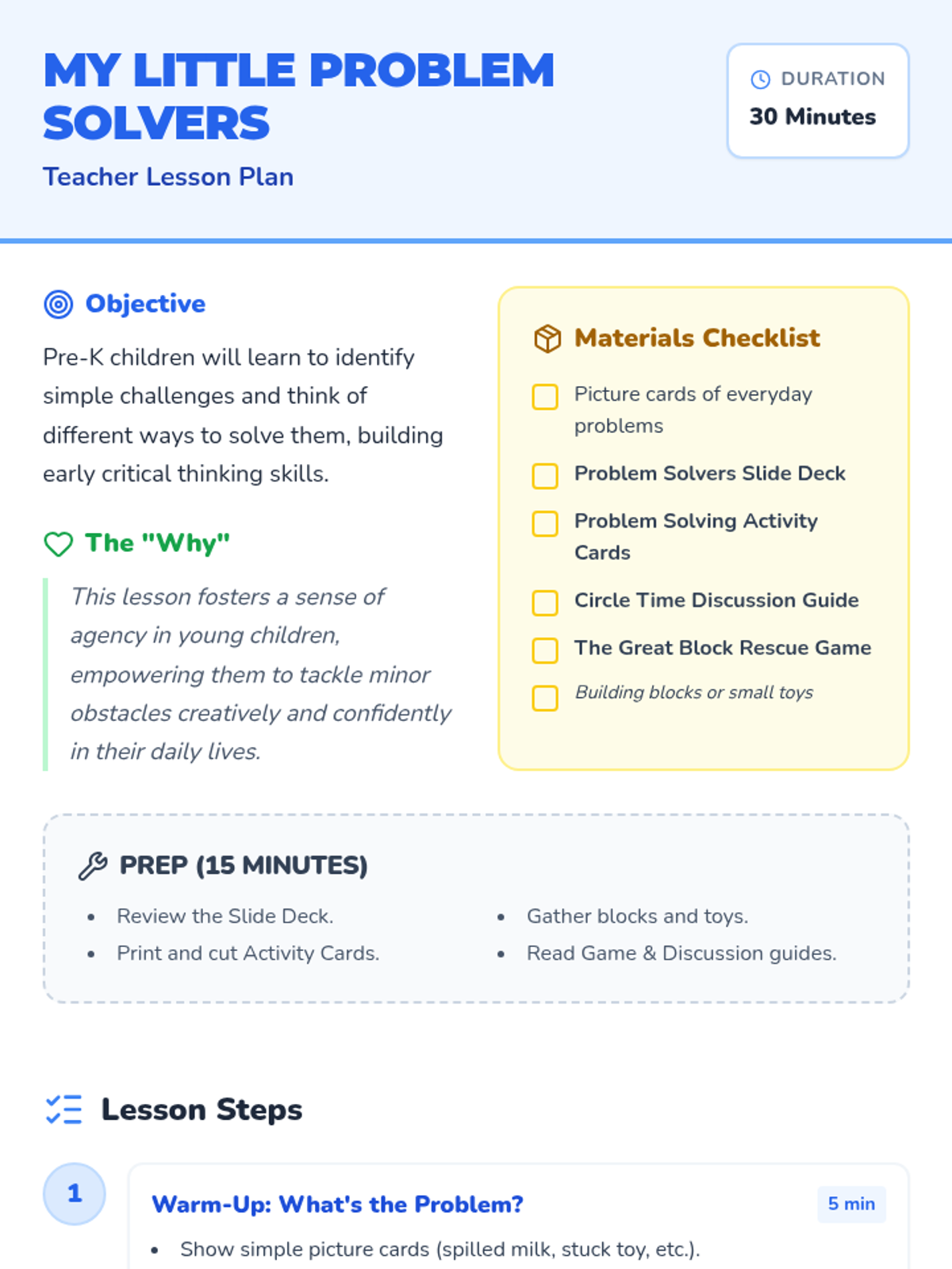 A Pre-K lesson focused on identifying simple challenges and brainstorming creative solutions through interactive slides, activity cards, and a collaborative rescue game.