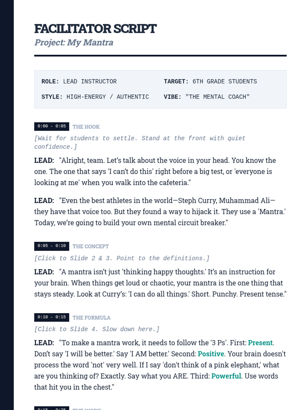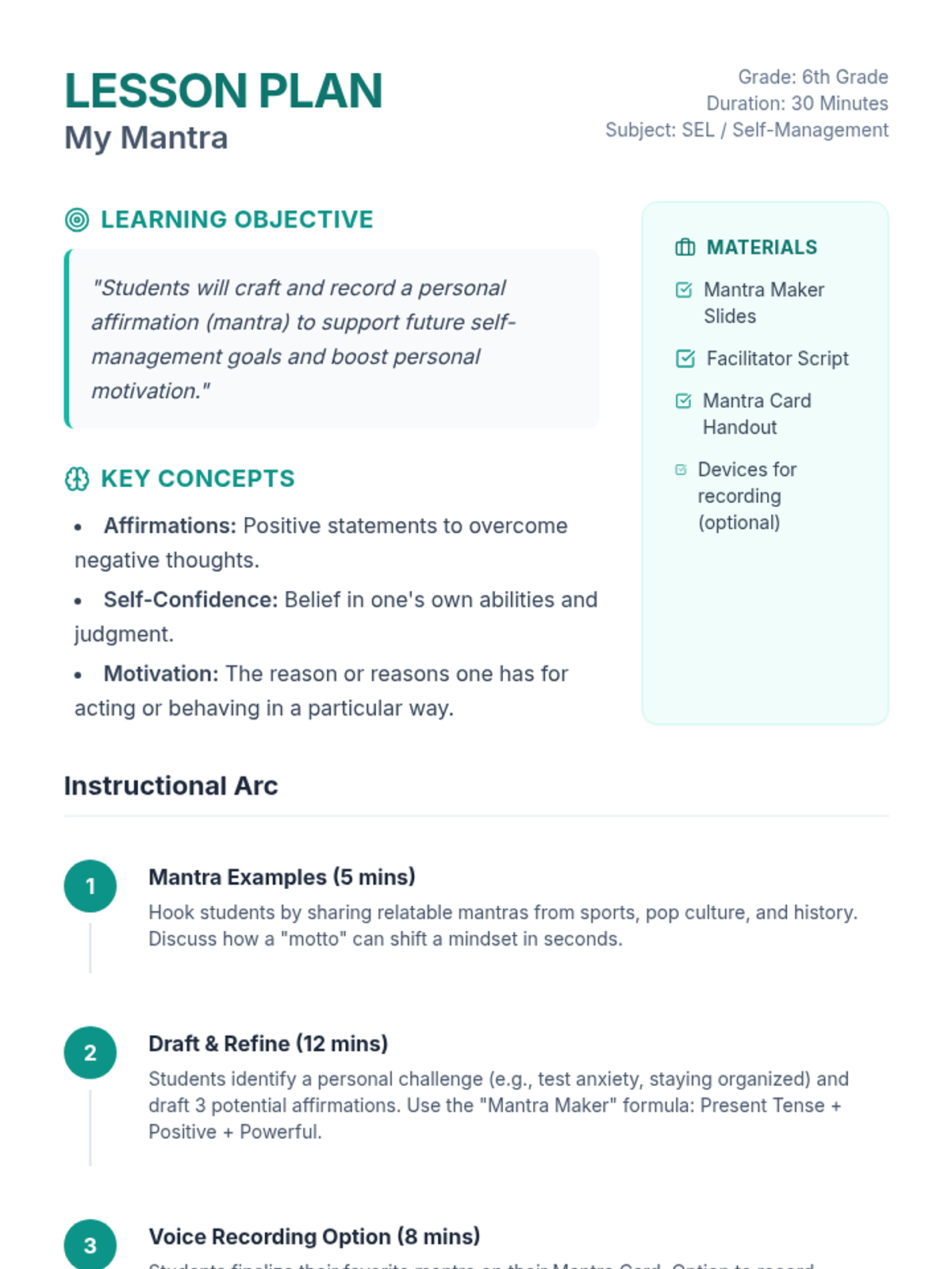 A 30-minute social-emotional learning lesson where 6th-grade students explore the power of affirmations and craft a personal 'mantra' to boost self-confidence and motivation for future self-management goals.