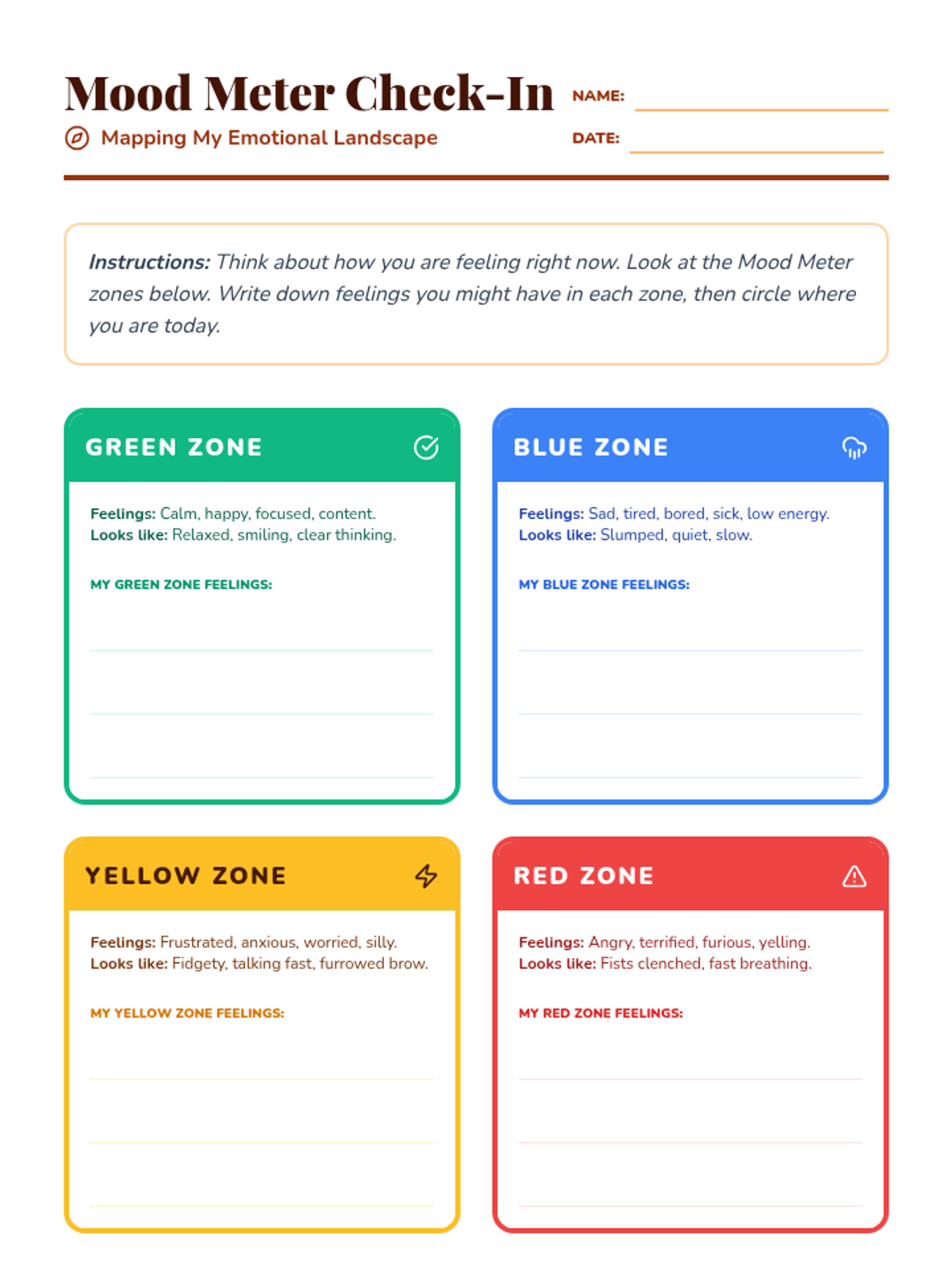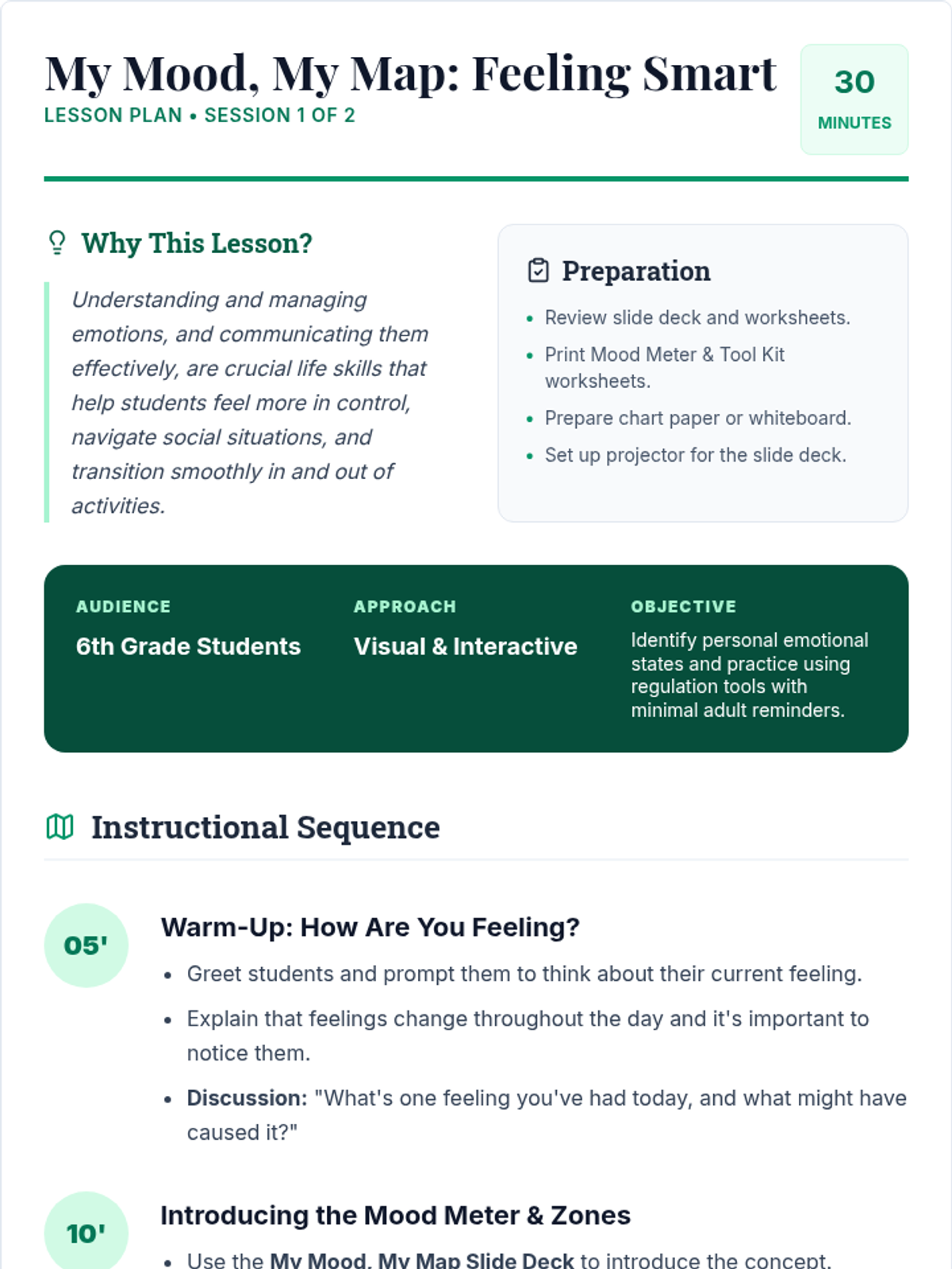 A 30-minute group lesson for 6th-grade students with Autism focused on identifying emotional states using a Mood Meter and building a personal self-regulation tool kit. This session emphasizes that all feelings are okay and provides practical strategies for navigating between different emotional zones.