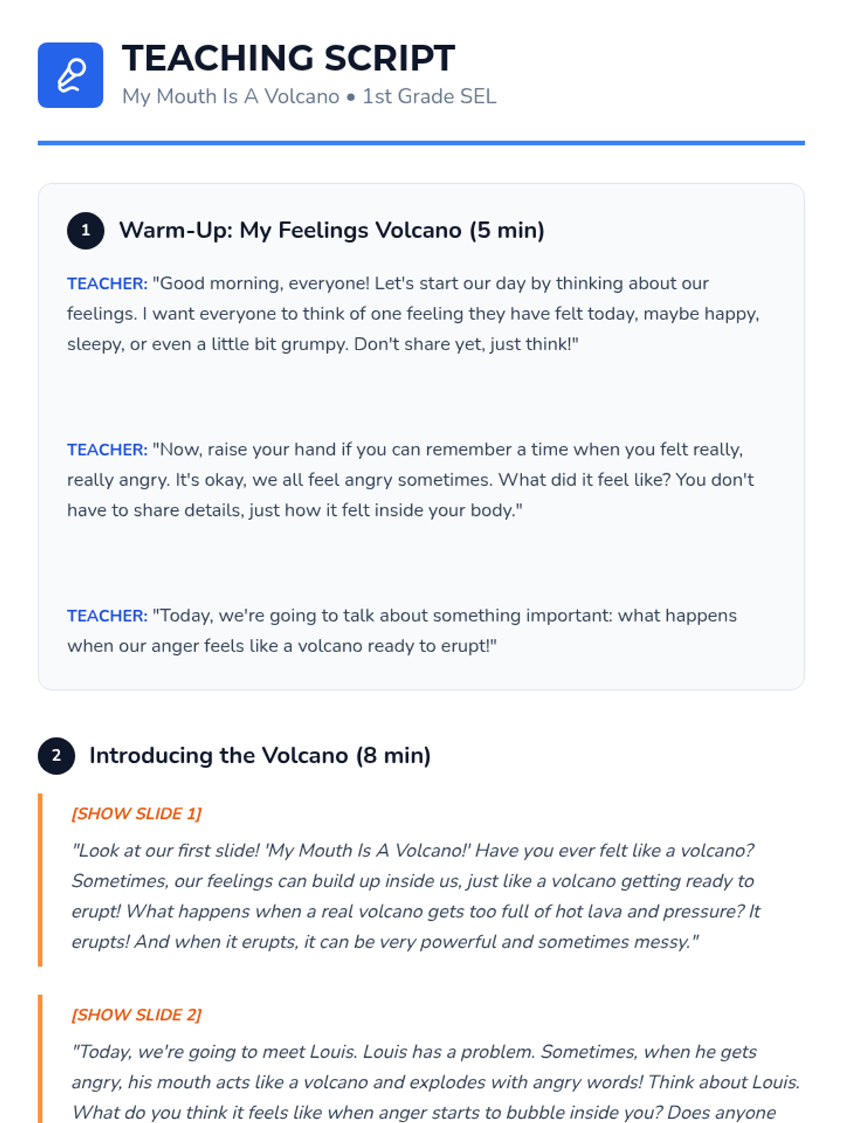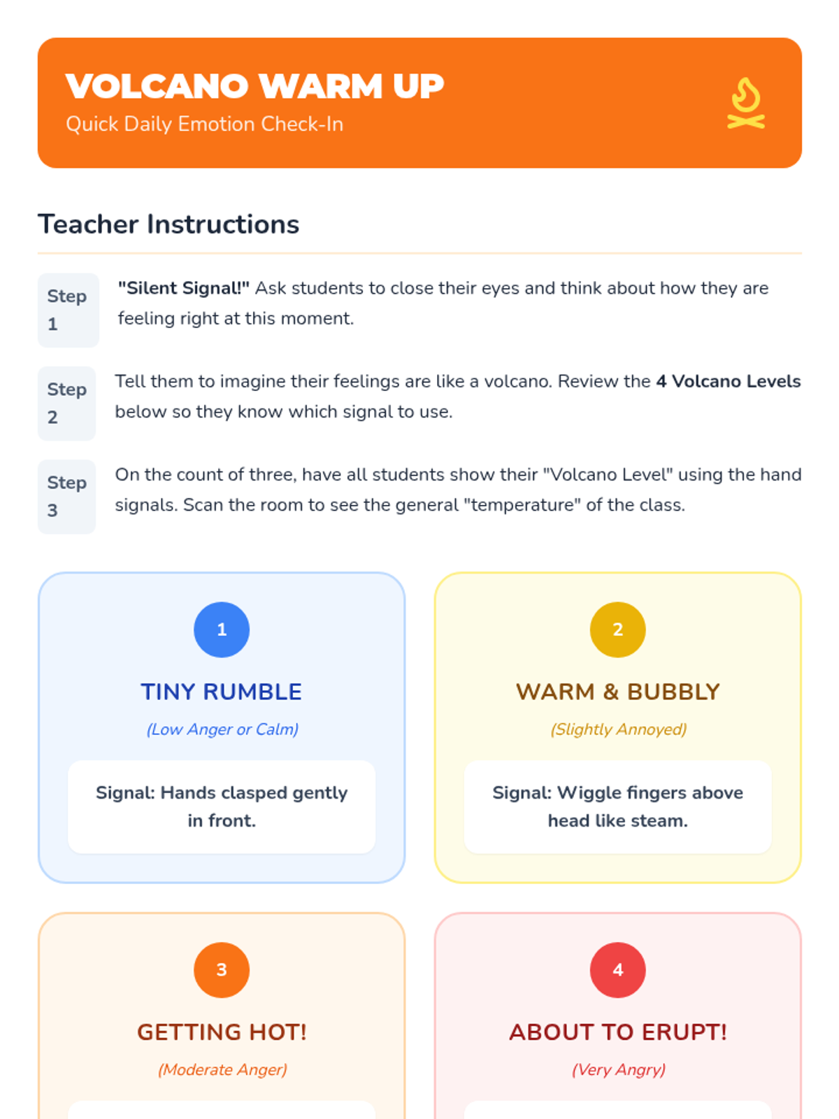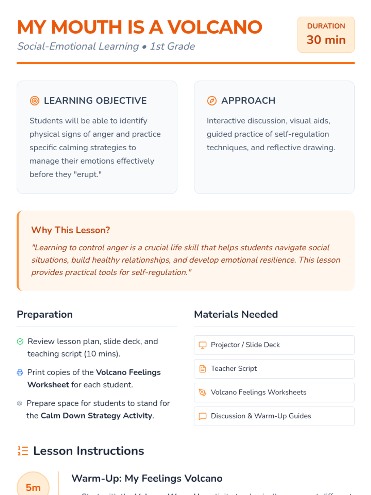 A Tier 1 social-emotional learning lesson for 1st graders using a volcano metaphor to help students identify physical signs of anger and learn self-regulation strategies.
