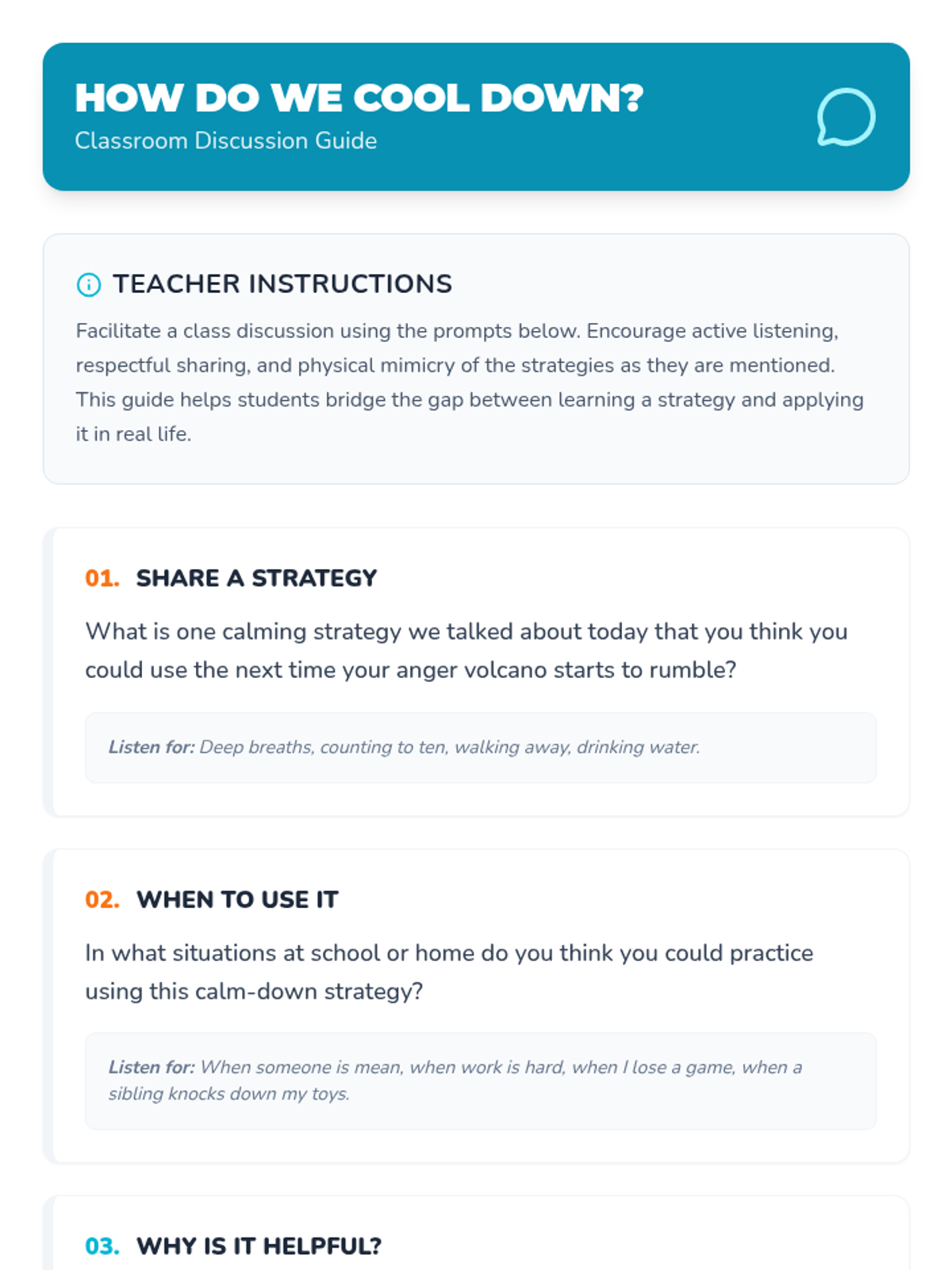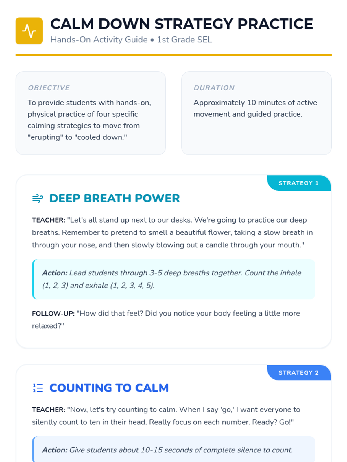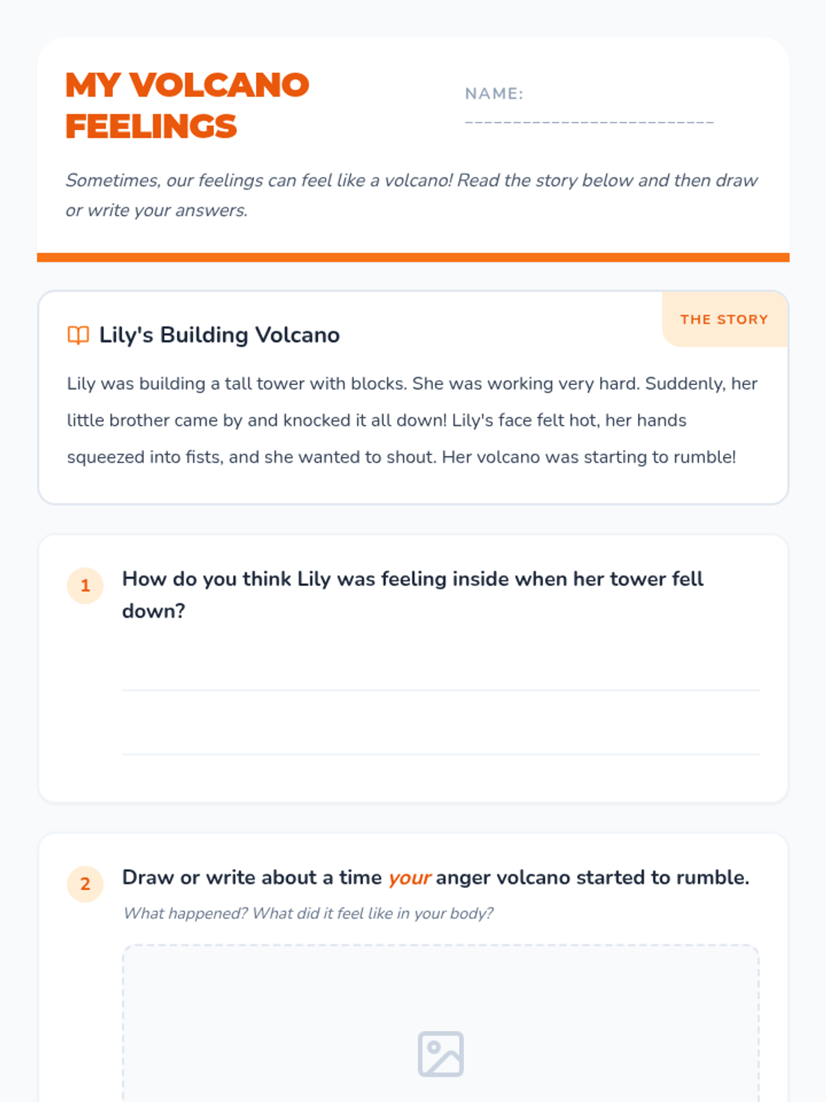 A Tier 1 social-emotional learning lesson for 1st graders using a volcano metaphor to help students identify physical signs of anger and learn self-regulation strategies.