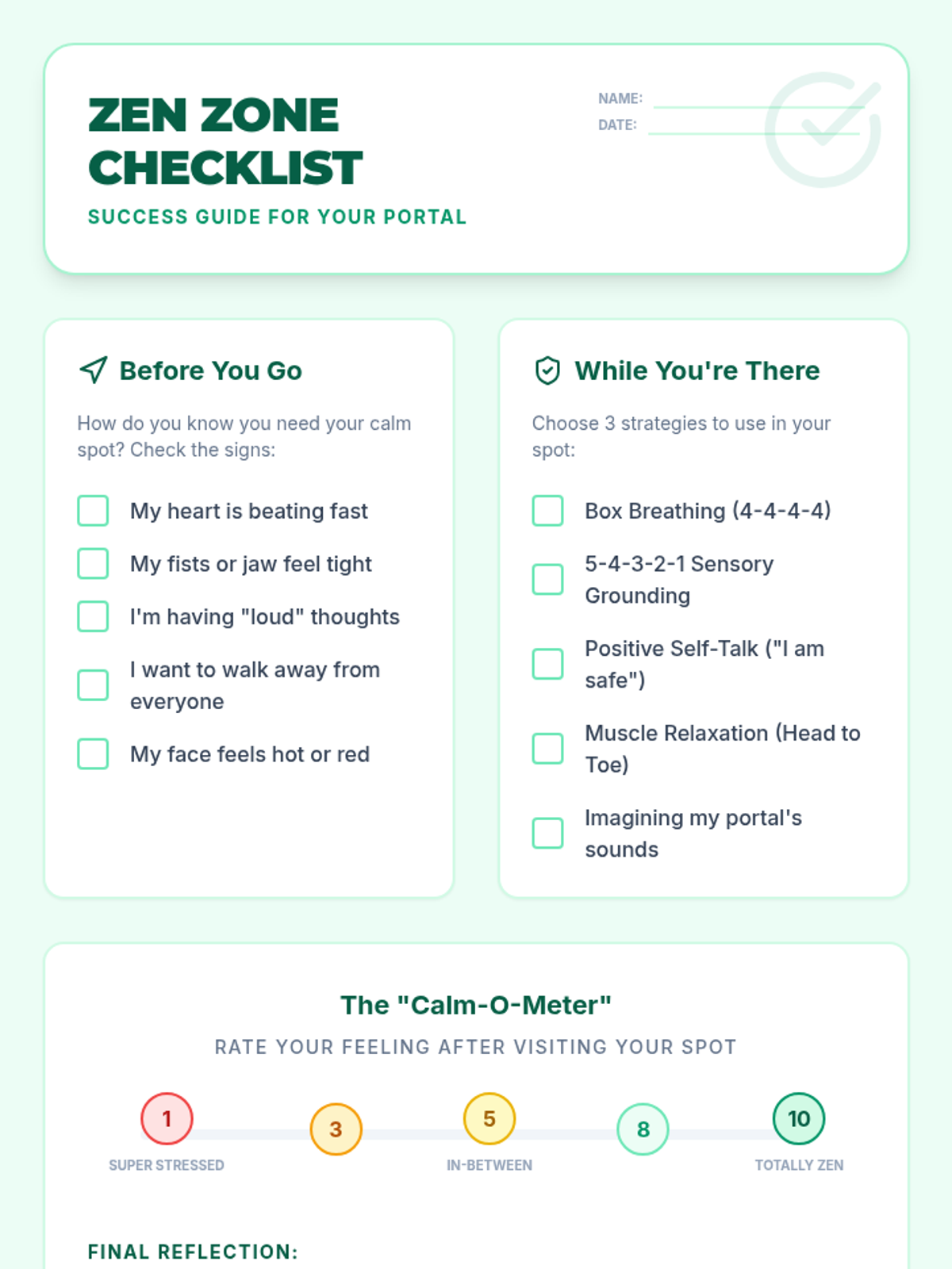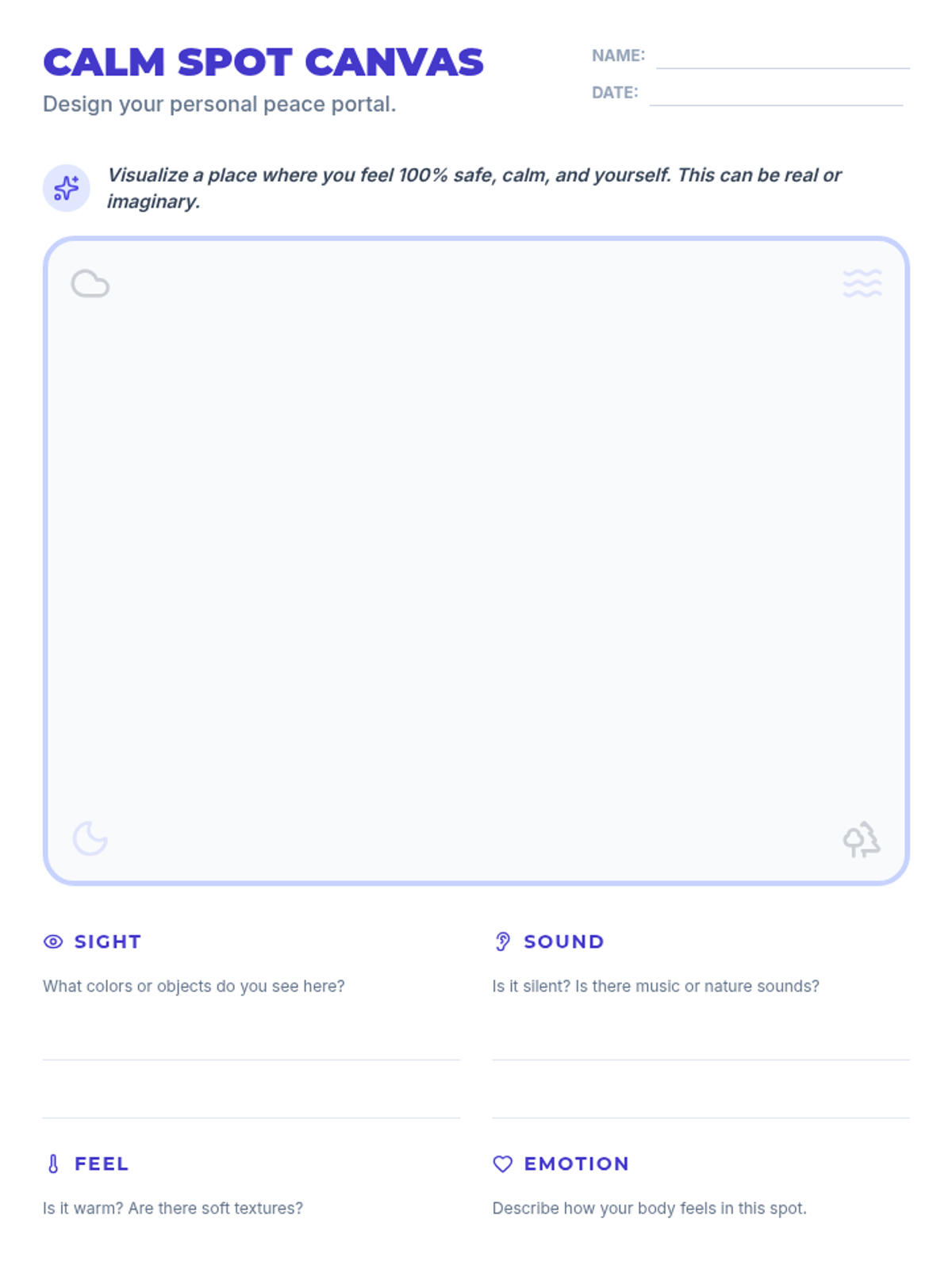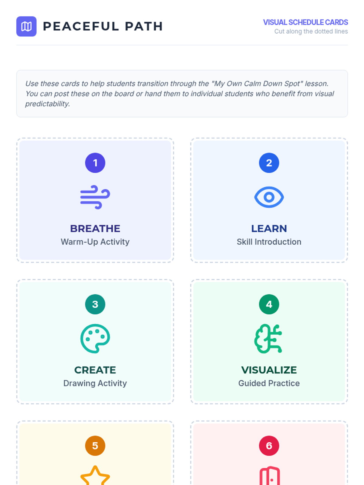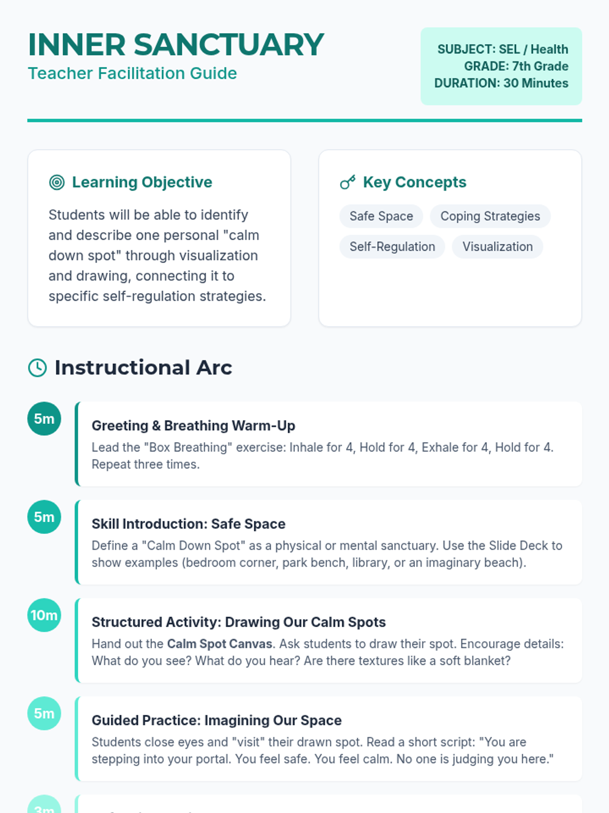 A 30-minute lesson designed for 7th graders to help them identify, visualize, and create a personal 'calm down spot' for emotional regulation and safety. Students will explore coping strategies and design their own sanctuary through drawing and reflection.