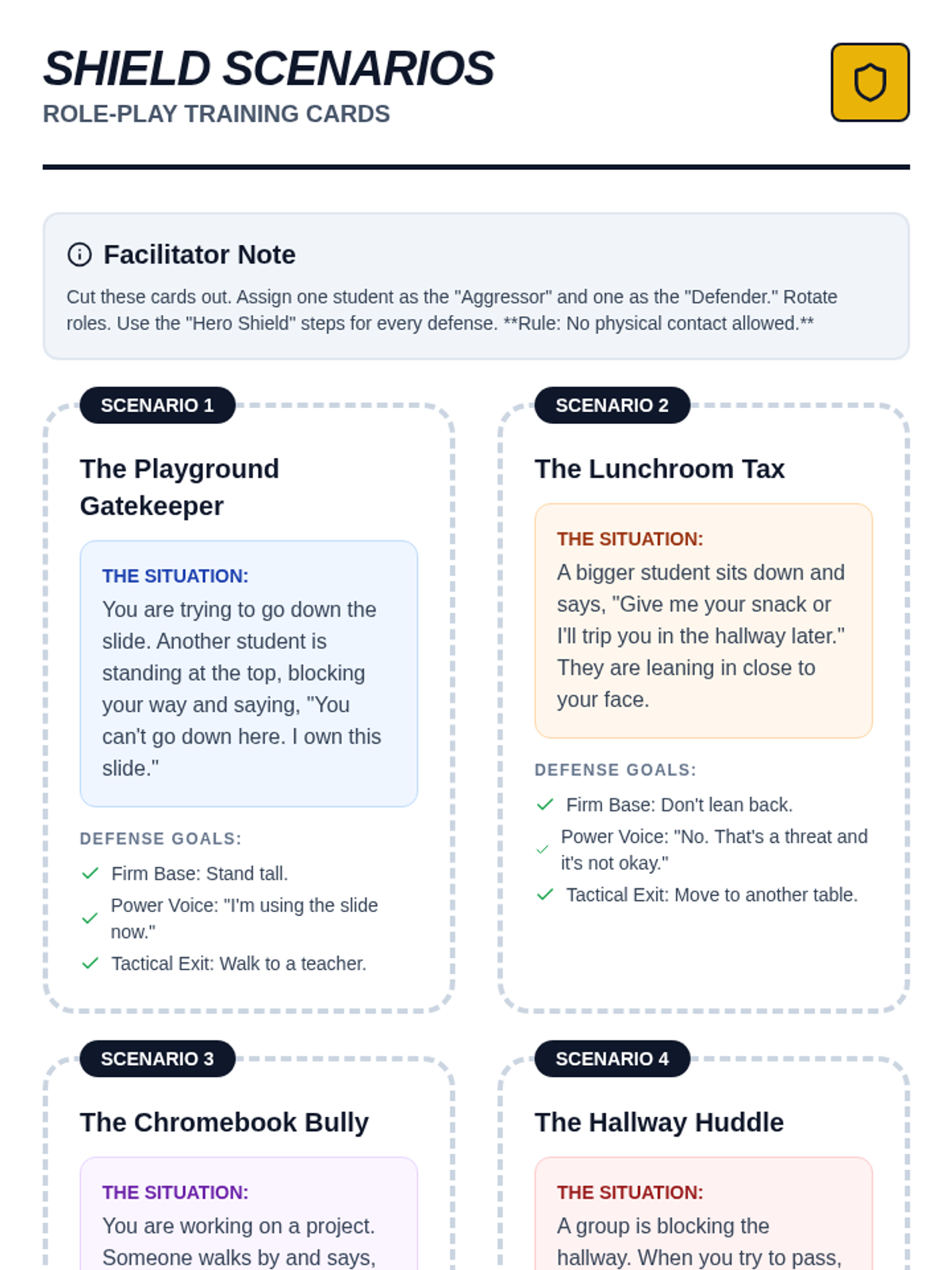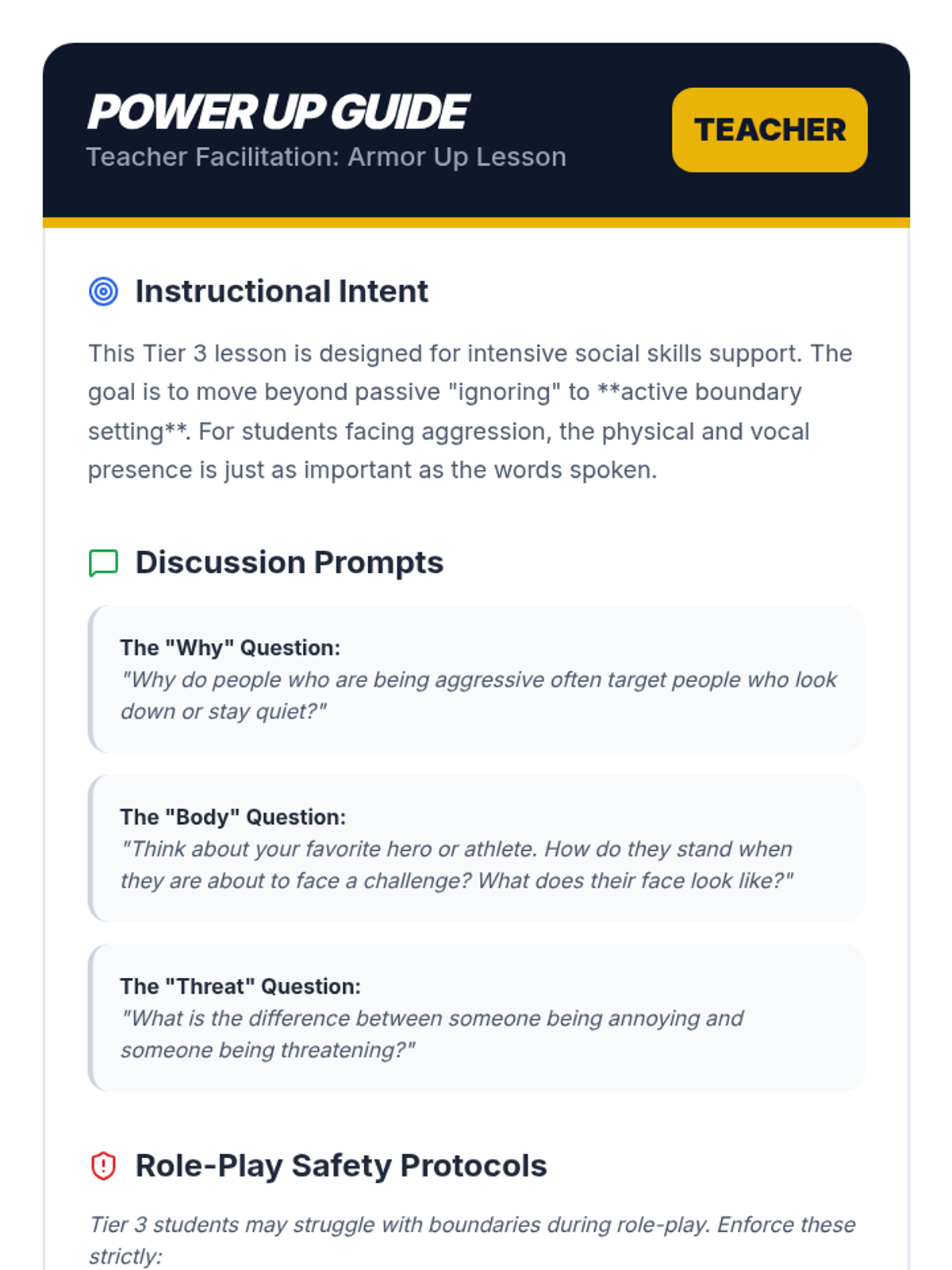 A Tier 3 social-emotional learning lesson focused on empowering Grade 4 boys to stand up for themselves against aggression and threats using the 'Hero Shield' framework. Includes discussion-based instruction and structured role-play scenarios.