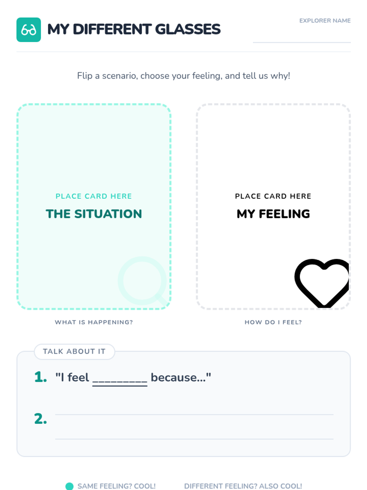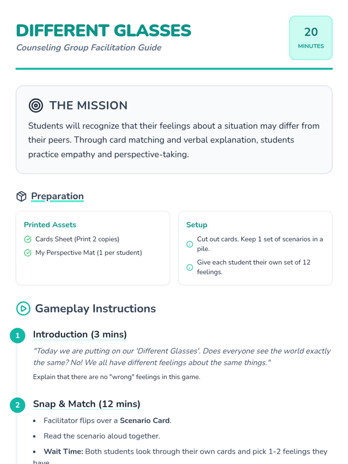 A counseling game designed for a small group of 1st and 2nd graders to practice identifying and explaining personal emotional perspectives. Students learn that different people can have varied emotional responses to the same situation by choosing feeling cards and sharing their reasoning.