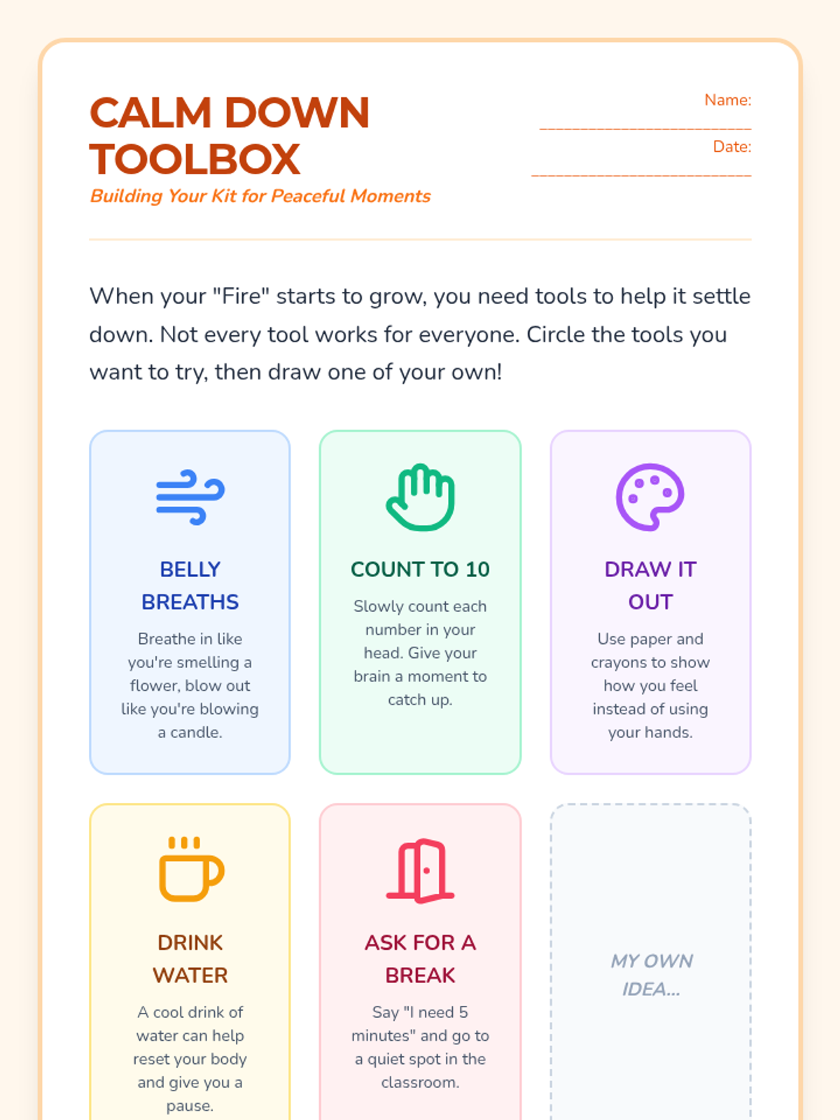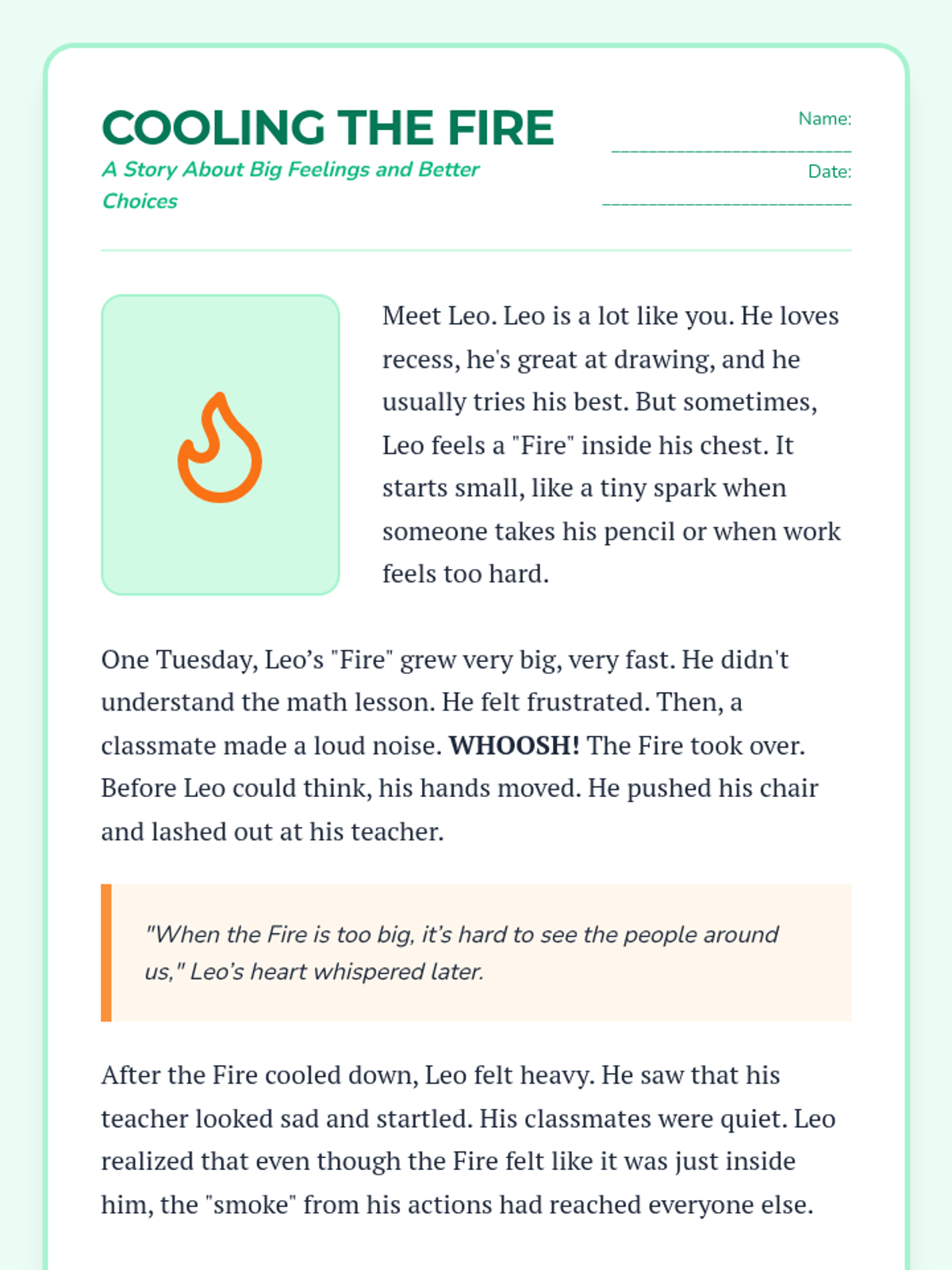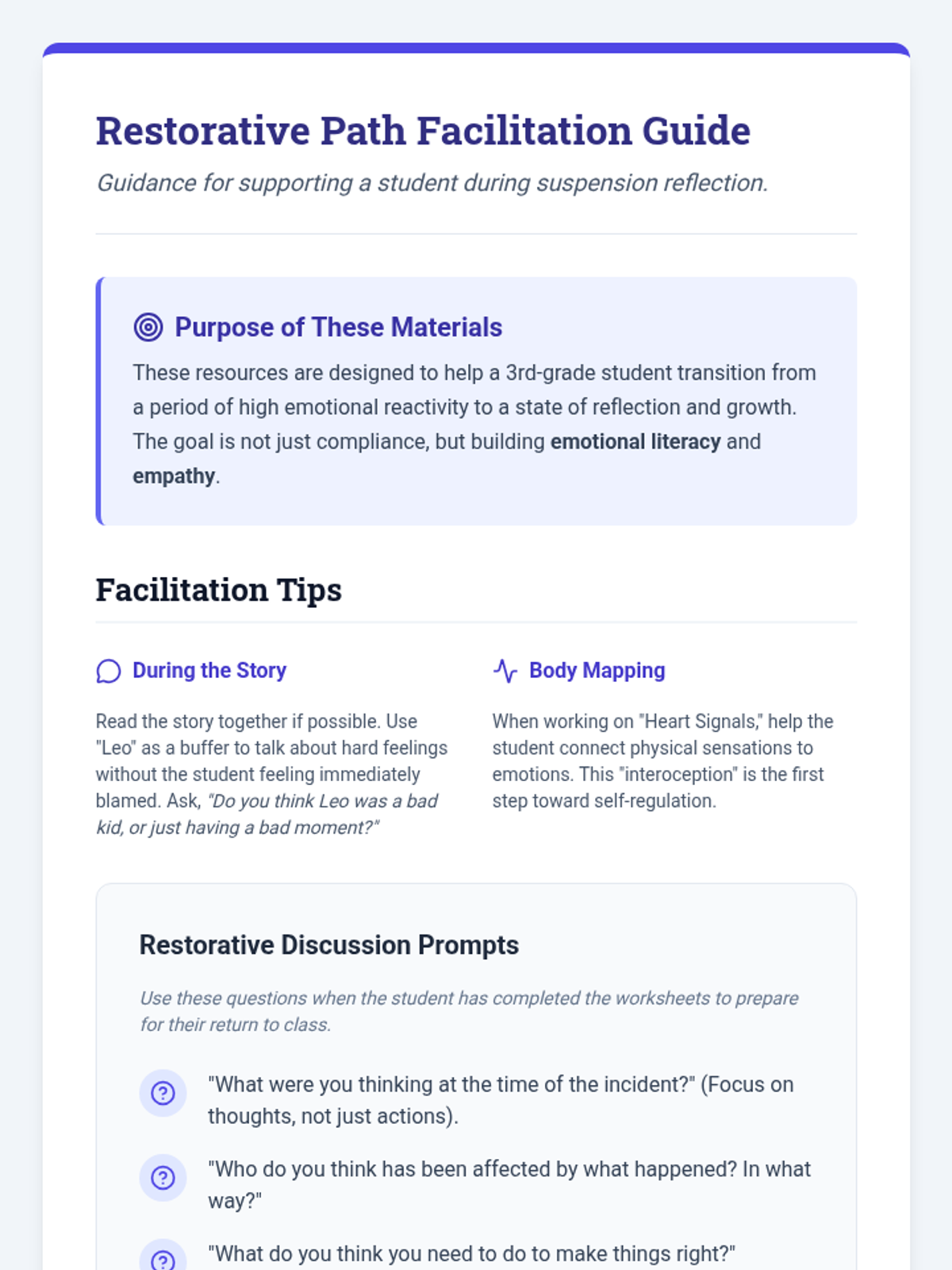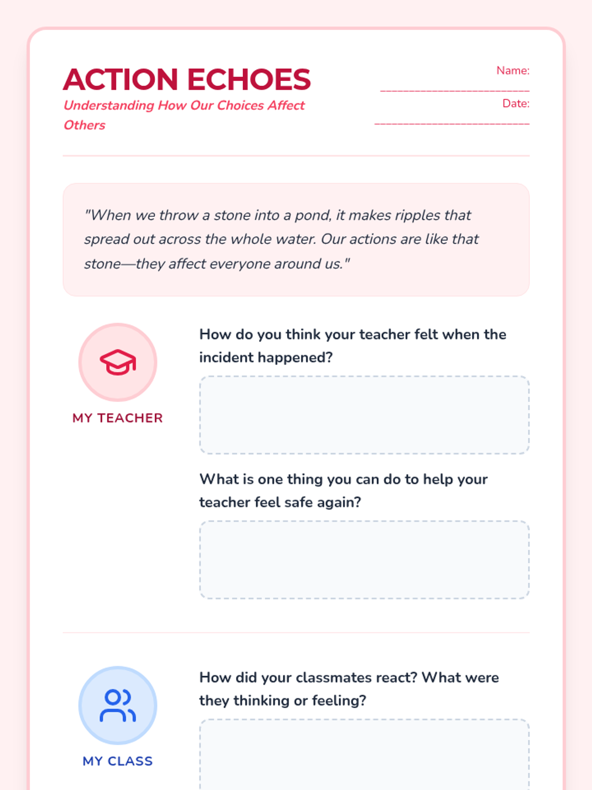 A supportive set of resources for a 3rd-grade student to reflect on emotional regulation, the impact of their actions on others, and developing peaceful conflict-resolution strategies following a behavioral incident.
