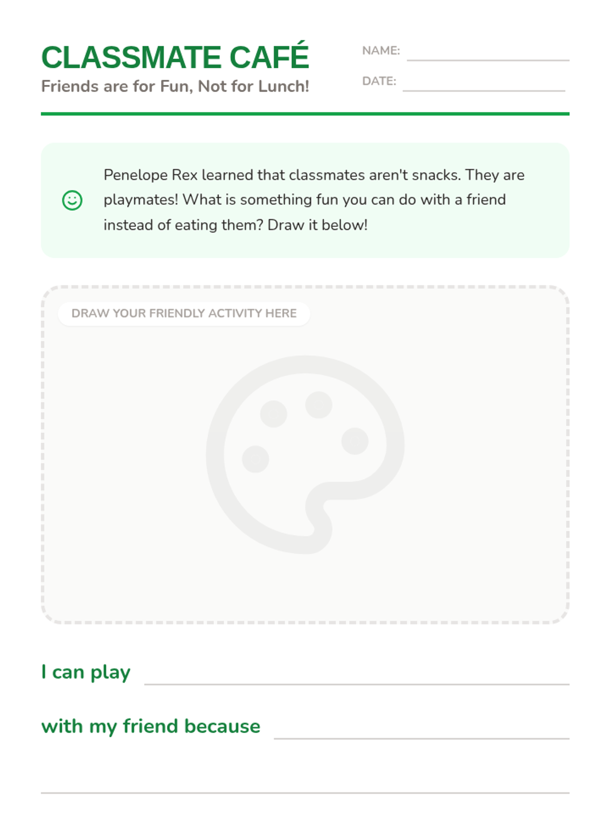 A social-emotional learning lesson inspired by the theme of a dinosaur learning not to eat their classmates, focusing on empathy, self-control, and building friendships.