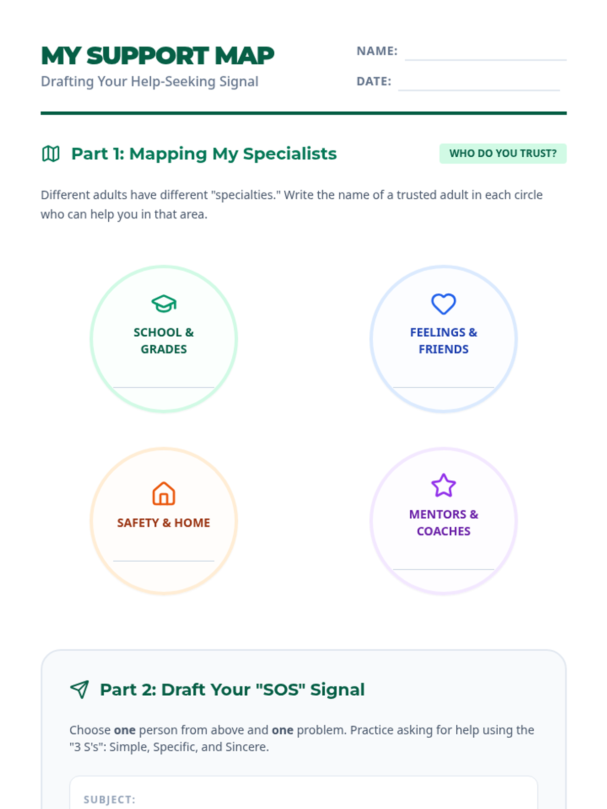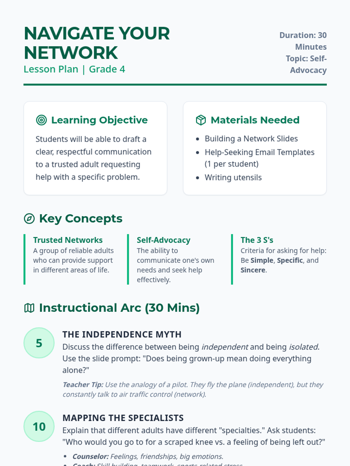 A 30-minute lesson for 4th graders focused on identifying trusted adults and practicing clear, respectful communication when asking for help. Students learn that independence includes knowing when and how to seek support from their specialized network.