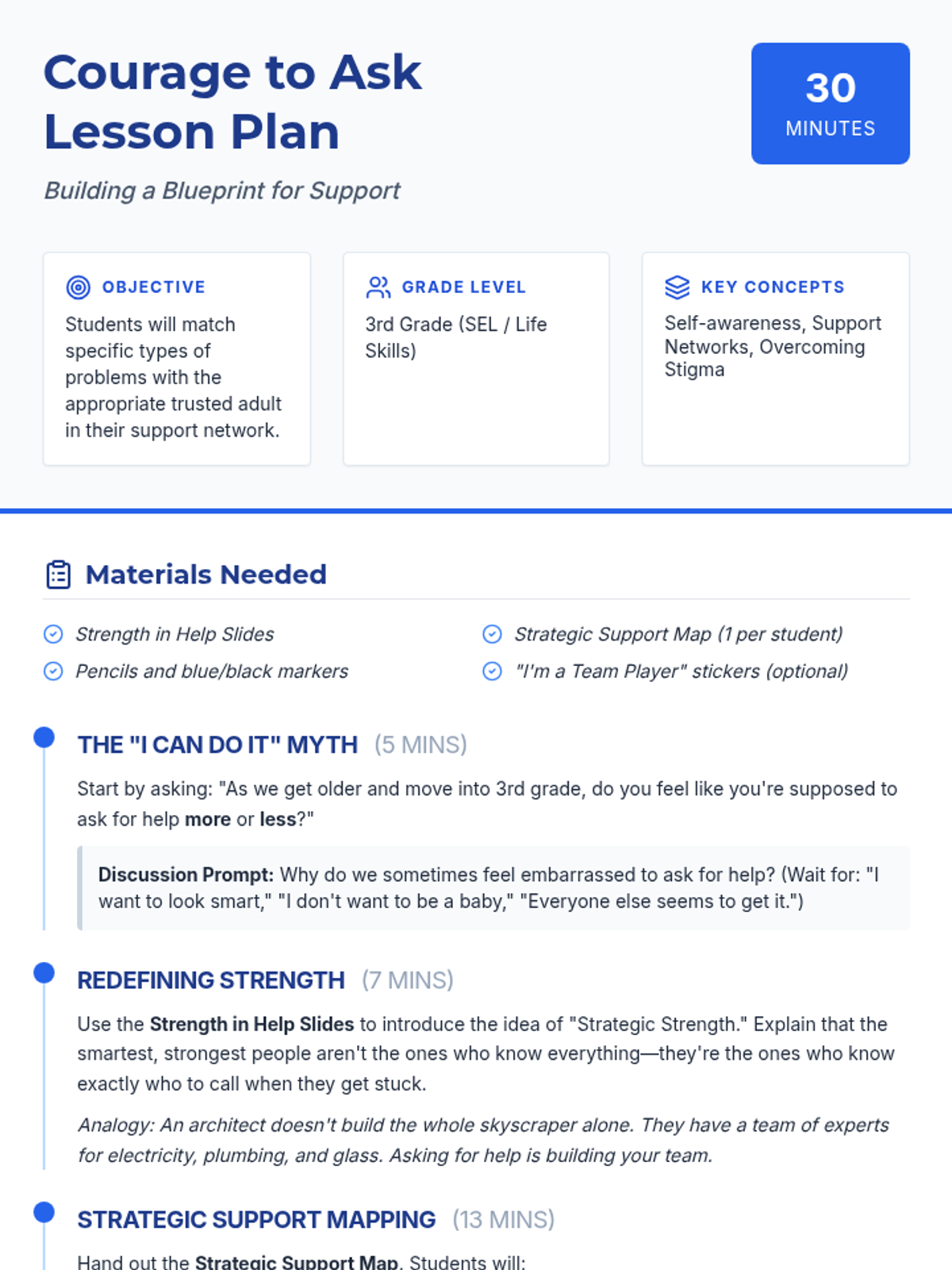 A 30-minute lesson for 3rd grade focused on overcoming the stigma of asking for help and identifying specific trusted adults for different types of challenges. Students will learn that seeking help is a sign of self-awareness and strength.