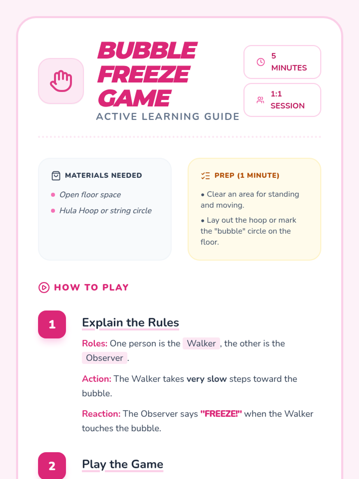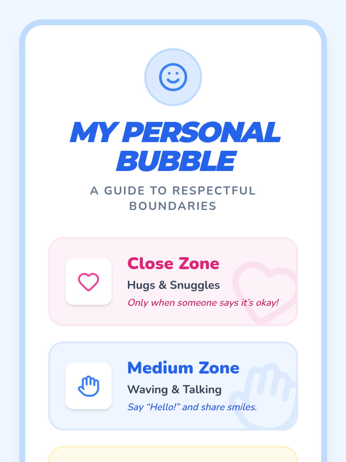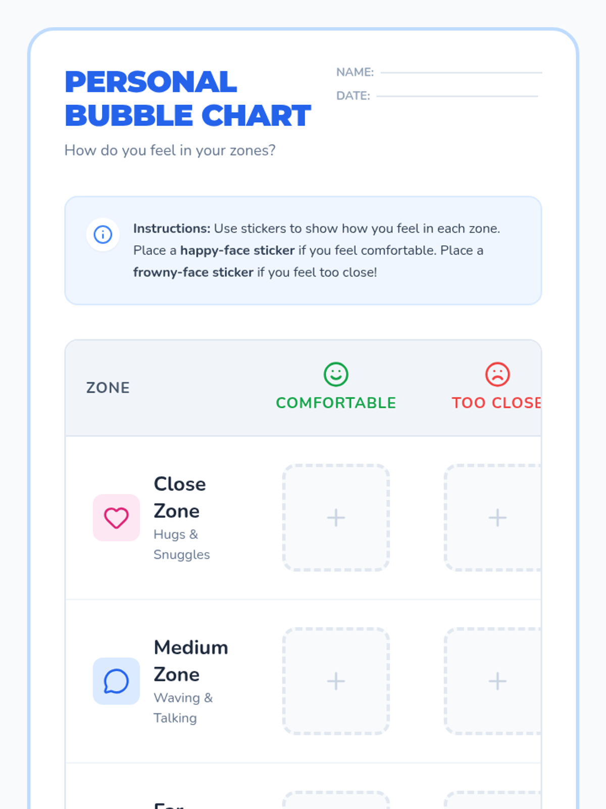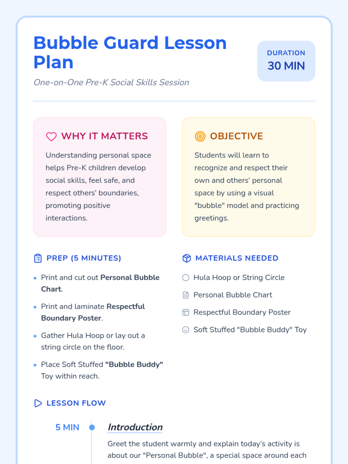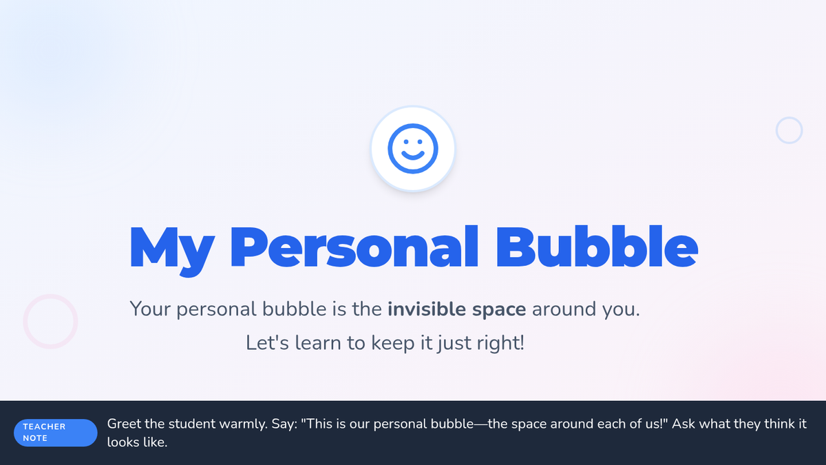 A 30-minute one-on-one Pre-K lesson focused on teaching personal space boundaries through the metaphor of a 'personal bubble', using interactive games and visual charts.