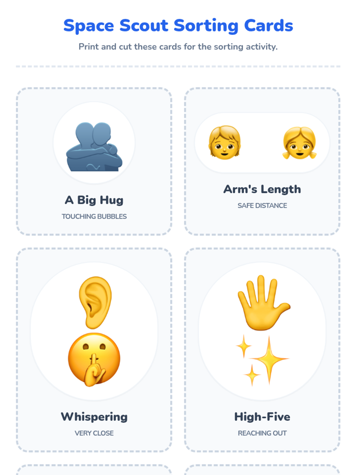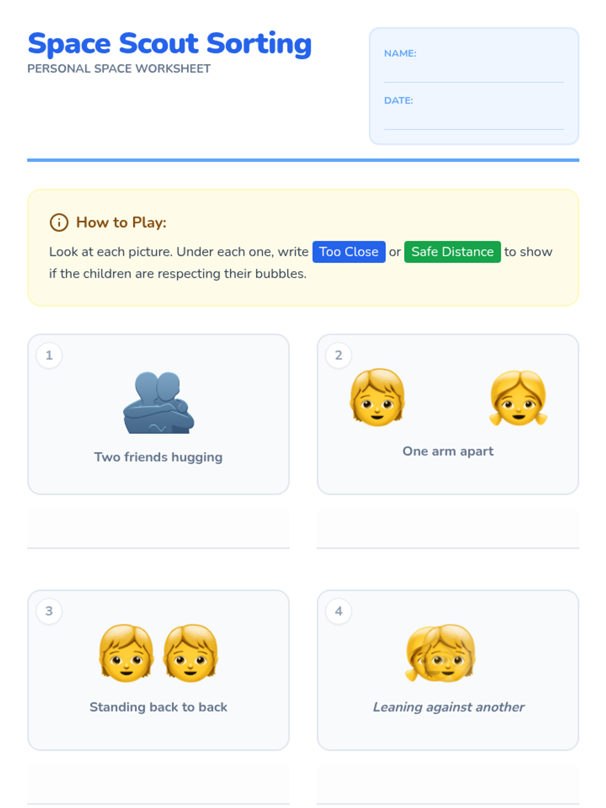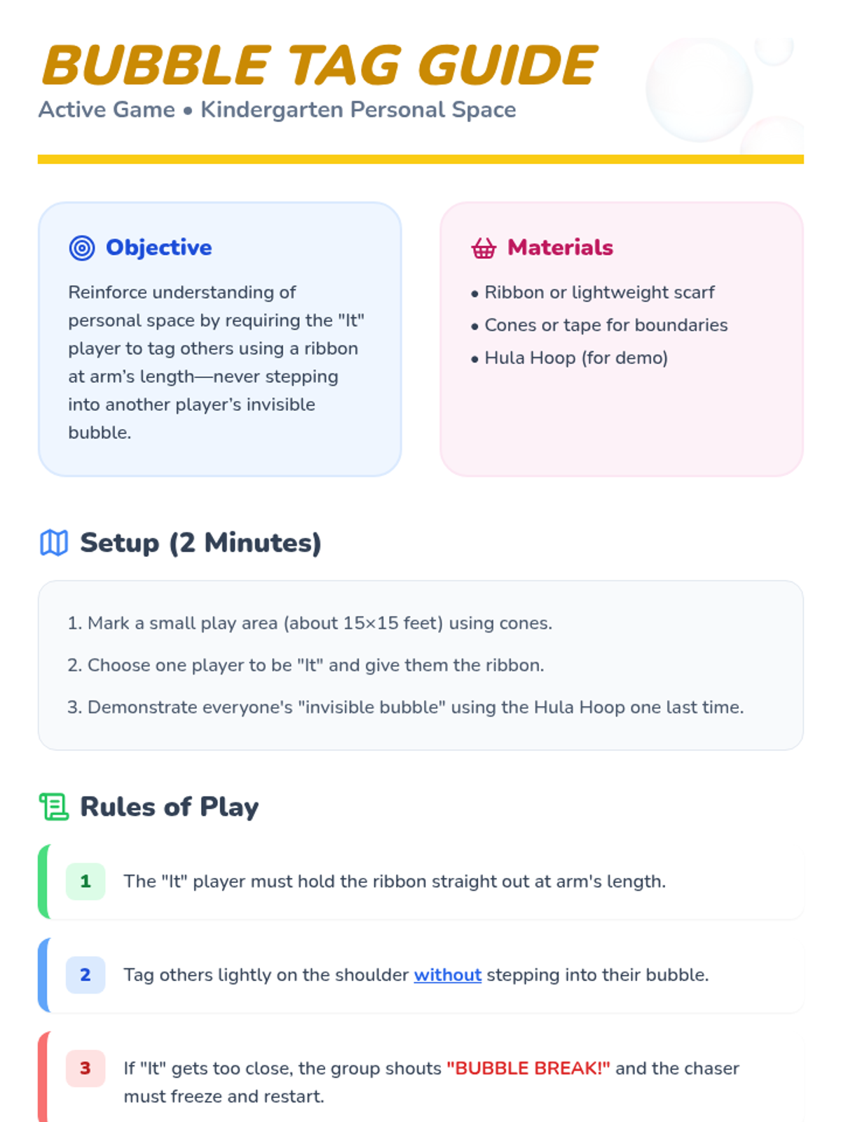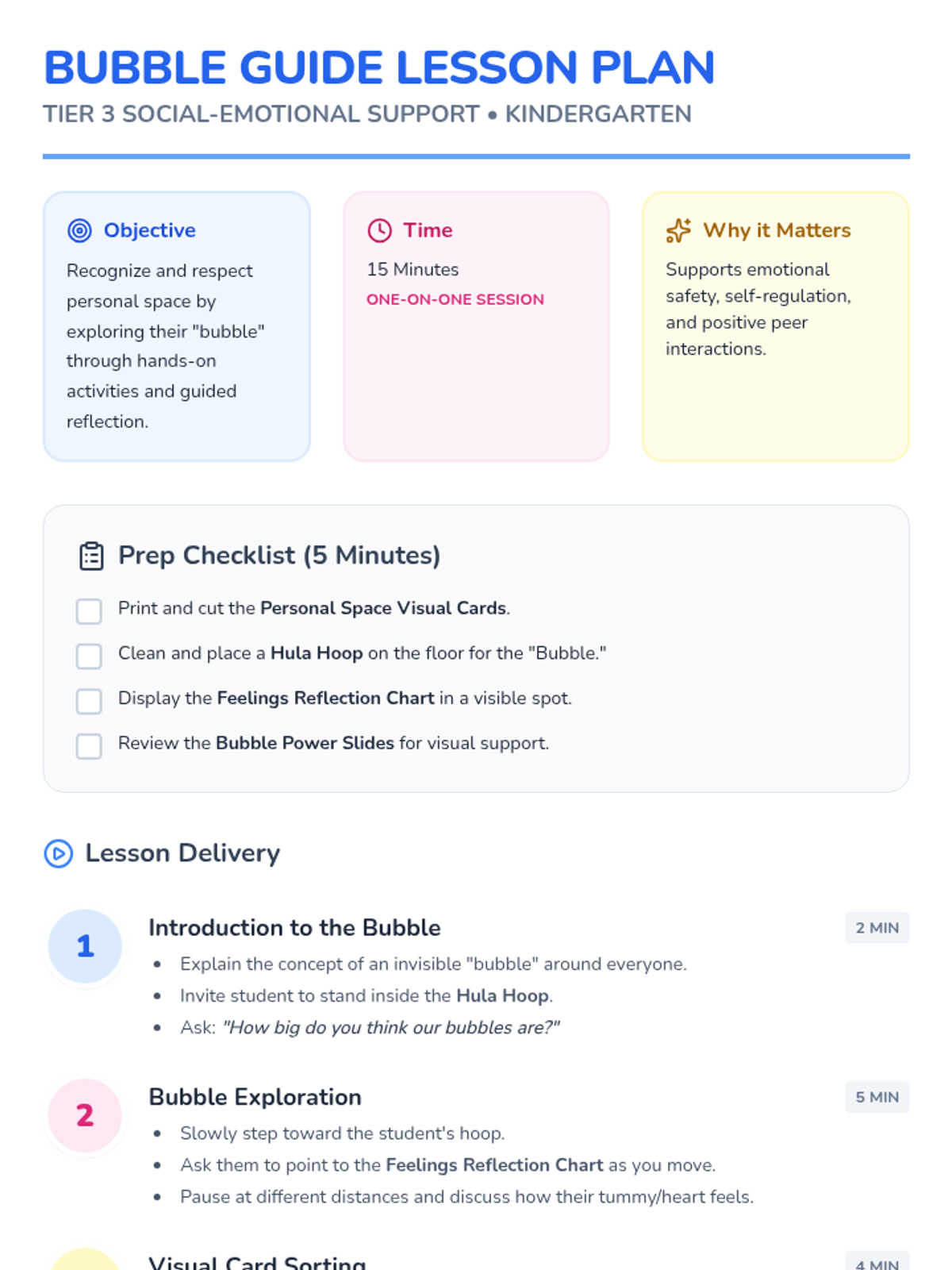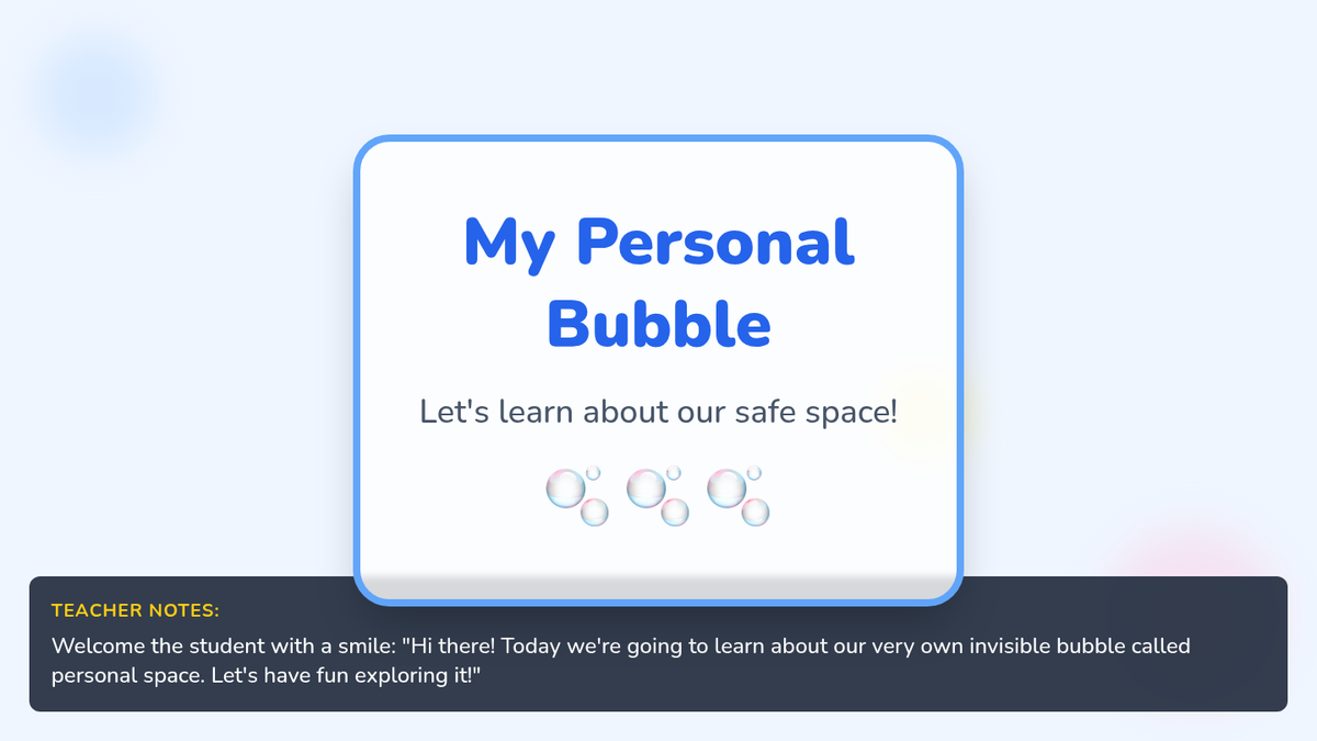 A 15-minute Tier 3 lesson for Kindergarten students to explore personal space through a 'bubble' metaphor, interactive movement, and visual sorting.