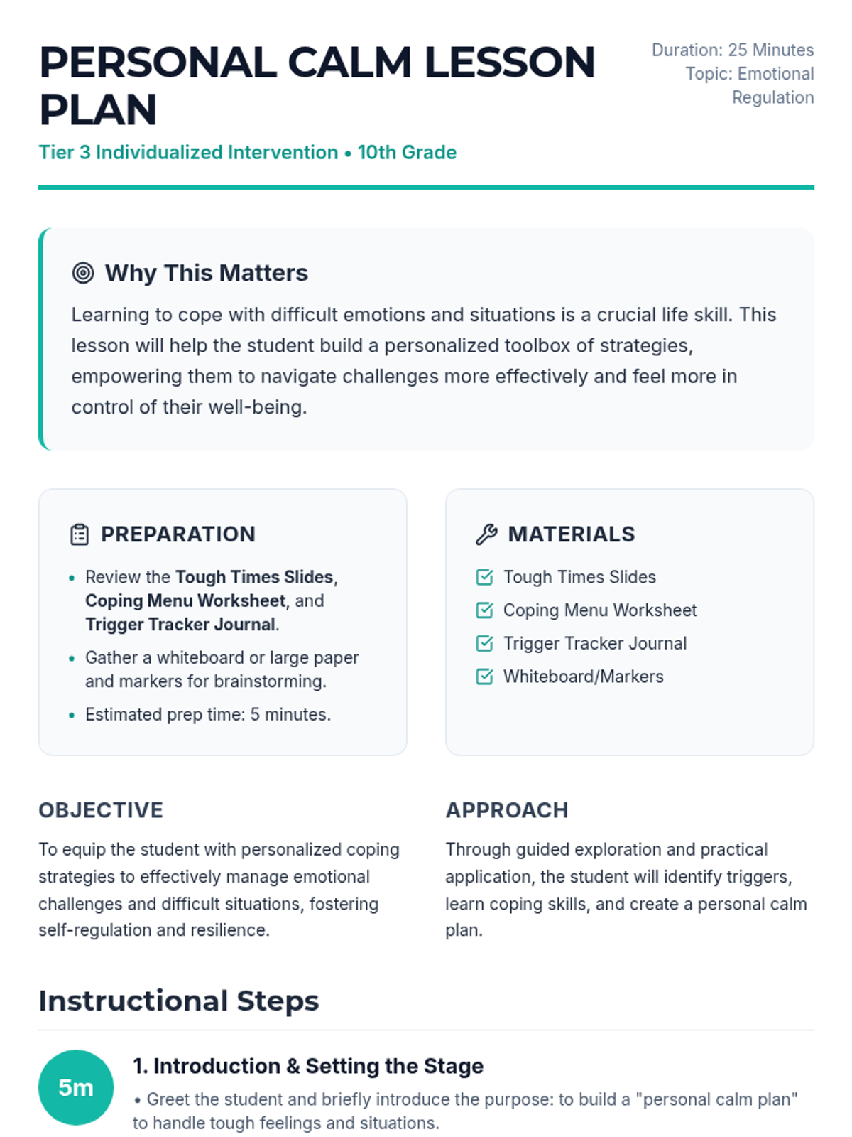 An individualized Tier 3 lesson for 10th-grade students to identify emotional triggers and build a personalized toolbox of coping strategies for self-regulation.