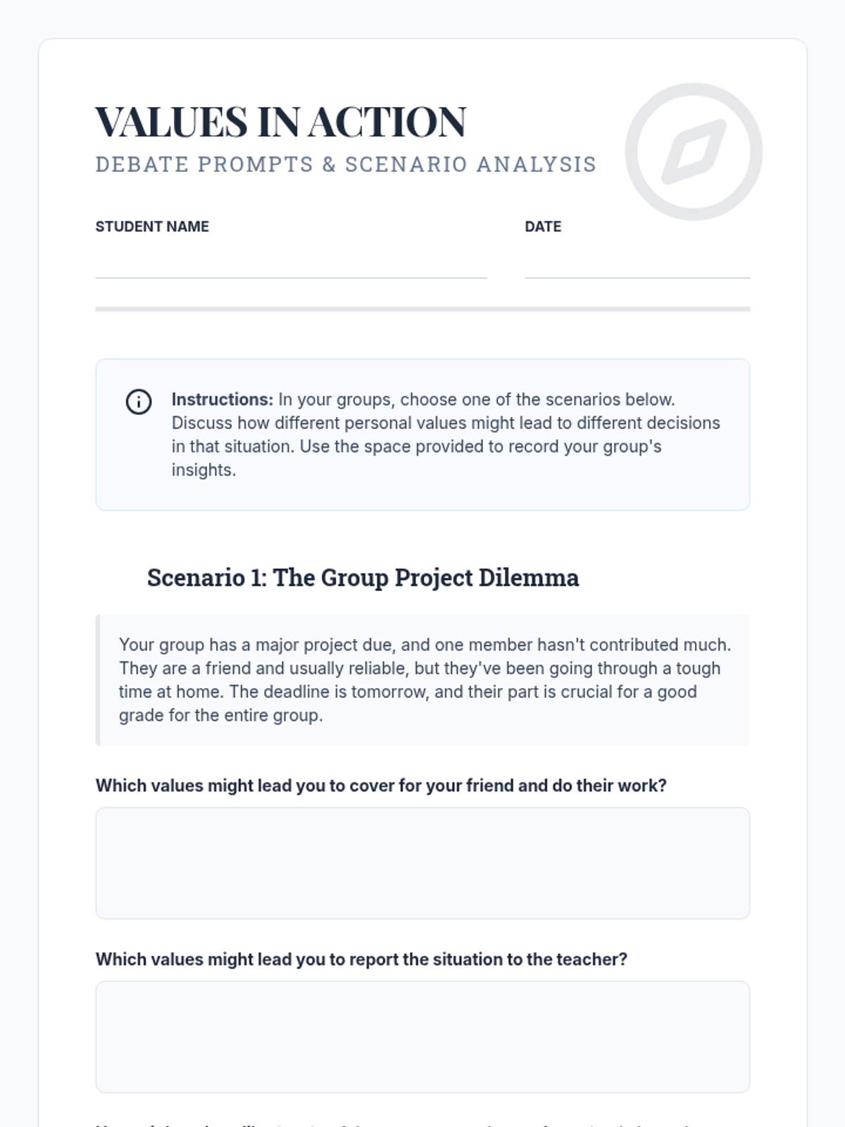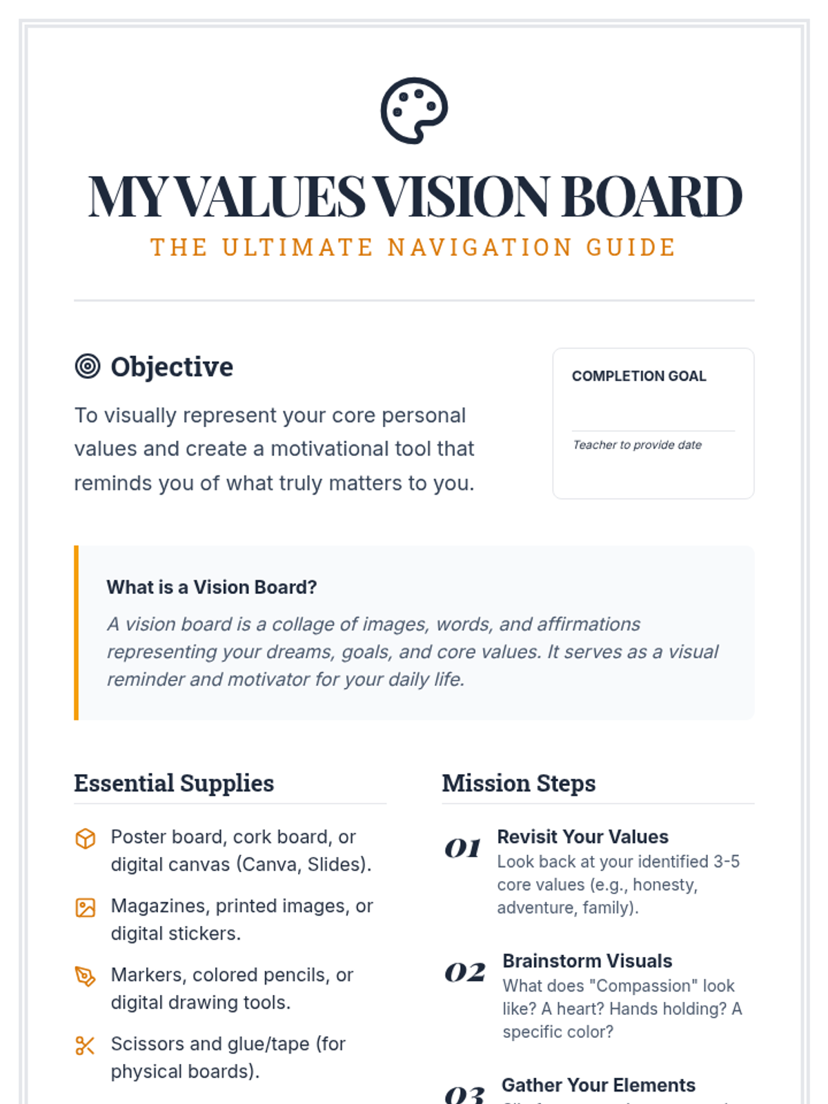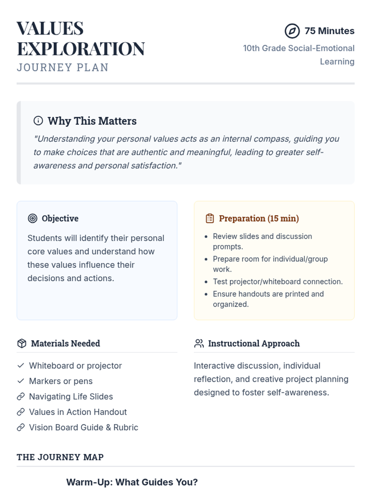 This lesson guides 10th-grade students in identifying their core values and understanding how these values influence their decisions and actions. Discovering personal values helps students build a strong internal compass, leading to more authentic choices.