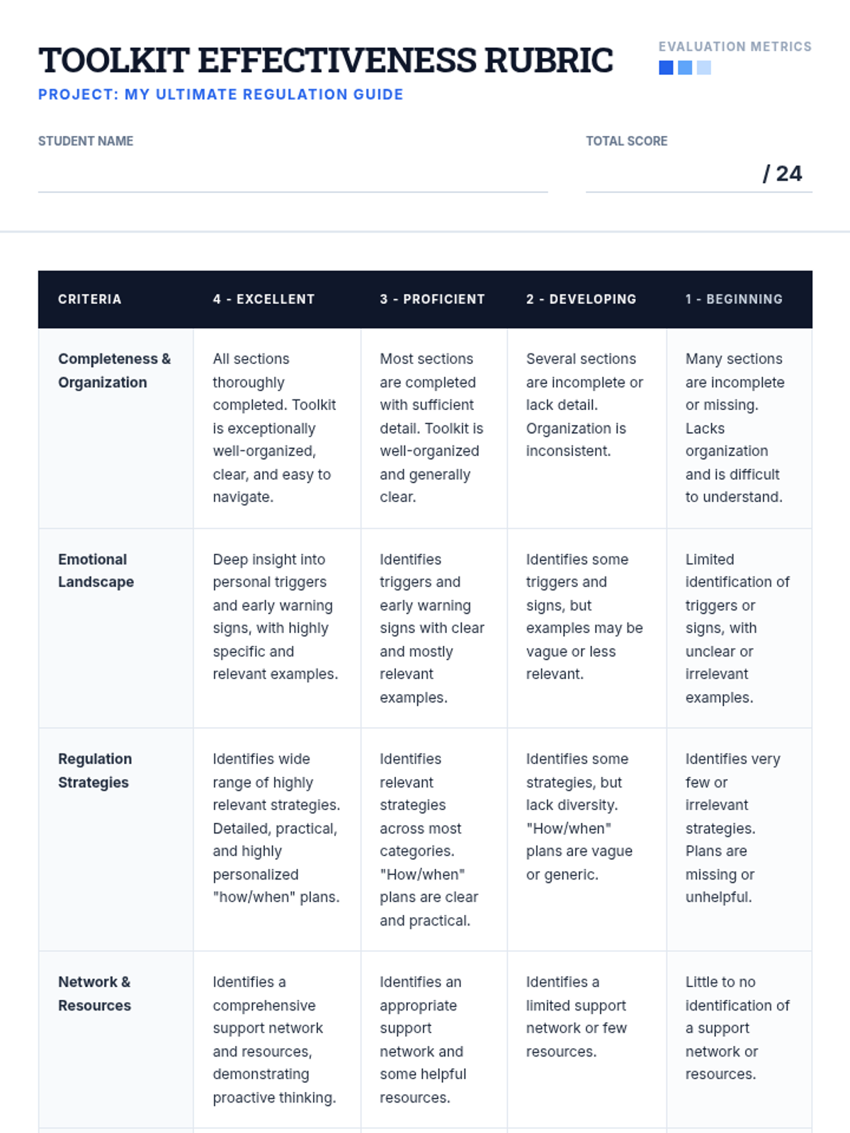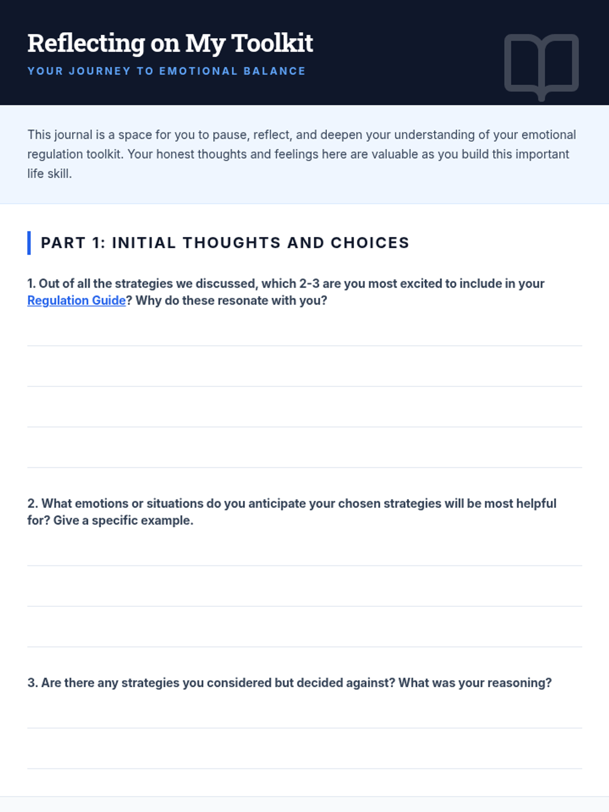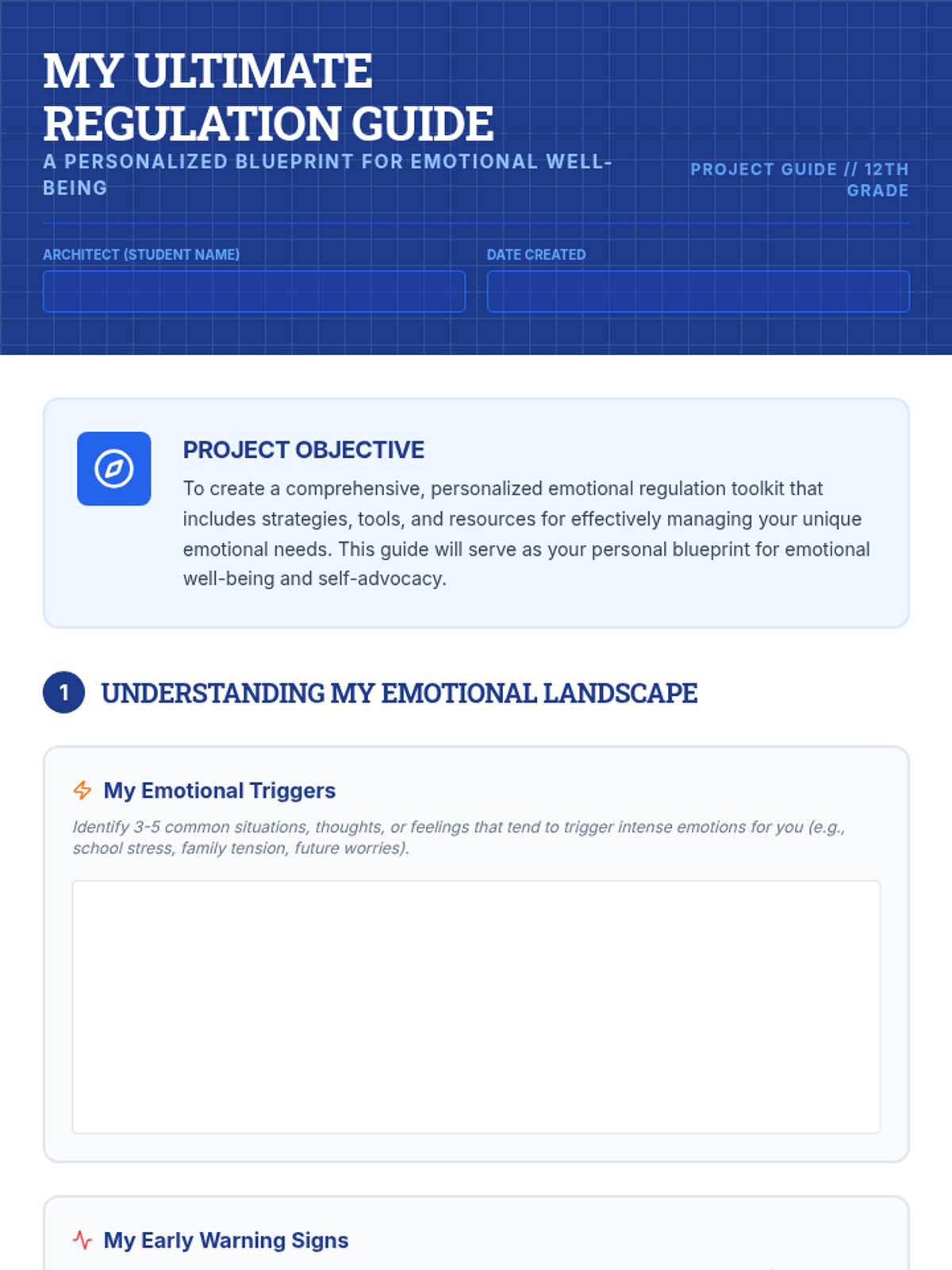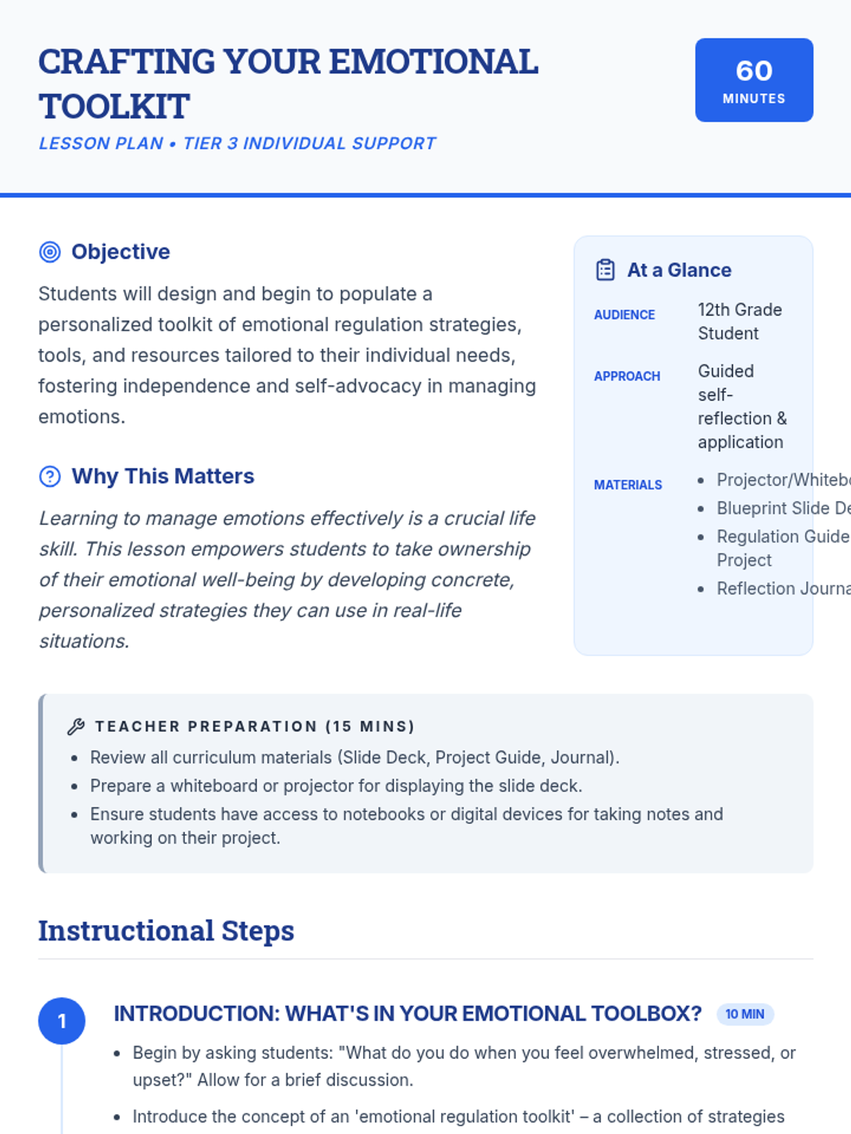 A Tier 3 lesson for 12th-grade students to design a personalized emotional regulation toolkit, fostering independence and self-advocacy through guided reflection and strategy selection.