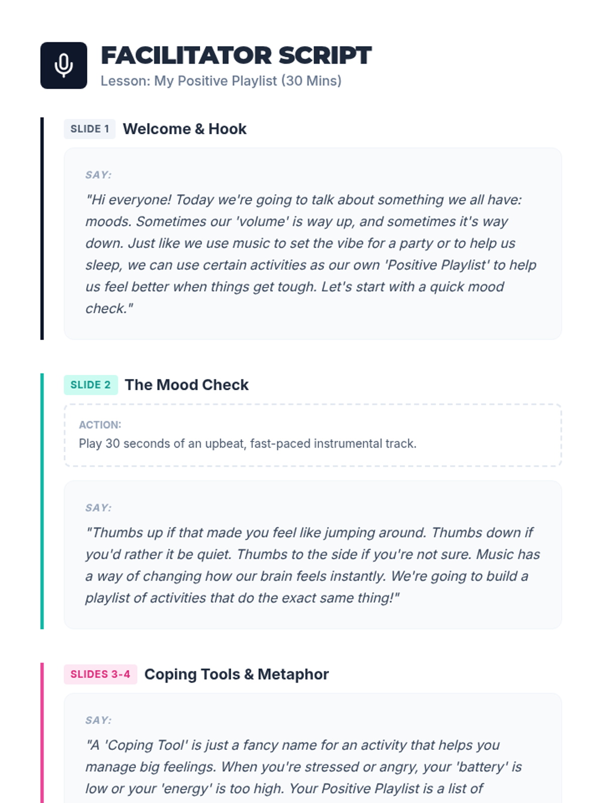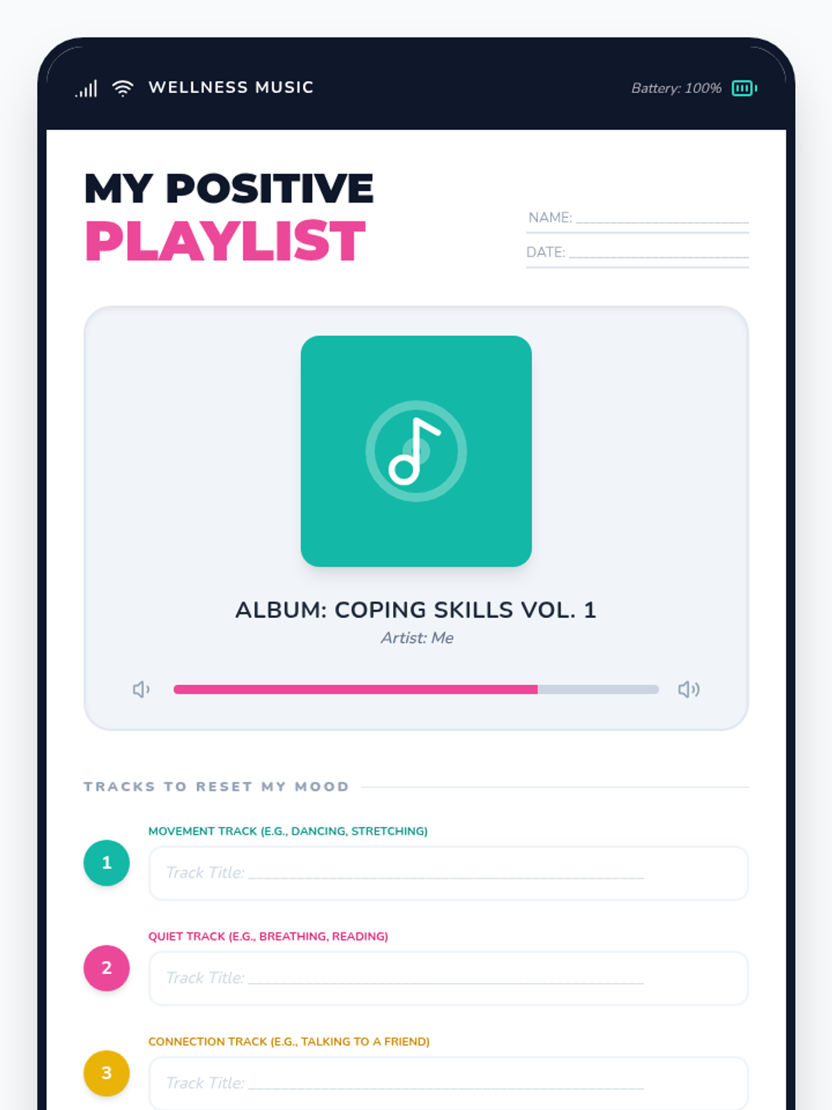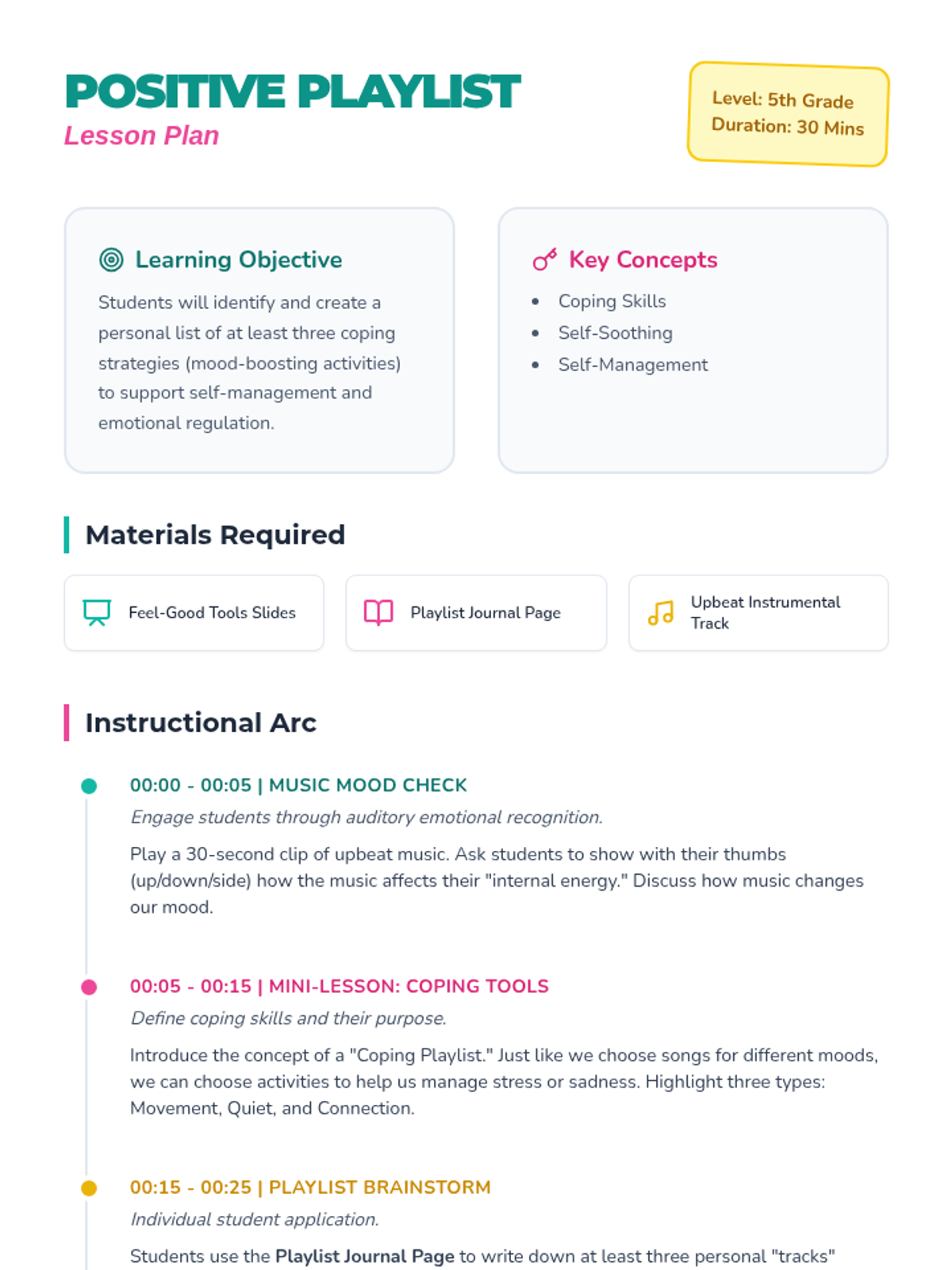A 30-minute lesson where 5th-grade students explore coping strategies by creating a 'positive playlist' of activities that help manage their moods and emotions.
