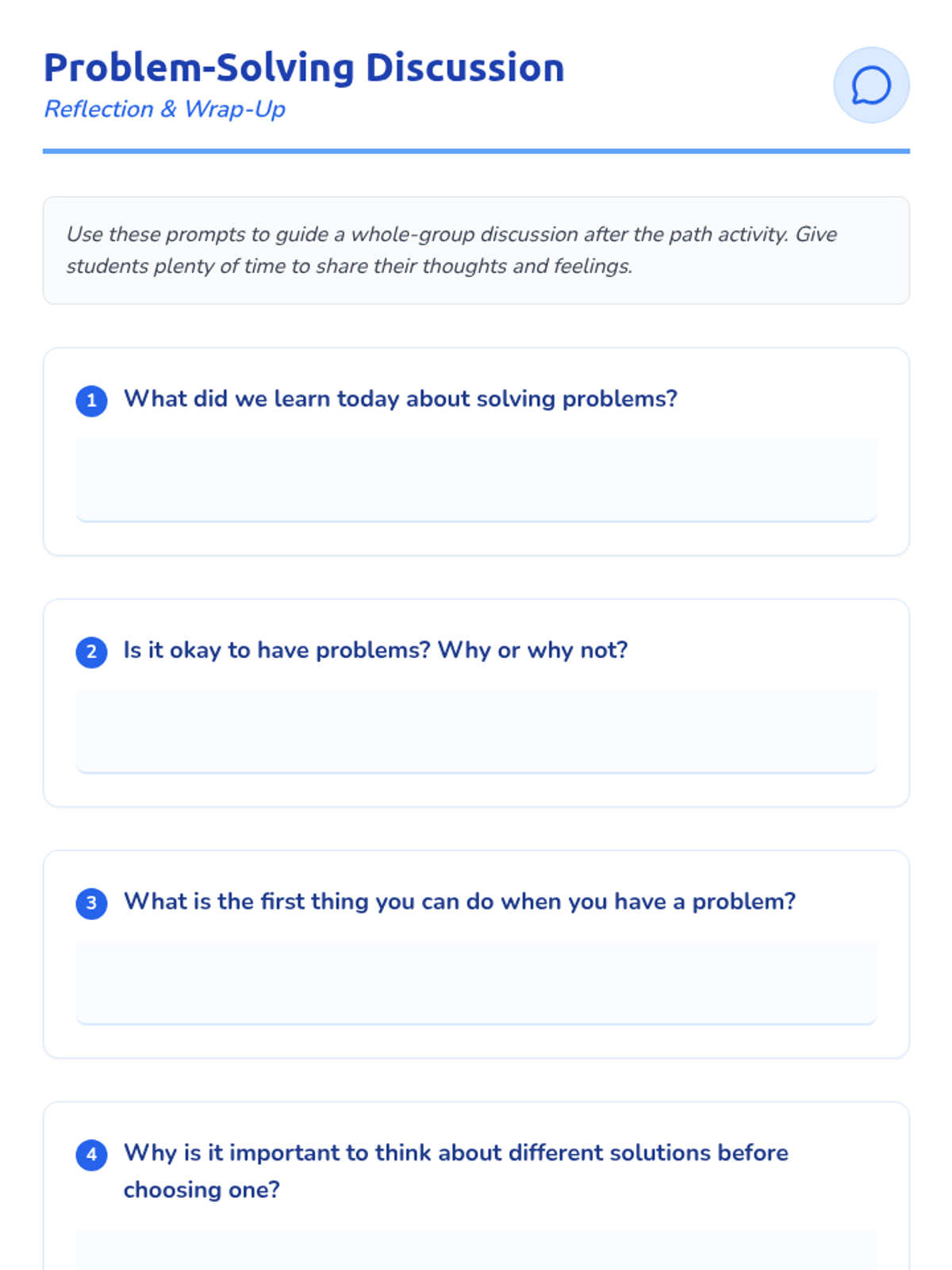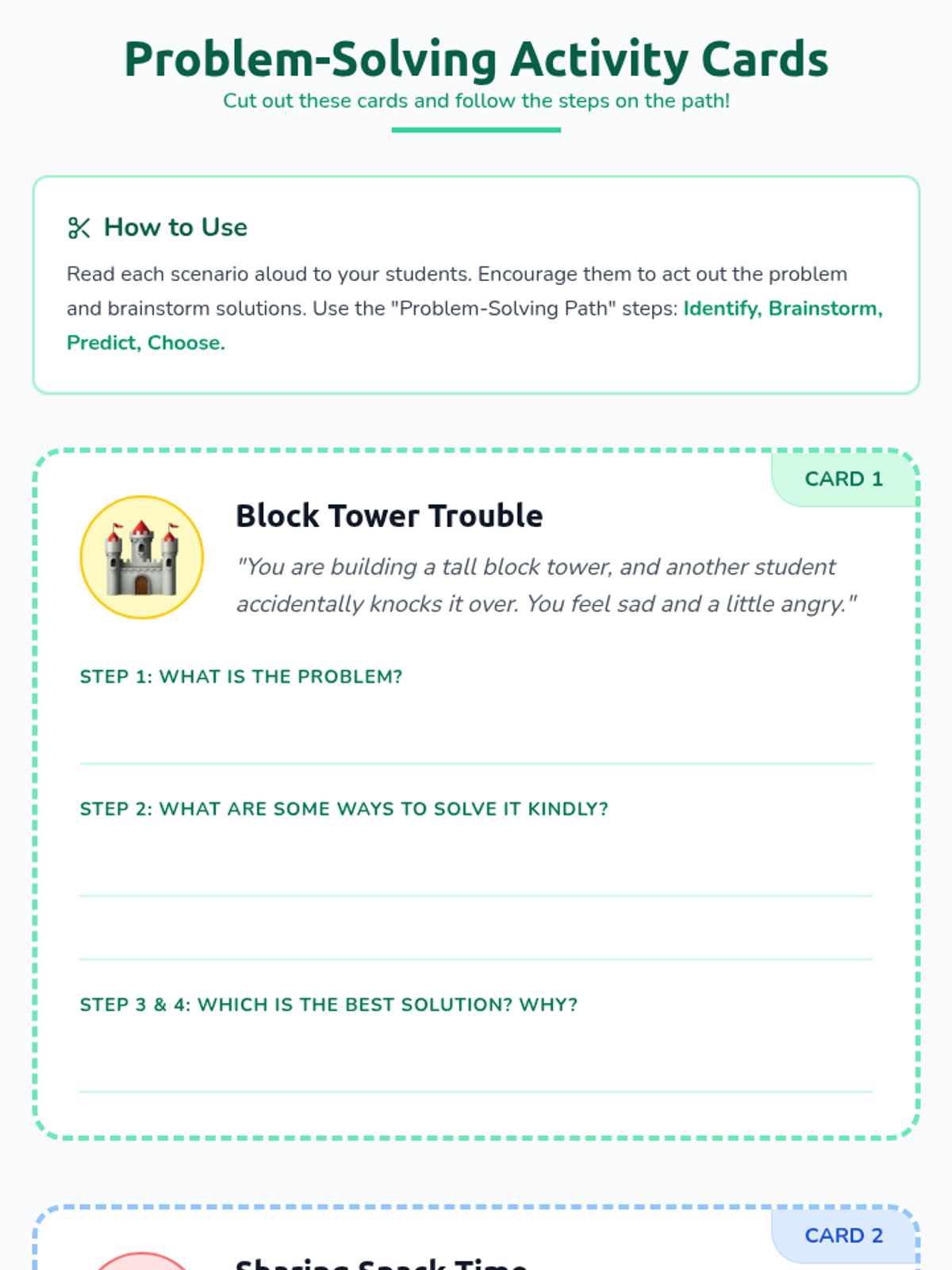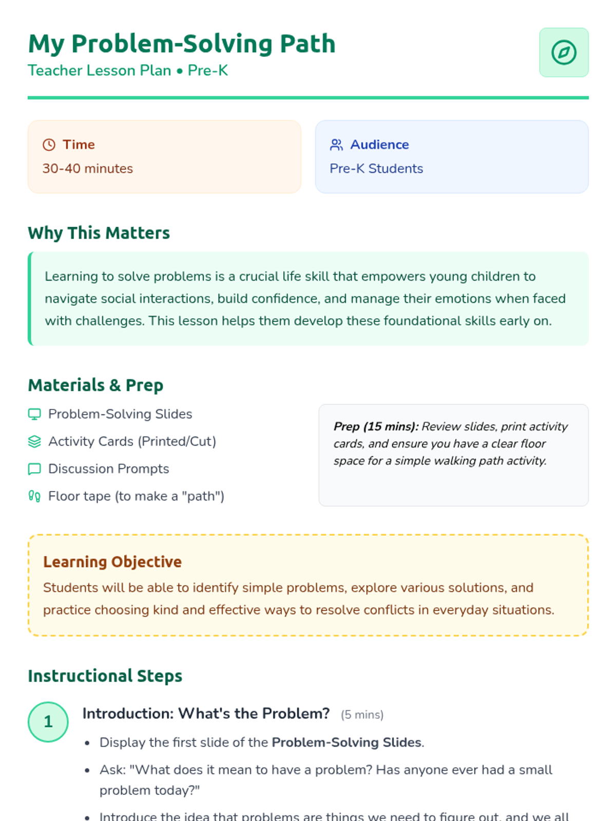 An engaging Pre-K lesson that introduces a visual 'path' for solving simple problems through brainstorming, role-play, and kind conflict resolution.
