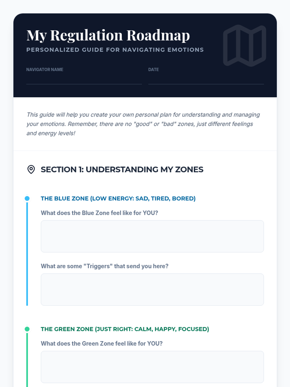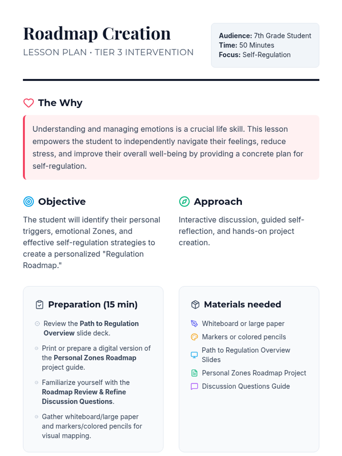 A personalized social-emotional learning session for 7th-grade students to identify triggers, understand the Zones of Regulation, and build a customized toolkit of self-regulation strategies.