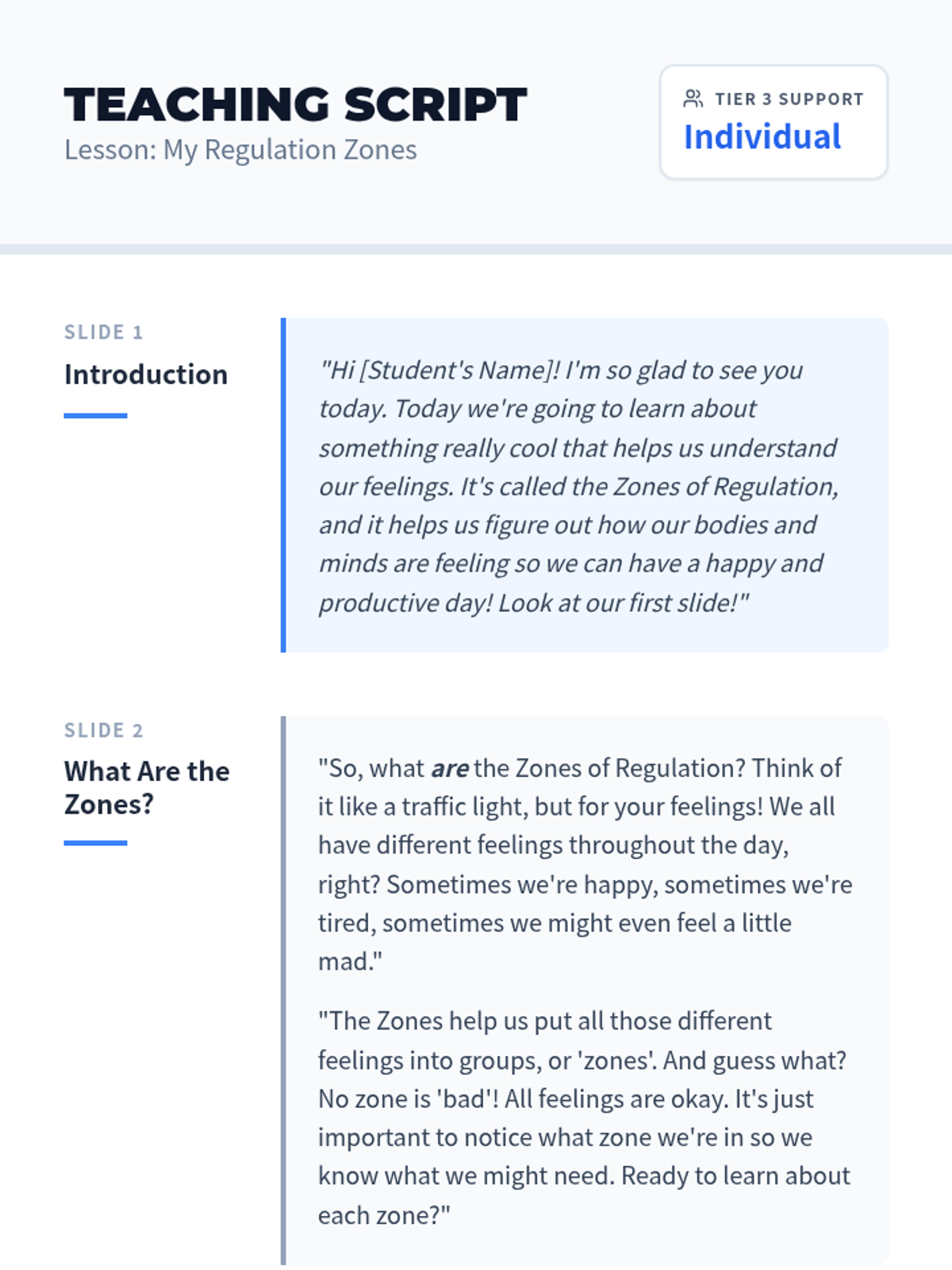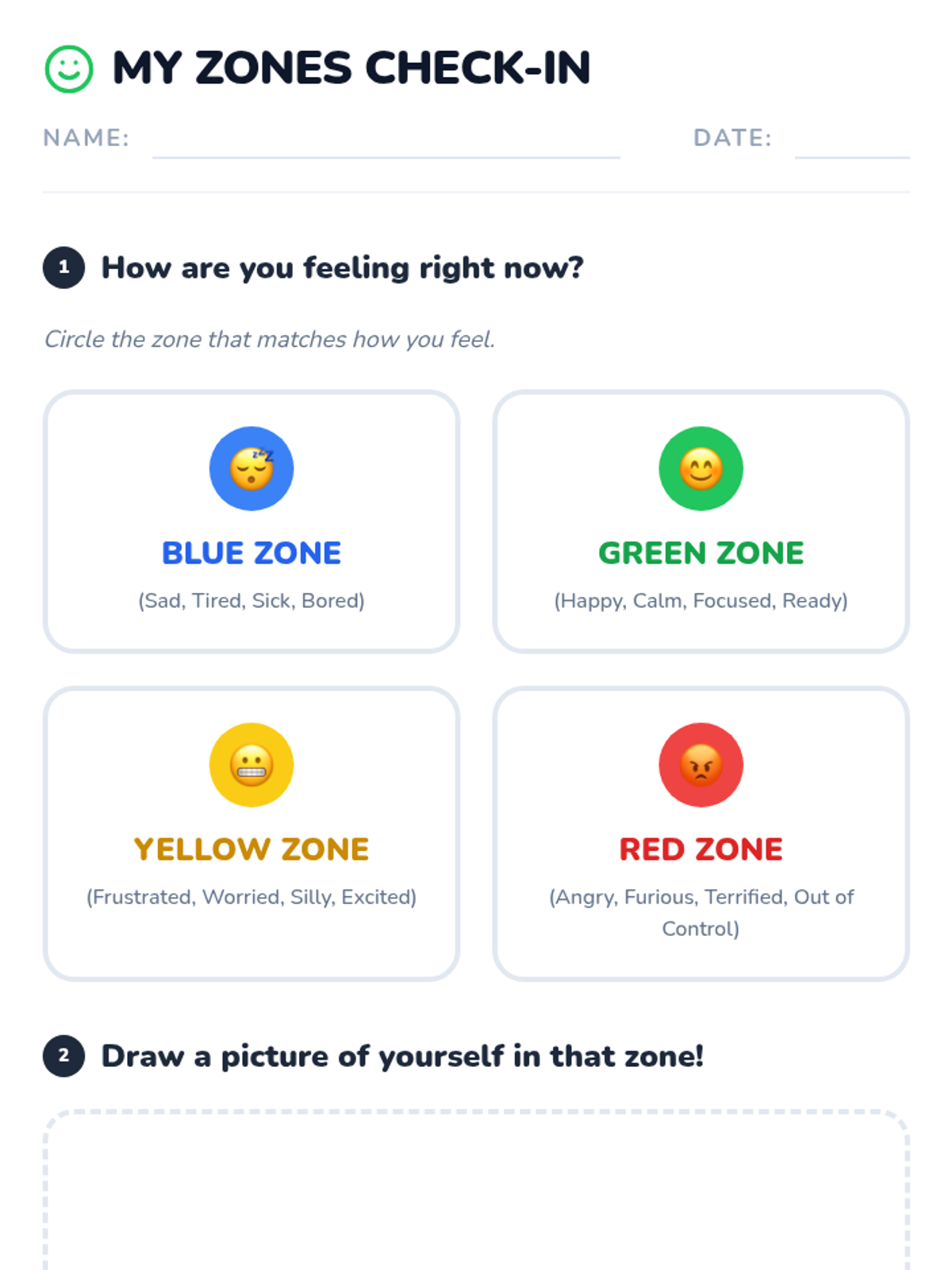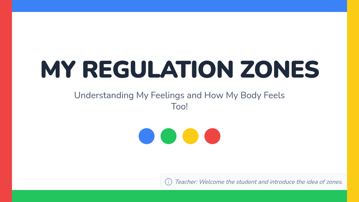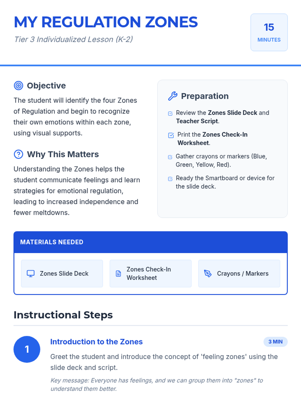 A 15-minute individualized lesson for K-2 autistic students to identify and manage emotional states using the Zones of Regulation framework. Includes a visual slide deck, teacher script, and a check-in activity.