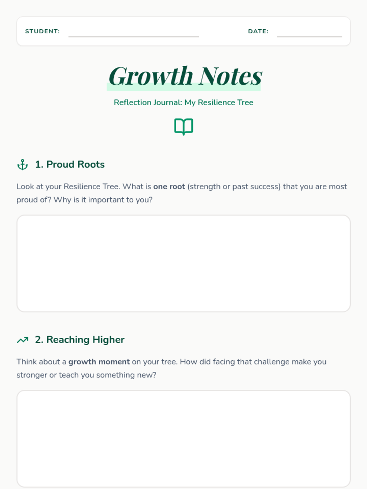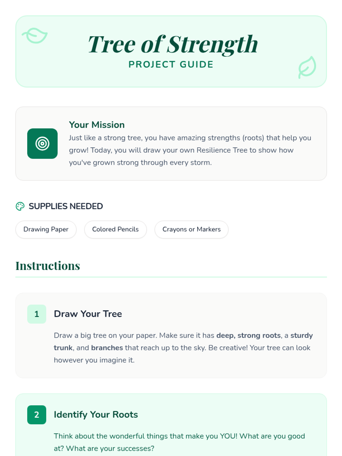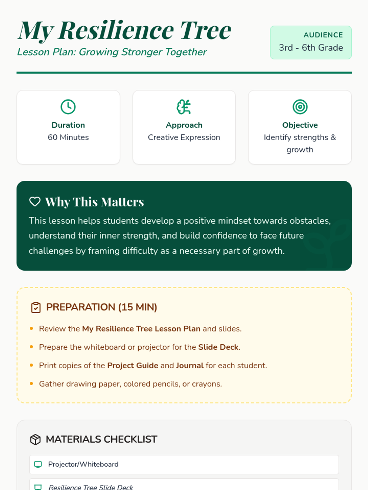 A 60-minute social-emotional learning lesson for 3rd-6th graders that uses the metaphor of a tree to explore resilience, personal strengths, and growth through challenges.