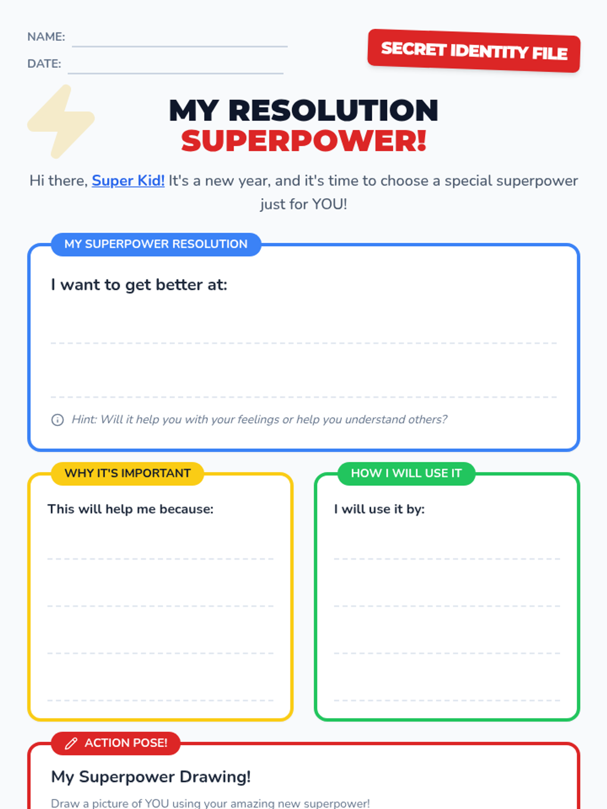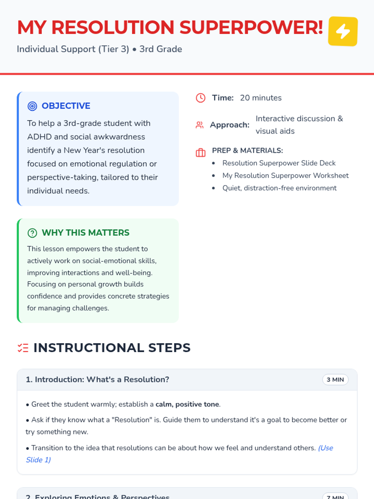 A 20-minute Tier 3 individual lesson for a 3rd-grade student with ADHD, focusing on setting a New Year's resolution for emotional regulation and perspective-taking.