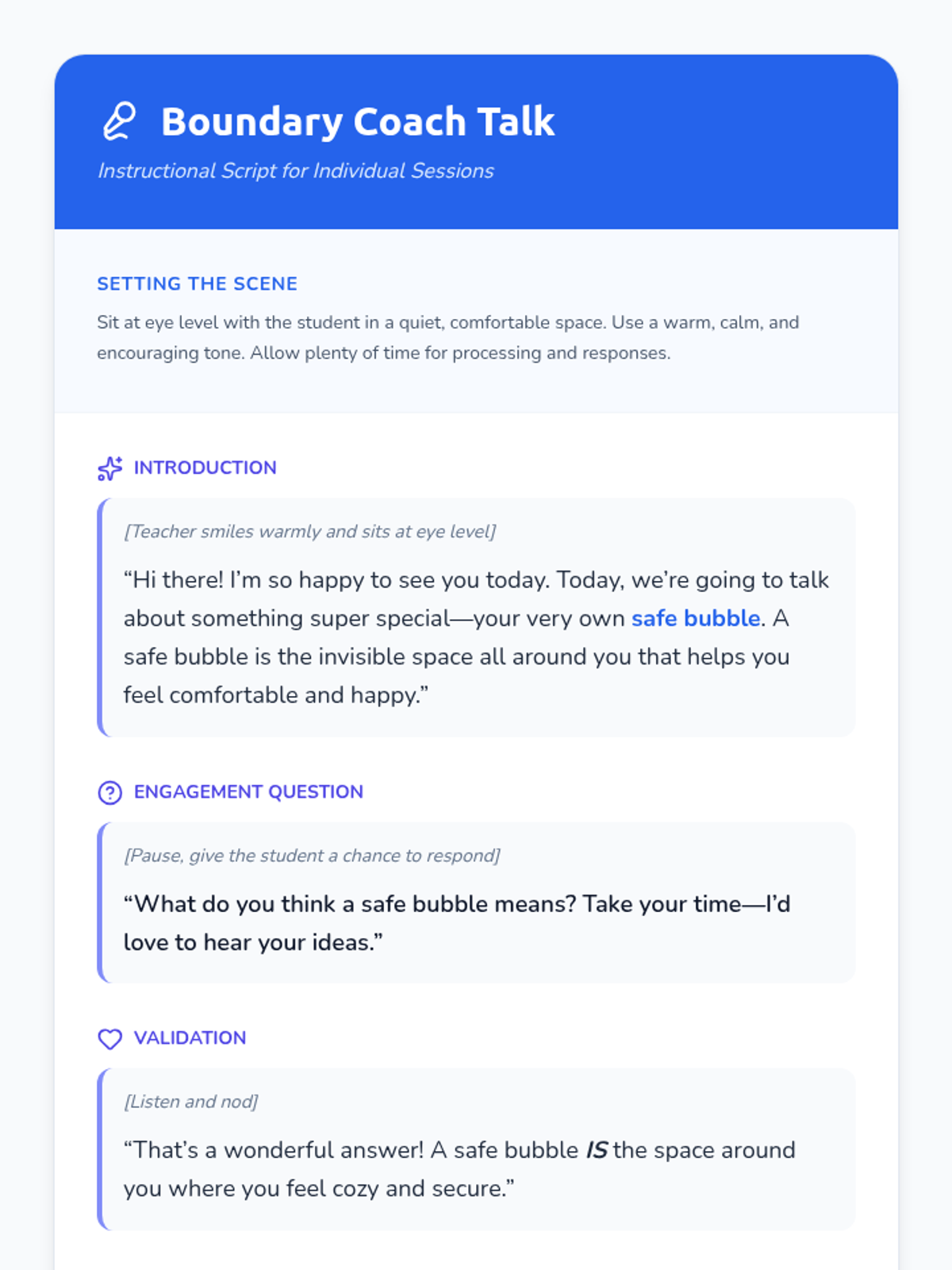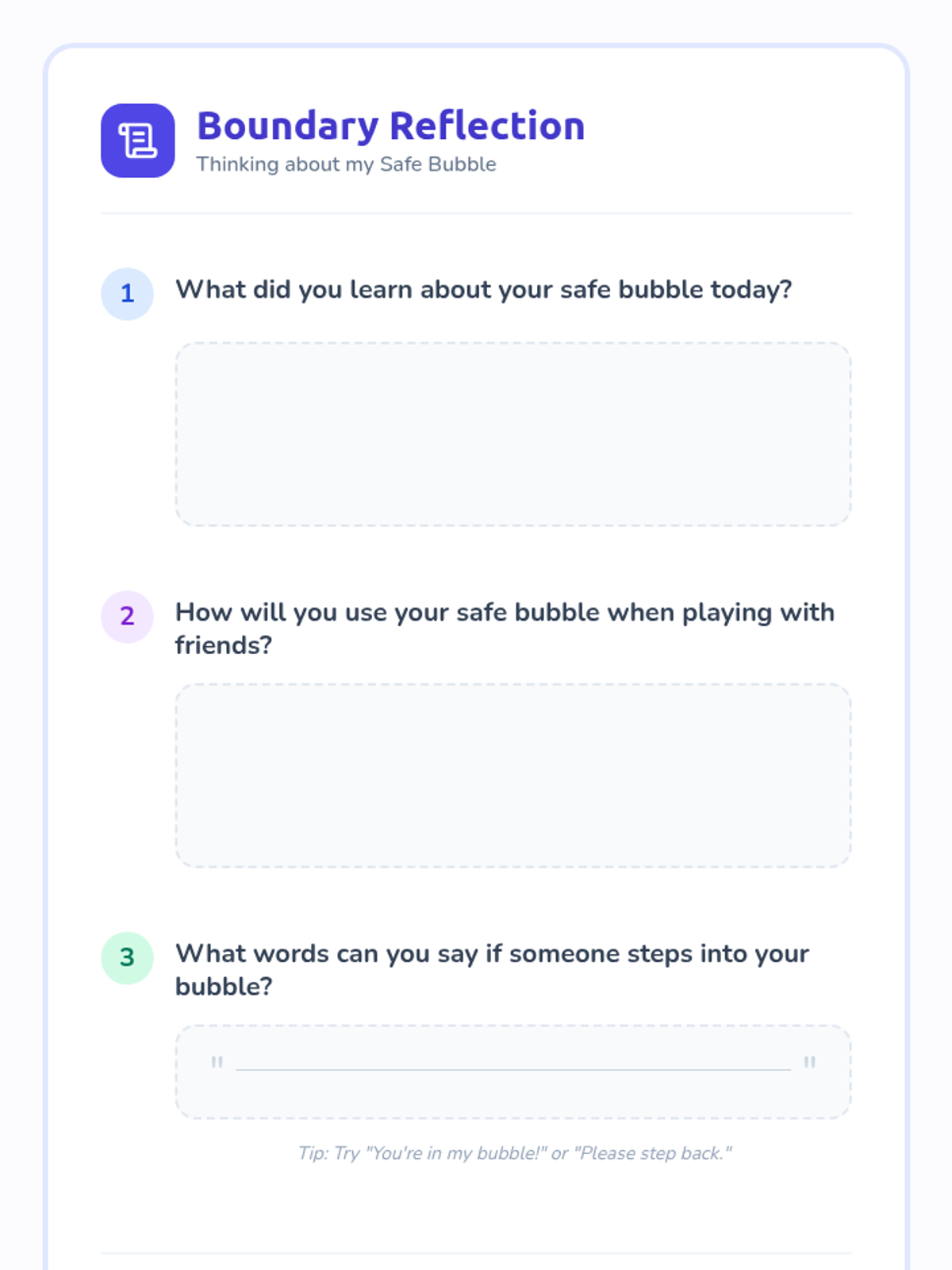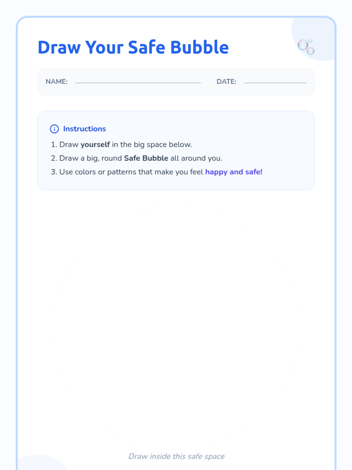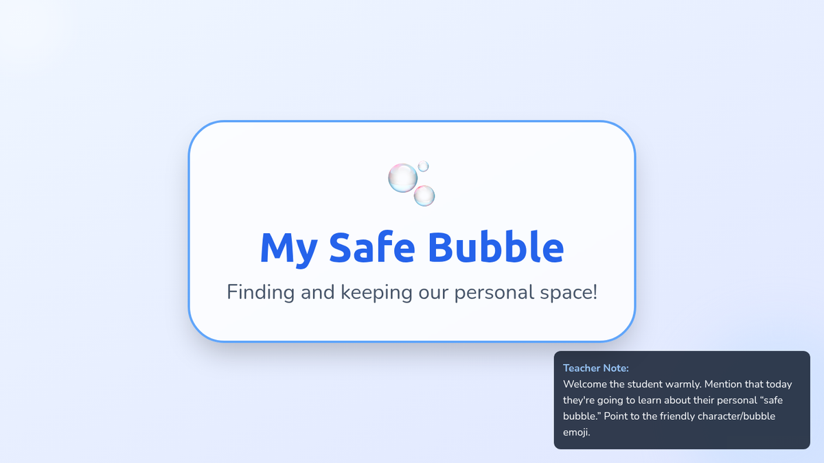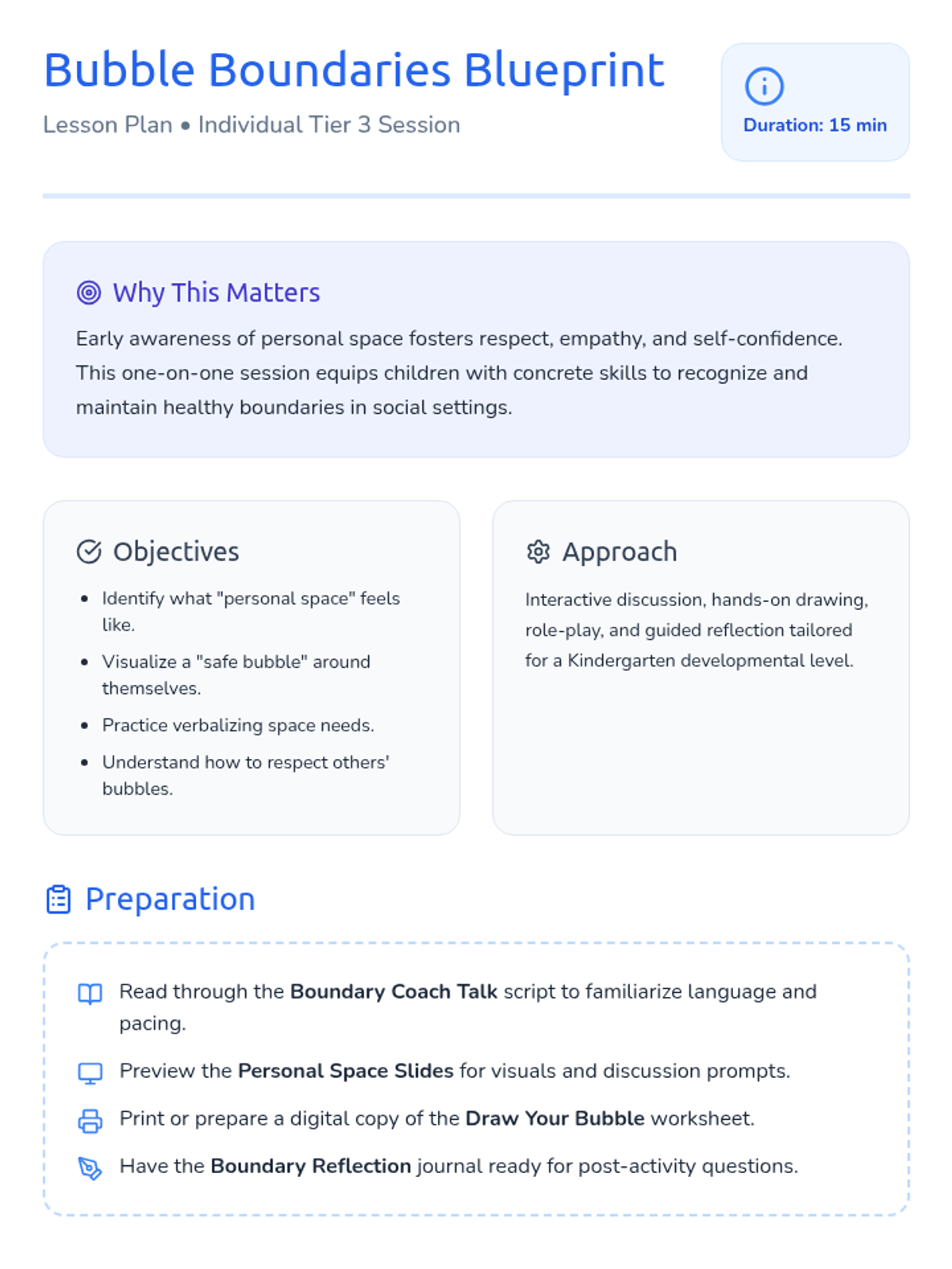 A Tier 3 one-on-one counseling session for kindergarteners to learn about personal space and boundaries through the metaphor of a 'safe bubble'.