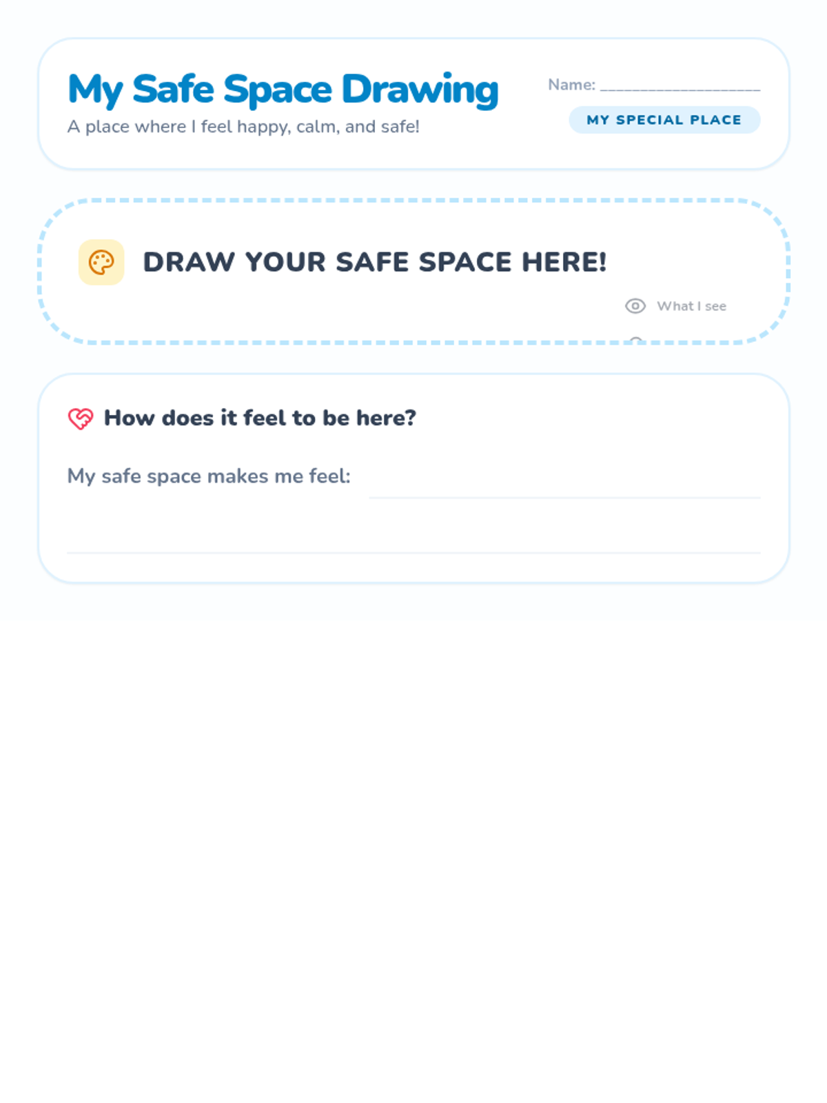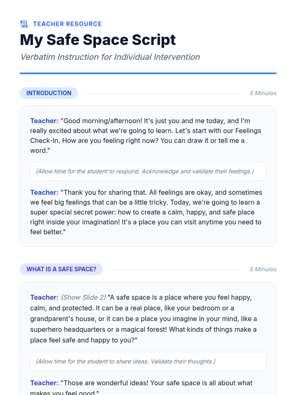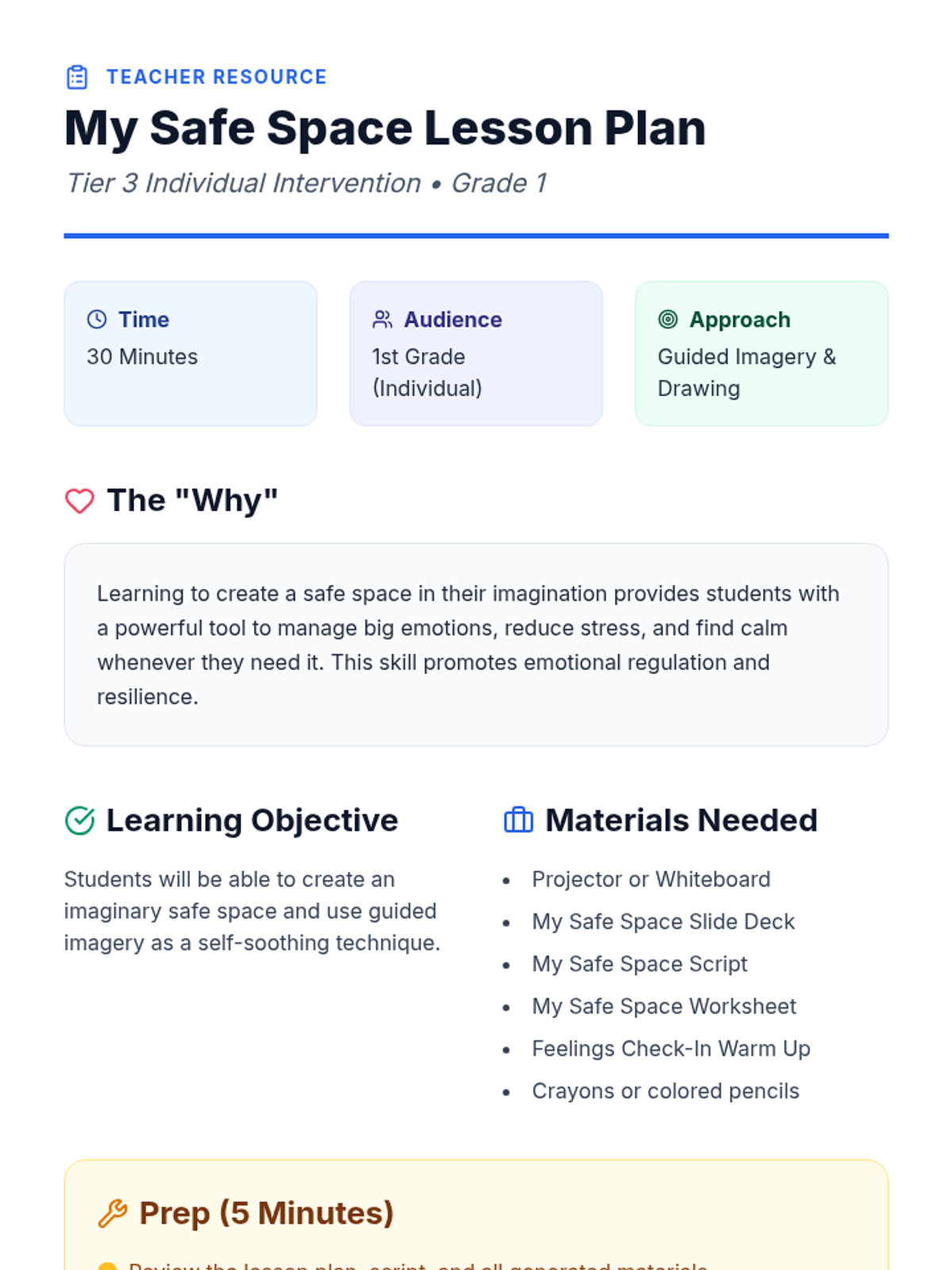 A 30-minute individual Tier 3 intervention for 1st graders to develop an imaginary safe space as a self-soothing tool through guided imagery and drawing.