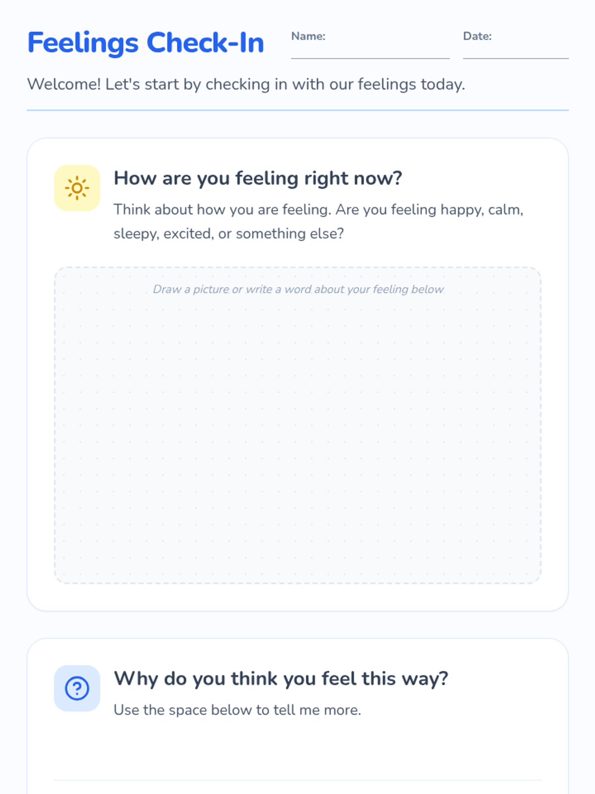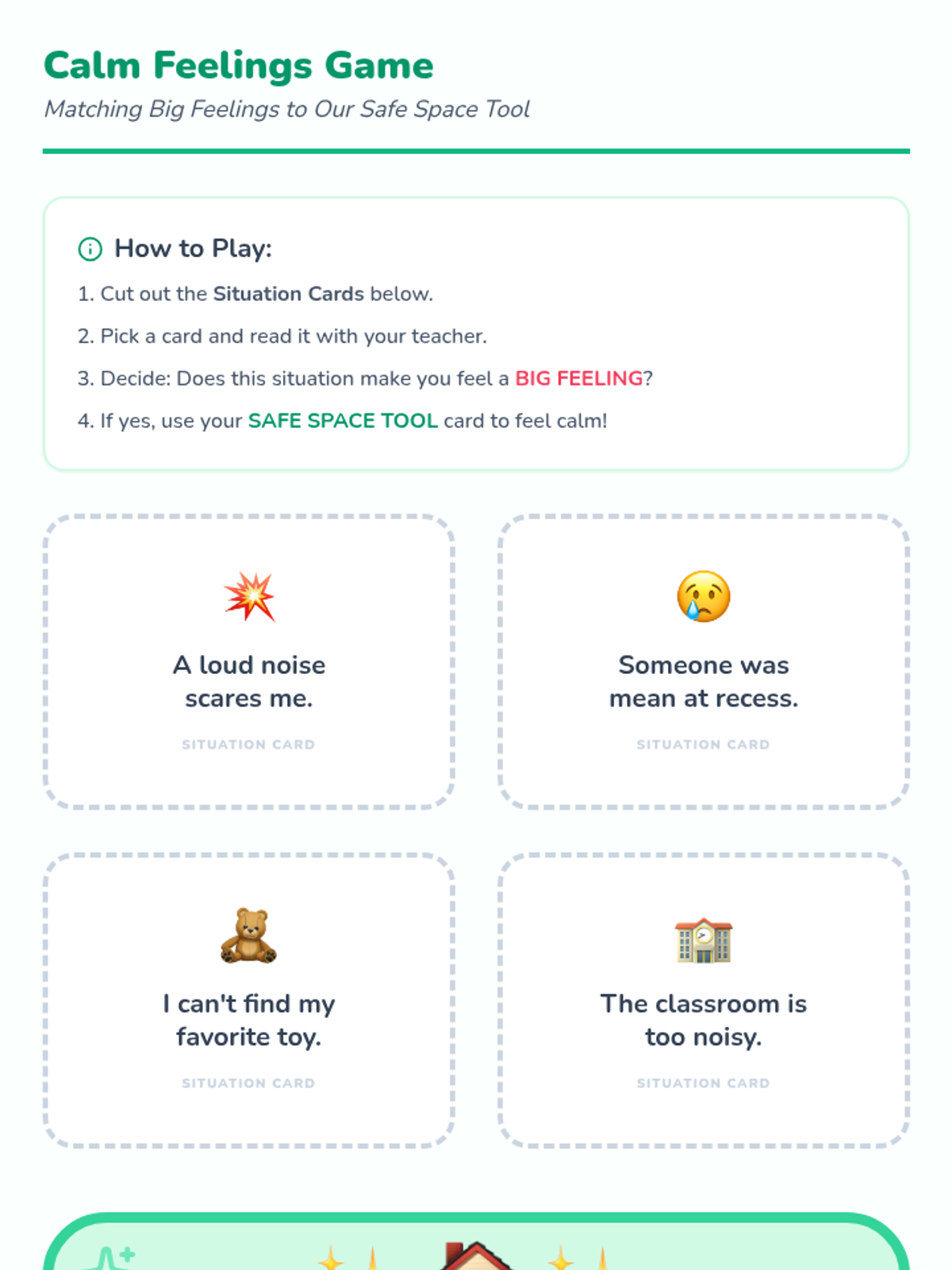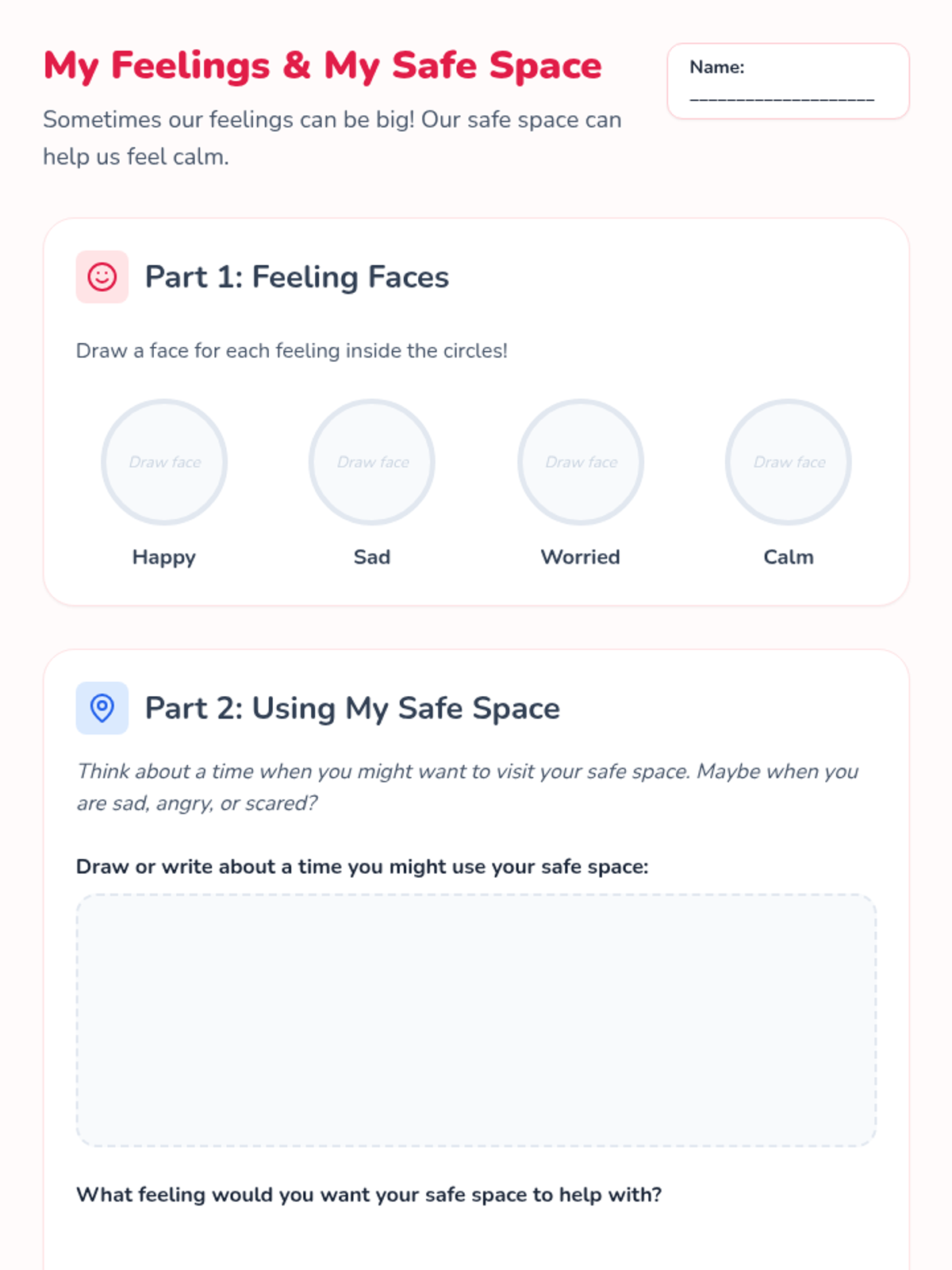 A 30-minute individual Tier 3 intervention for 1st graders to develop an imaginary safe space as a self-soothing tool through guided imagery and drawing.