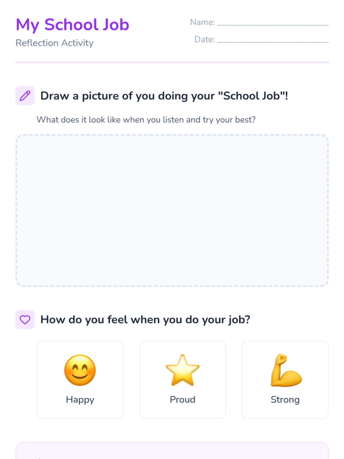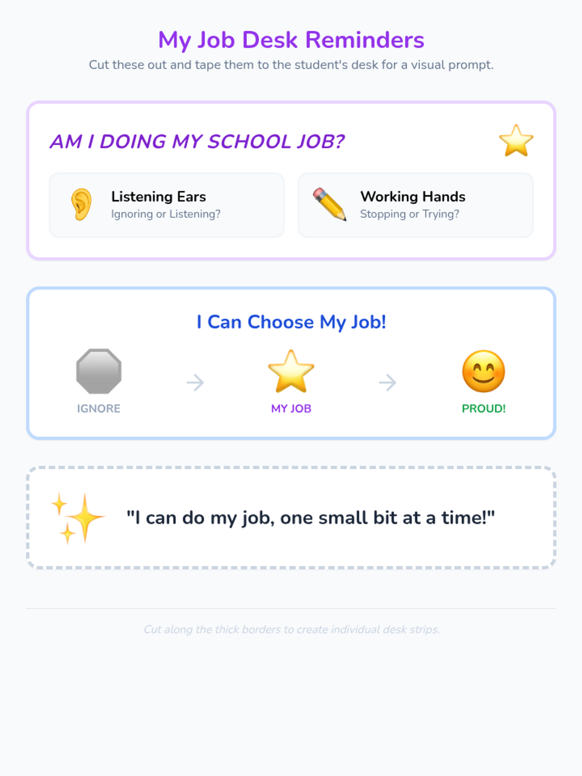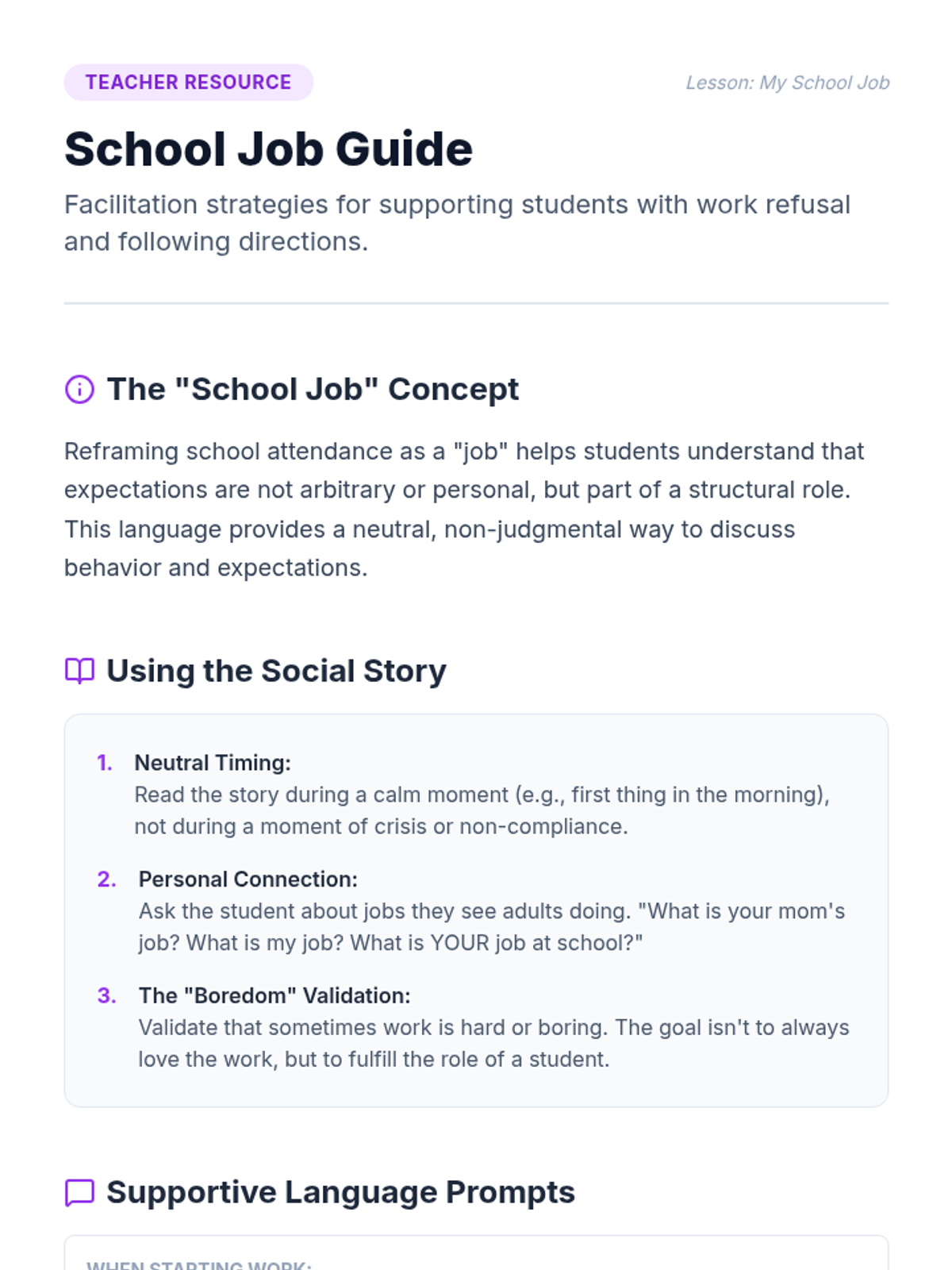 A supportive lesson designed to help a 1st-grade student understand their role in the classroom, focusing on following teacher instructions and completing work as their 'school job'.