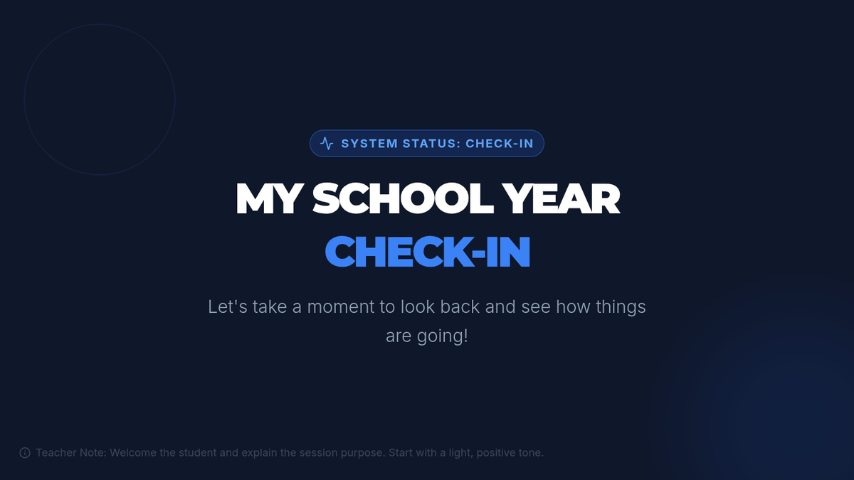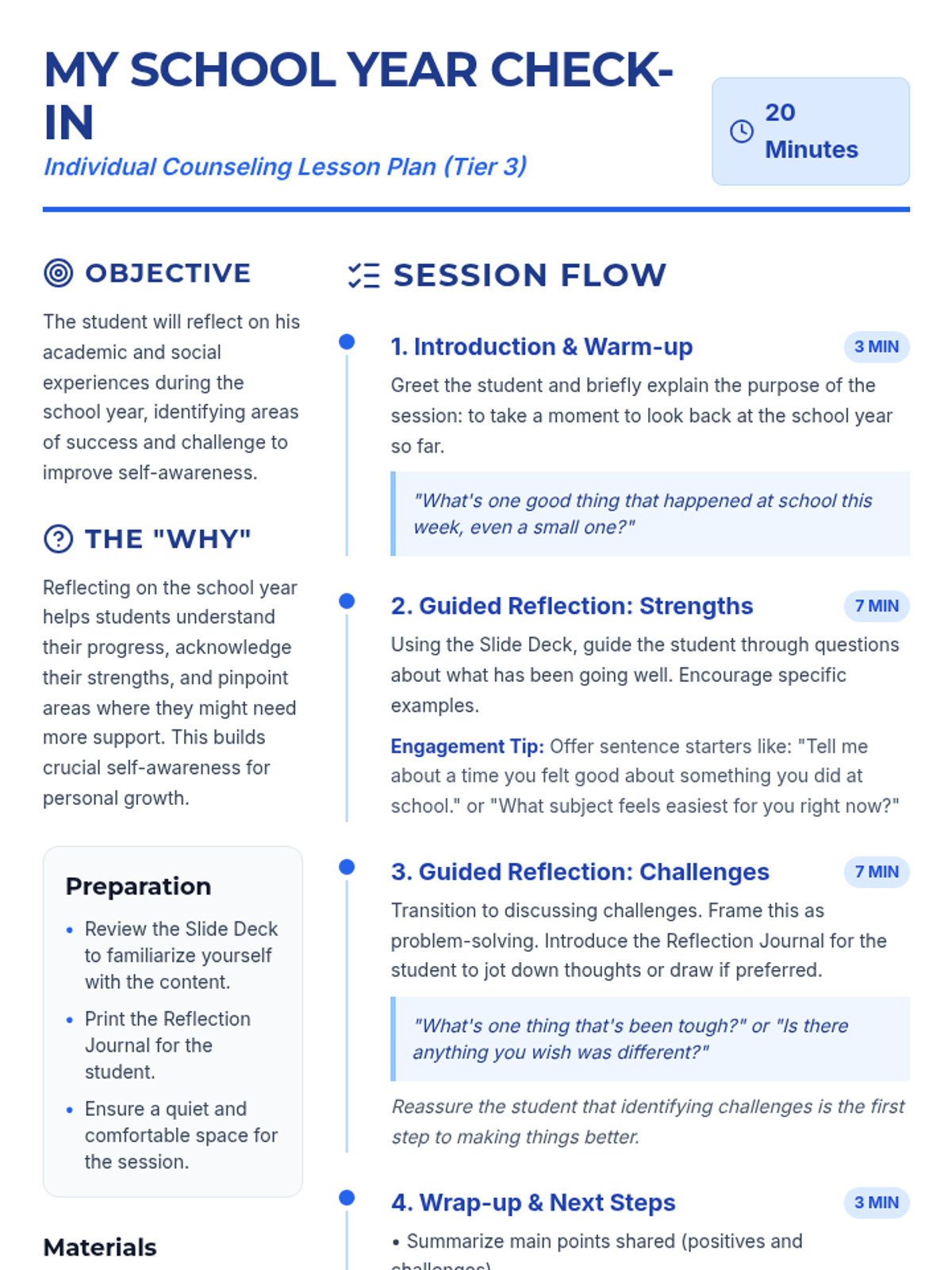 A 20-minute individual counseling session for 7th-grade students to reflect on their academic and social progress, identifying strengths and challenges to build self-awareness.