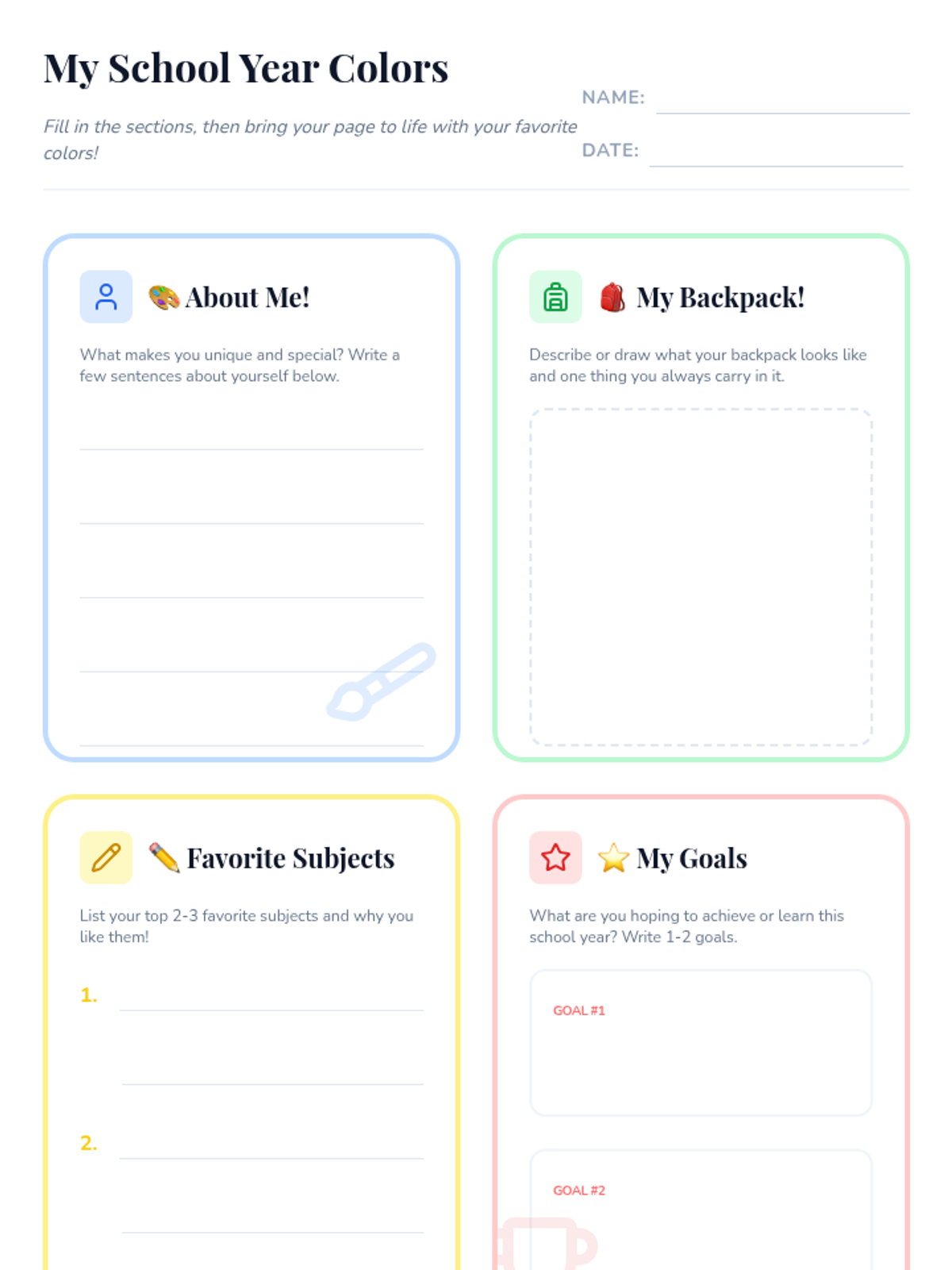 A creative reflection activity for 5th graders to share their identity, interests, and goals through a coloring-based worksheet. Designed for small groups to foster connection at the start of the school year.