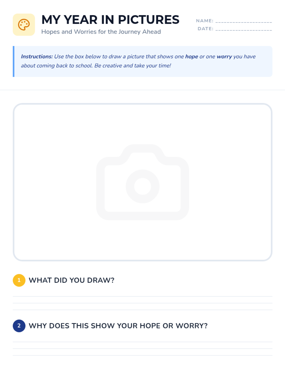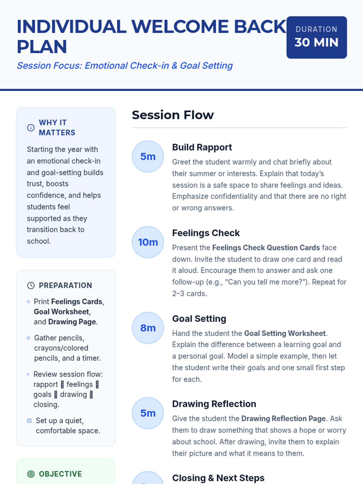 A 30-minute individual Tier 3 counseling session for 4th graders to process emotions, set personal and academic goals, and visualize their year ahead through creative reflection.