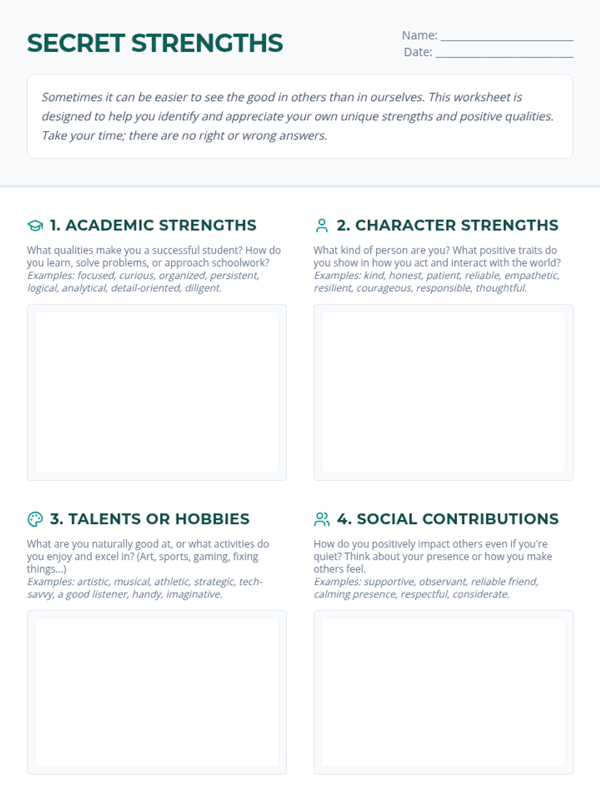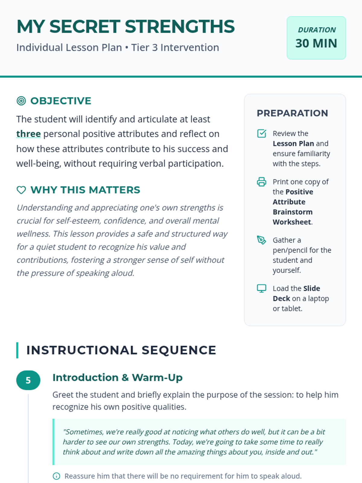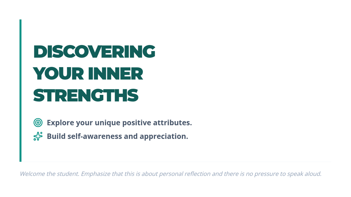 A Tier 3 individual lesson for high school students to identify and appreciate their personal strengths through written reflection and internal exploration. This lesson is specifically designed for quiet students, focusing on non-verbal expression.