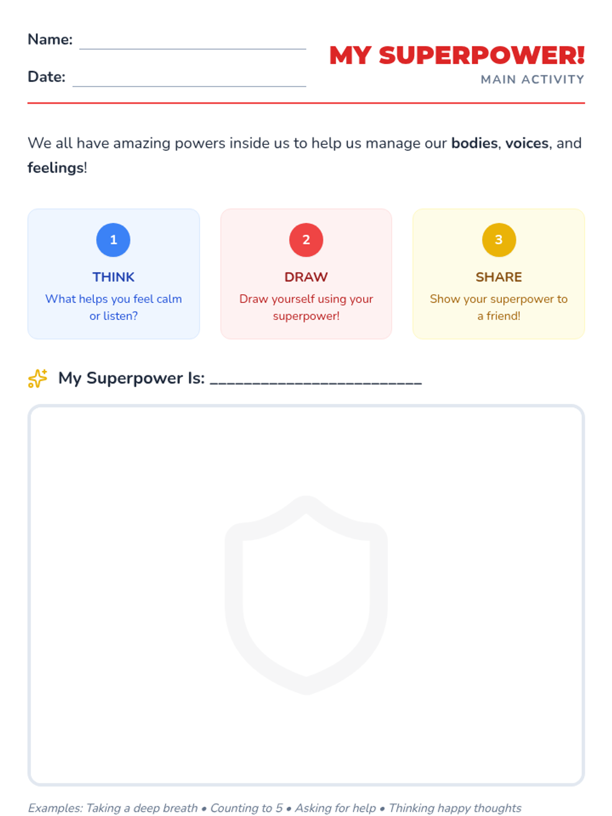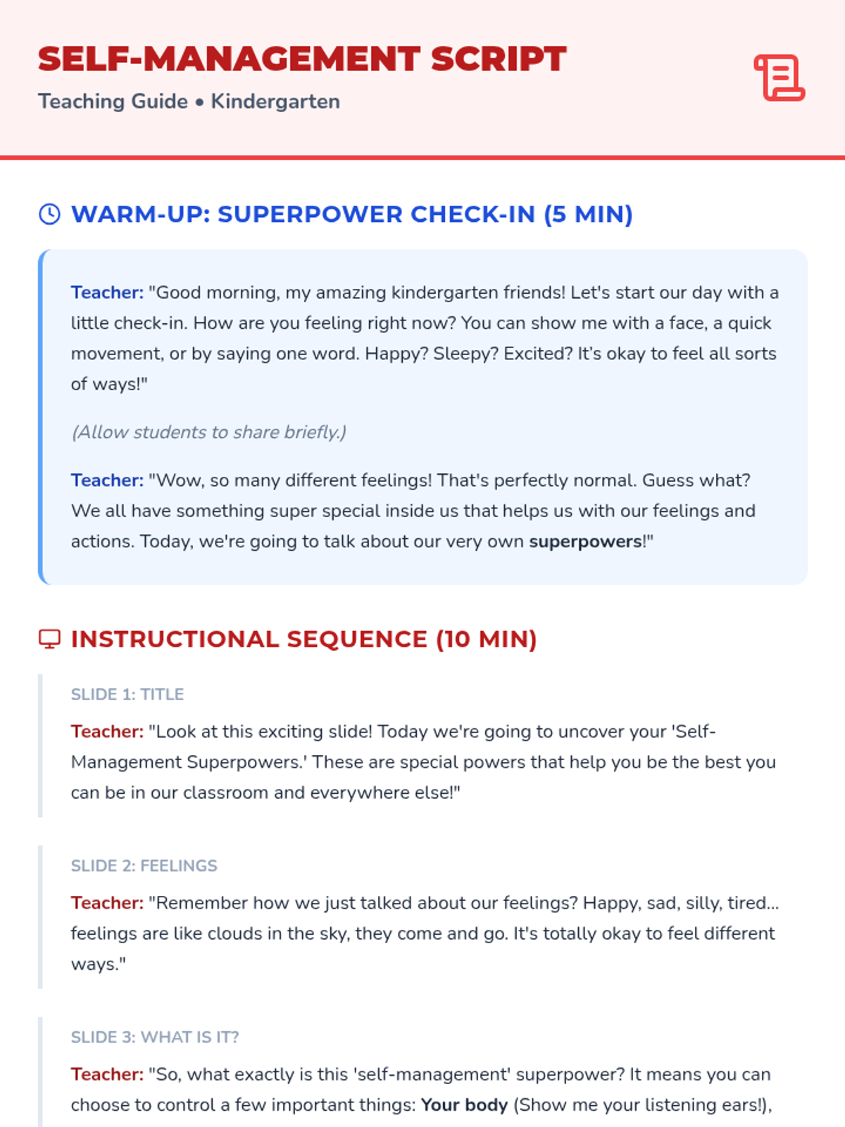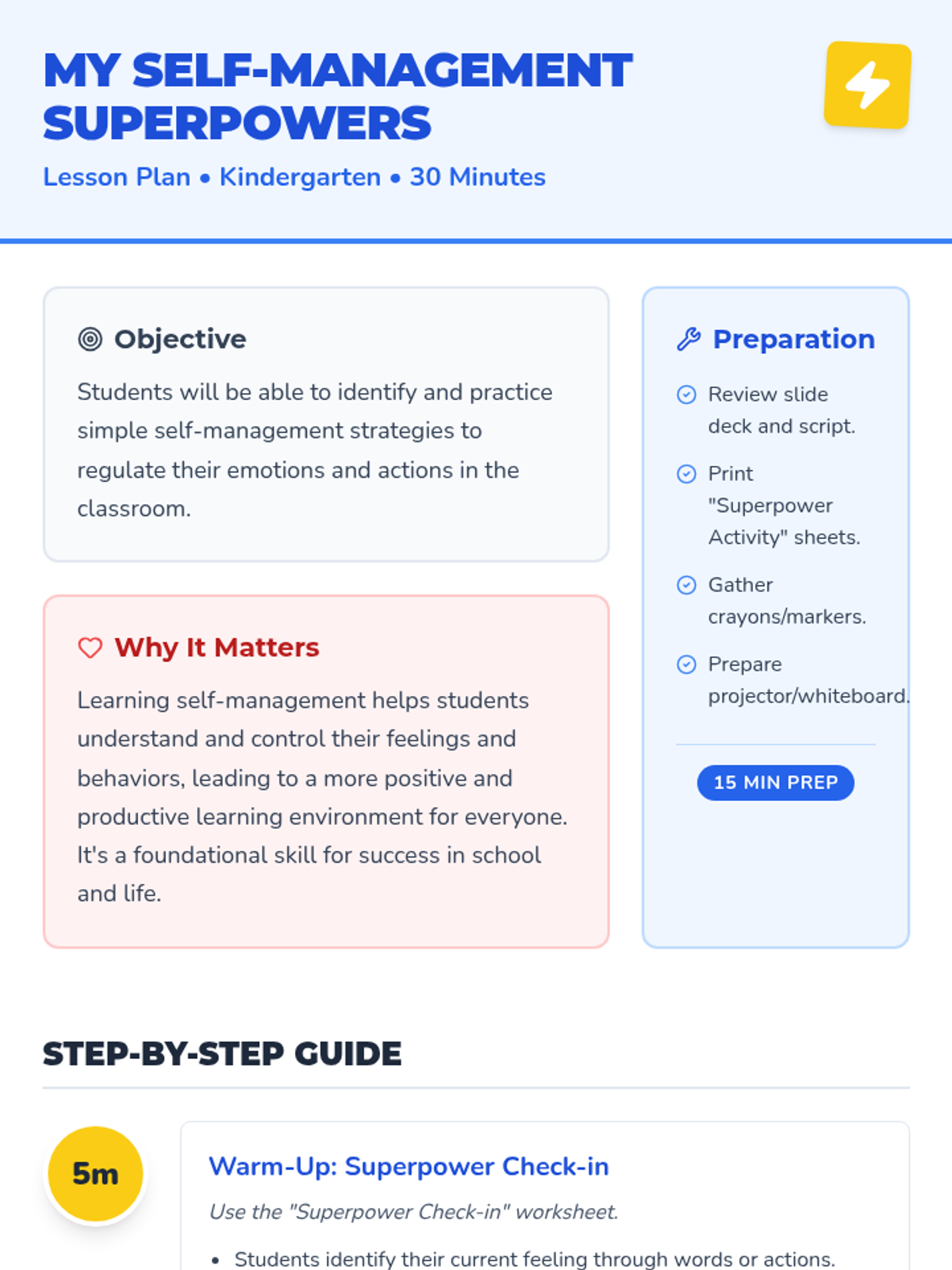A 30-minute kindergarten lesson that introduces students to self-management strategies through the metaphor of 'superpowers' to help them regulate their emotions and actions.