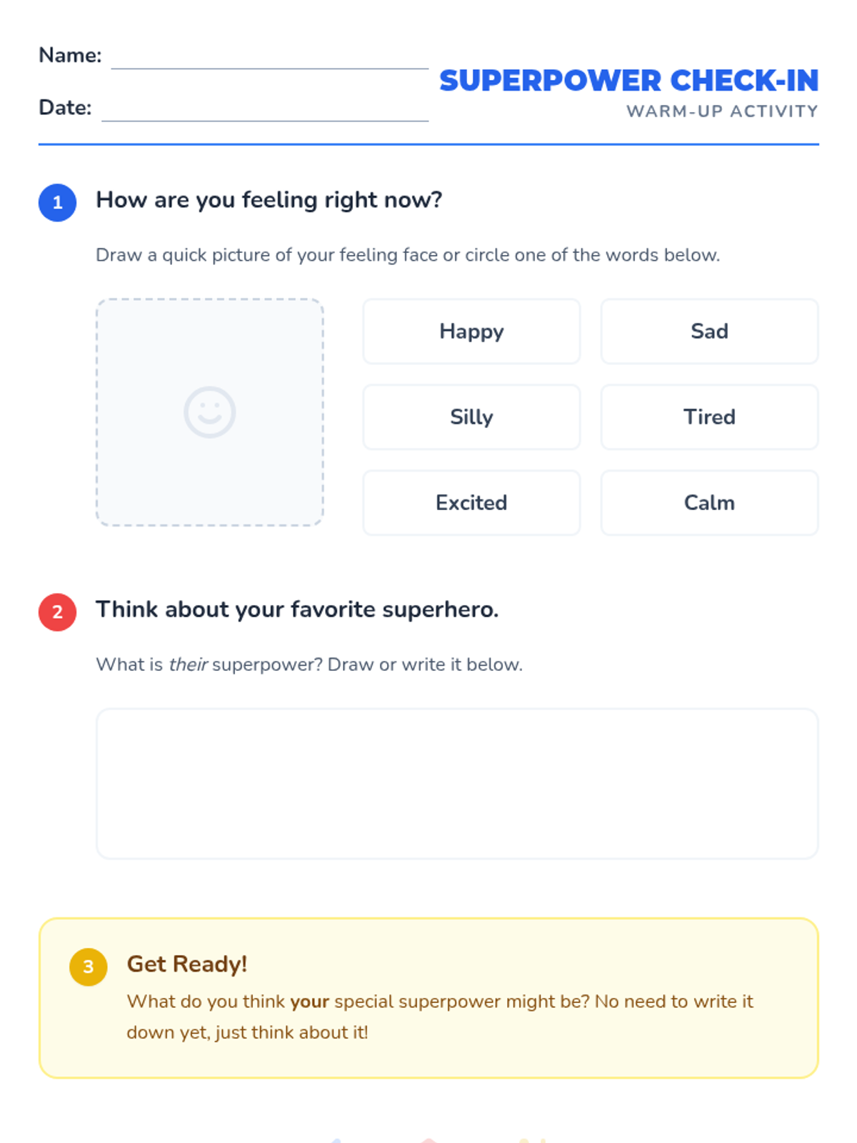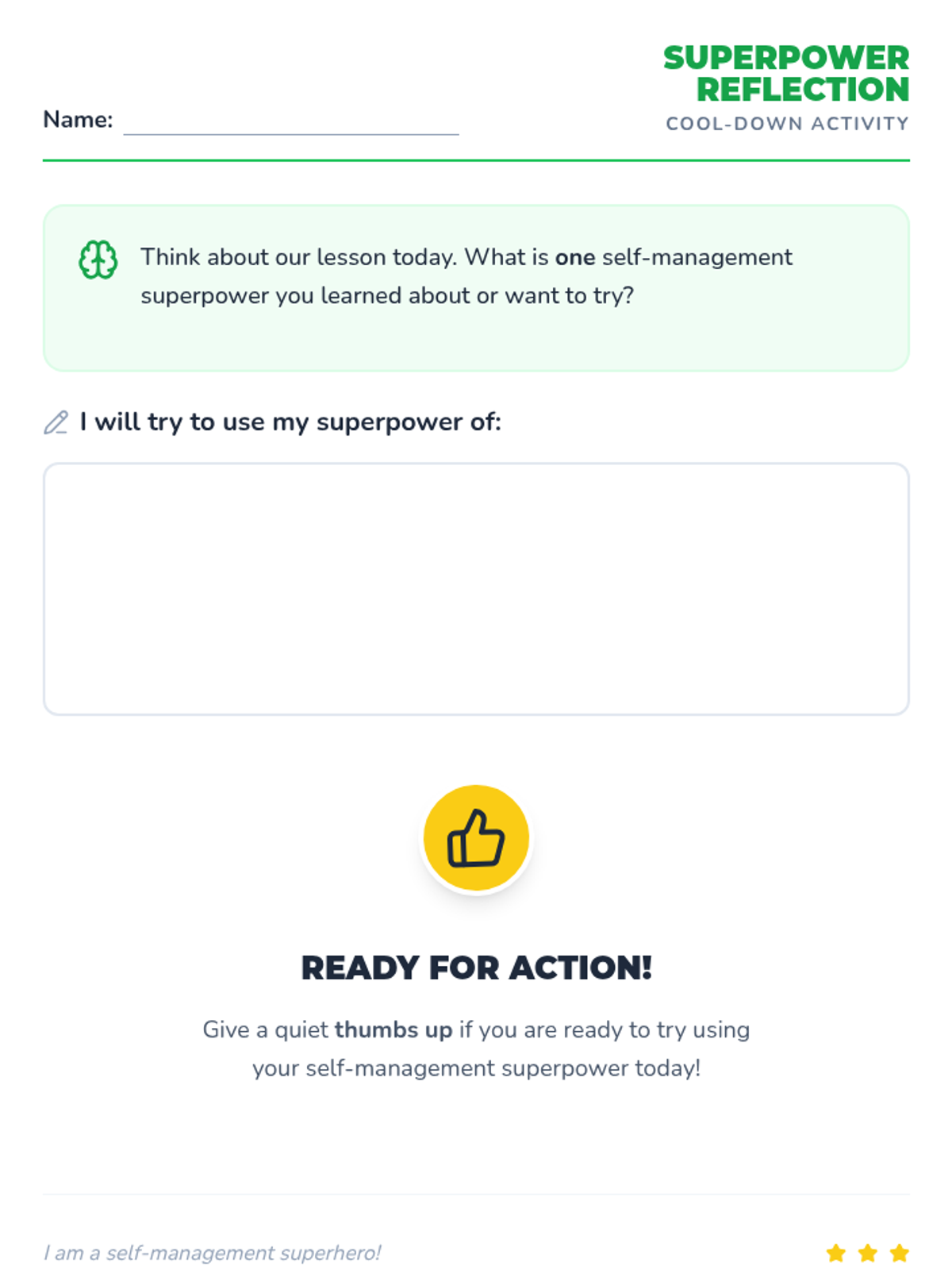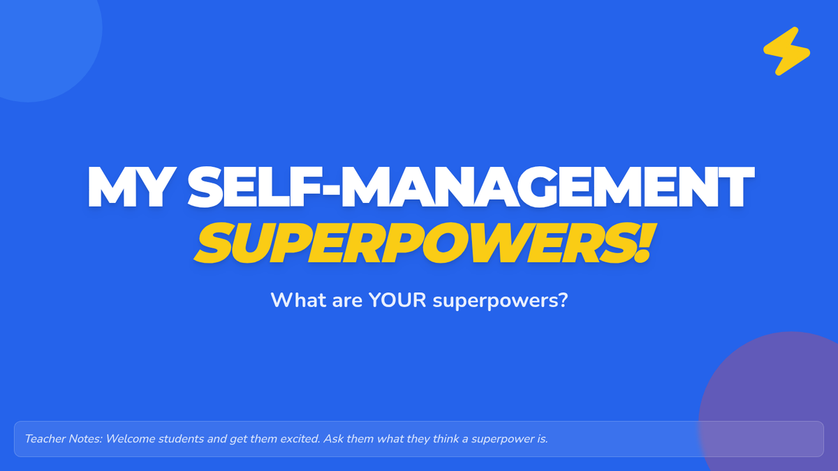A 30-minute kindergarten lesson that introduces students to self-management strategies through the metaphor of 'superpowers' to help them regulate their emotions and actions.