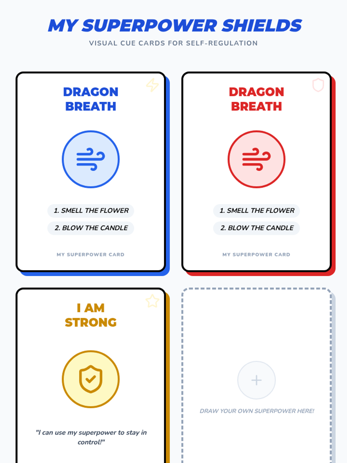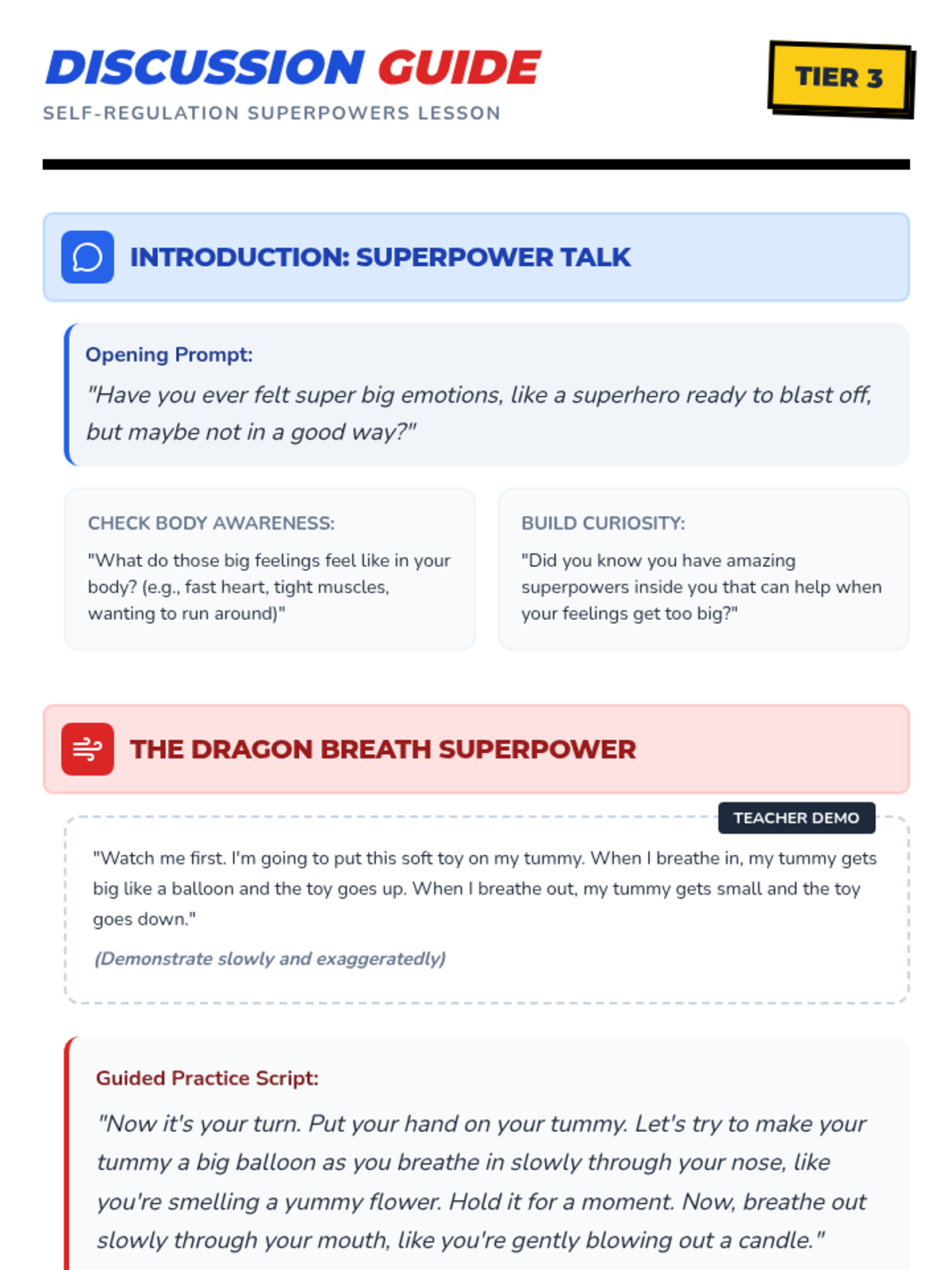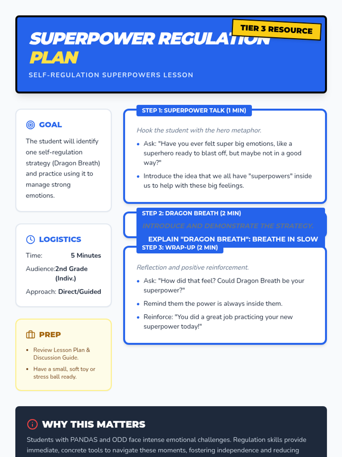 A 5-minute Tier 3 individual lesson for a 2nd-grade student with PANDAS and ODD, introducing the 'Dragon Breath' self-regulation strategy through a superhero theme.