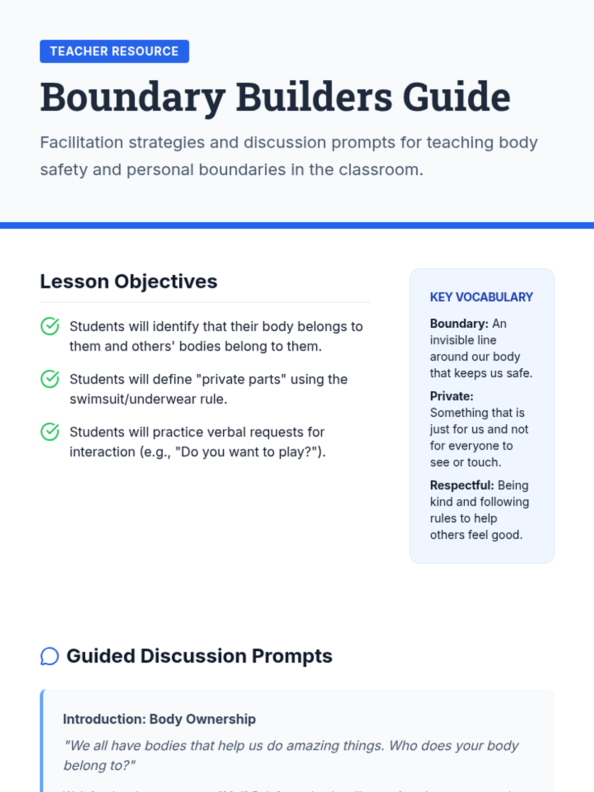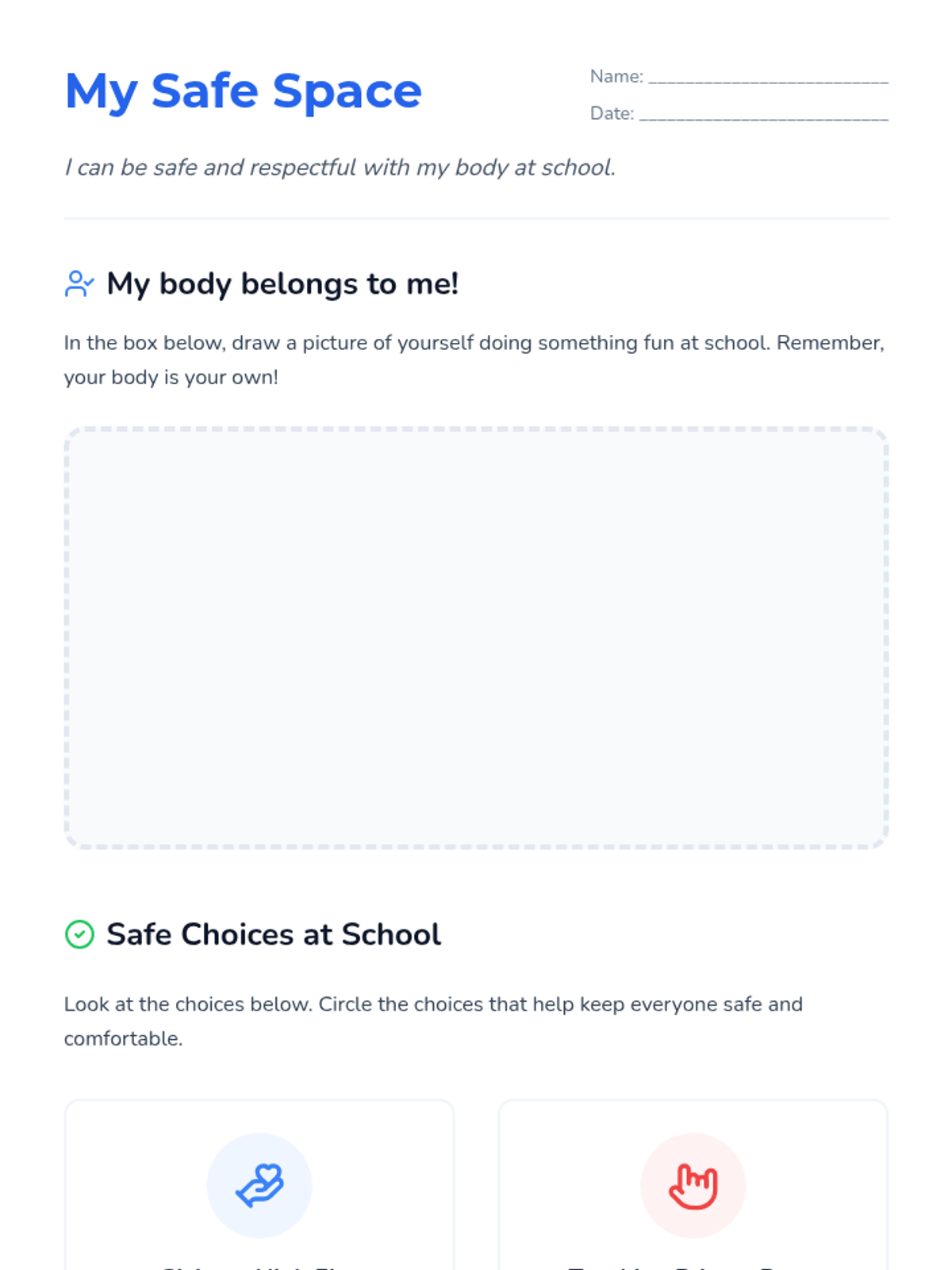 A foundational lesson introducing the concept of personal space, body ownership, and the distinction between private and public body parts.
