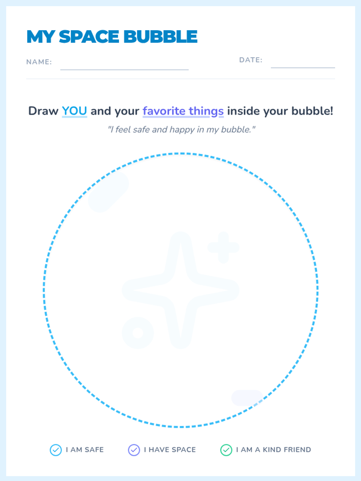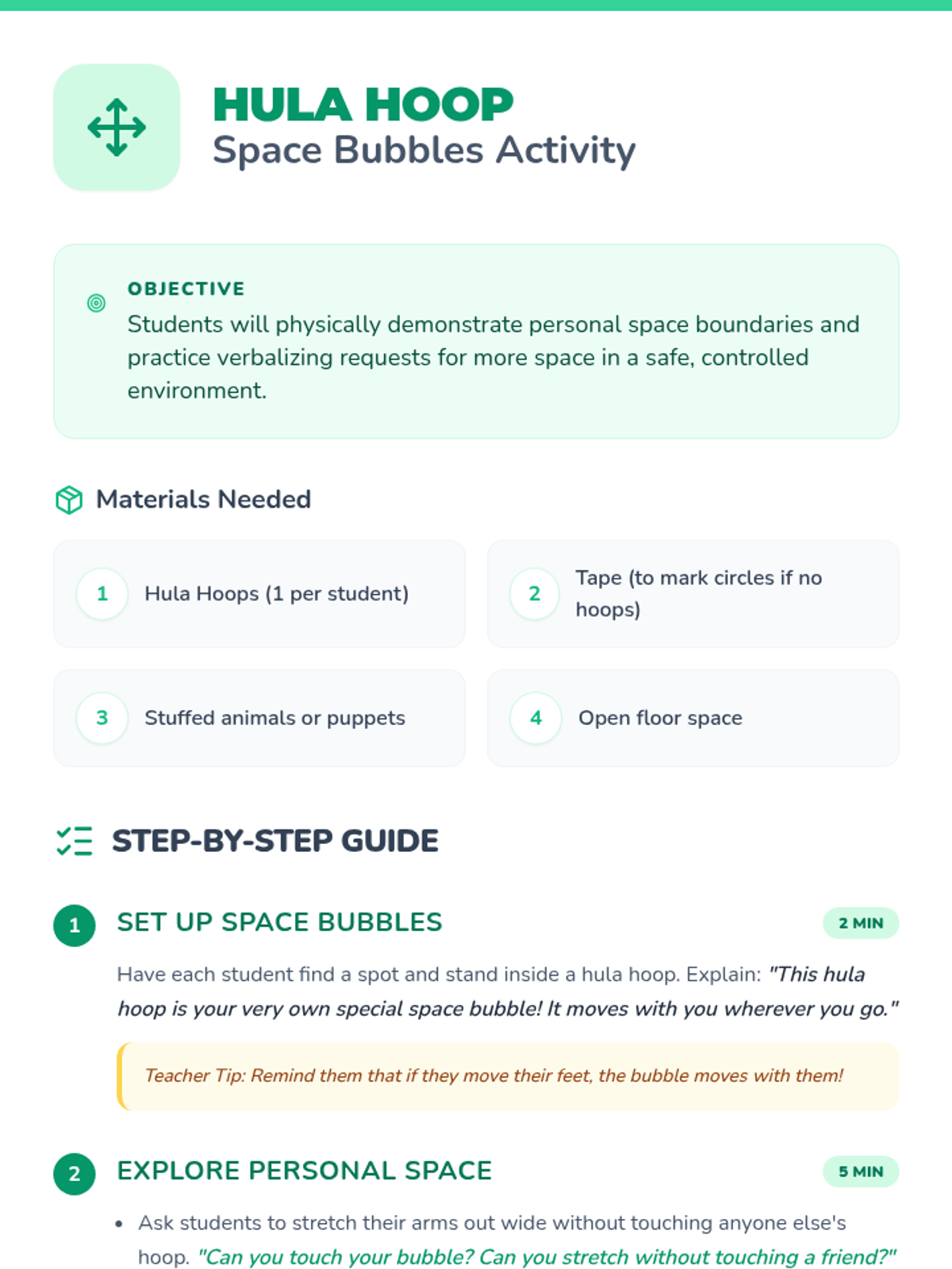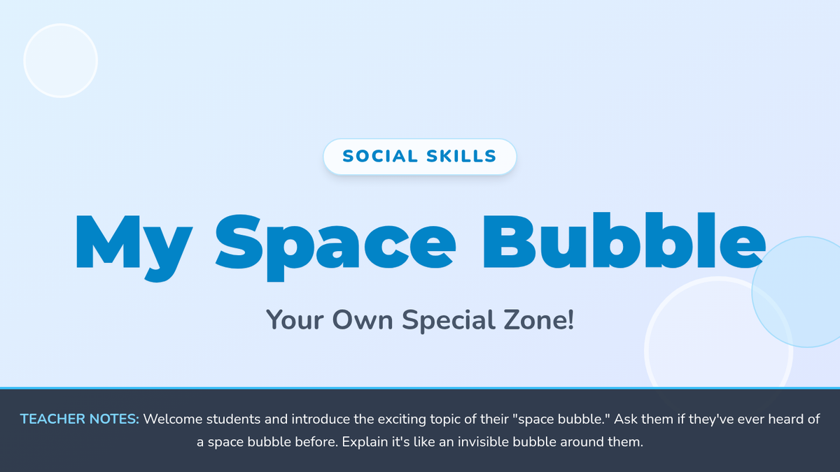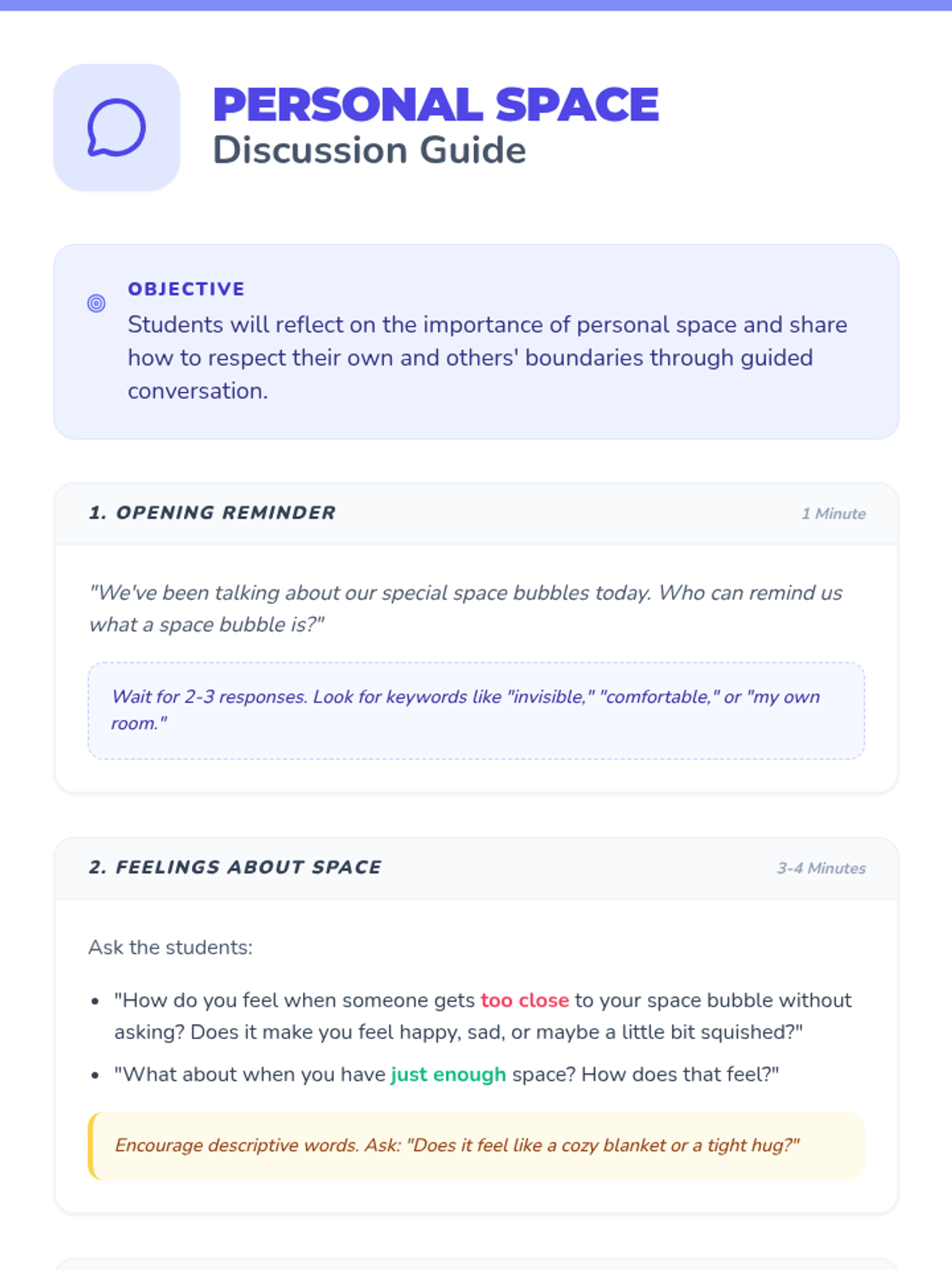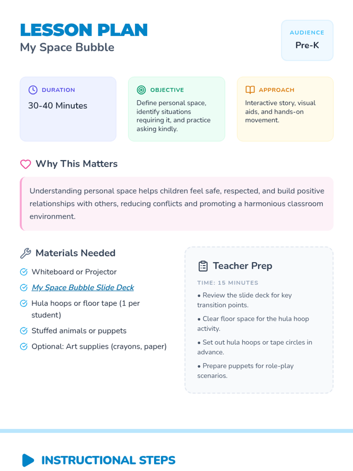 This lesson introduces Pre-K students to the concept of personal space and respecting boundaries through a 'space bubble' metaphor. It includes a story, a hands-on movement activity, and guided discussion to foster social-emotional awareness.
