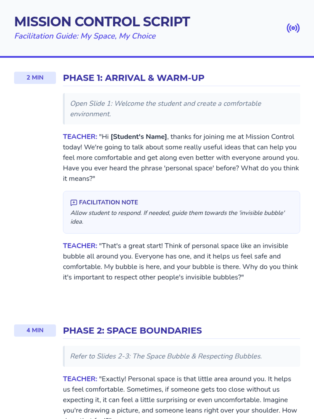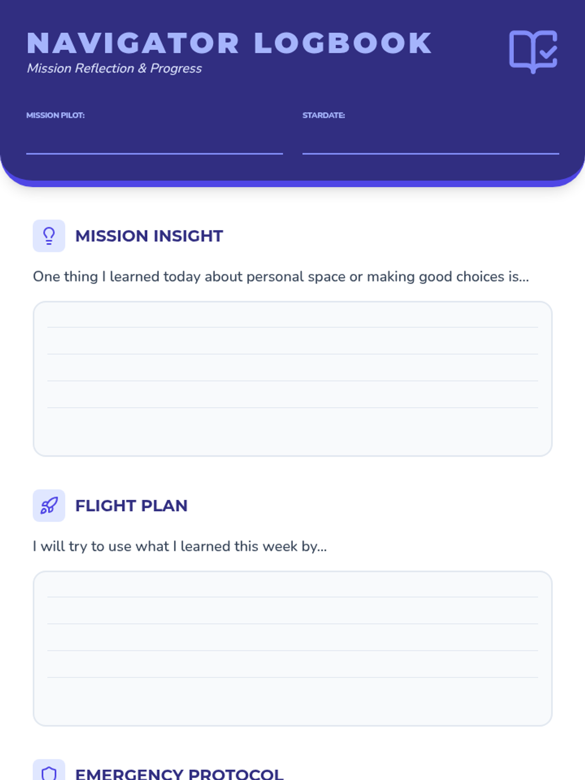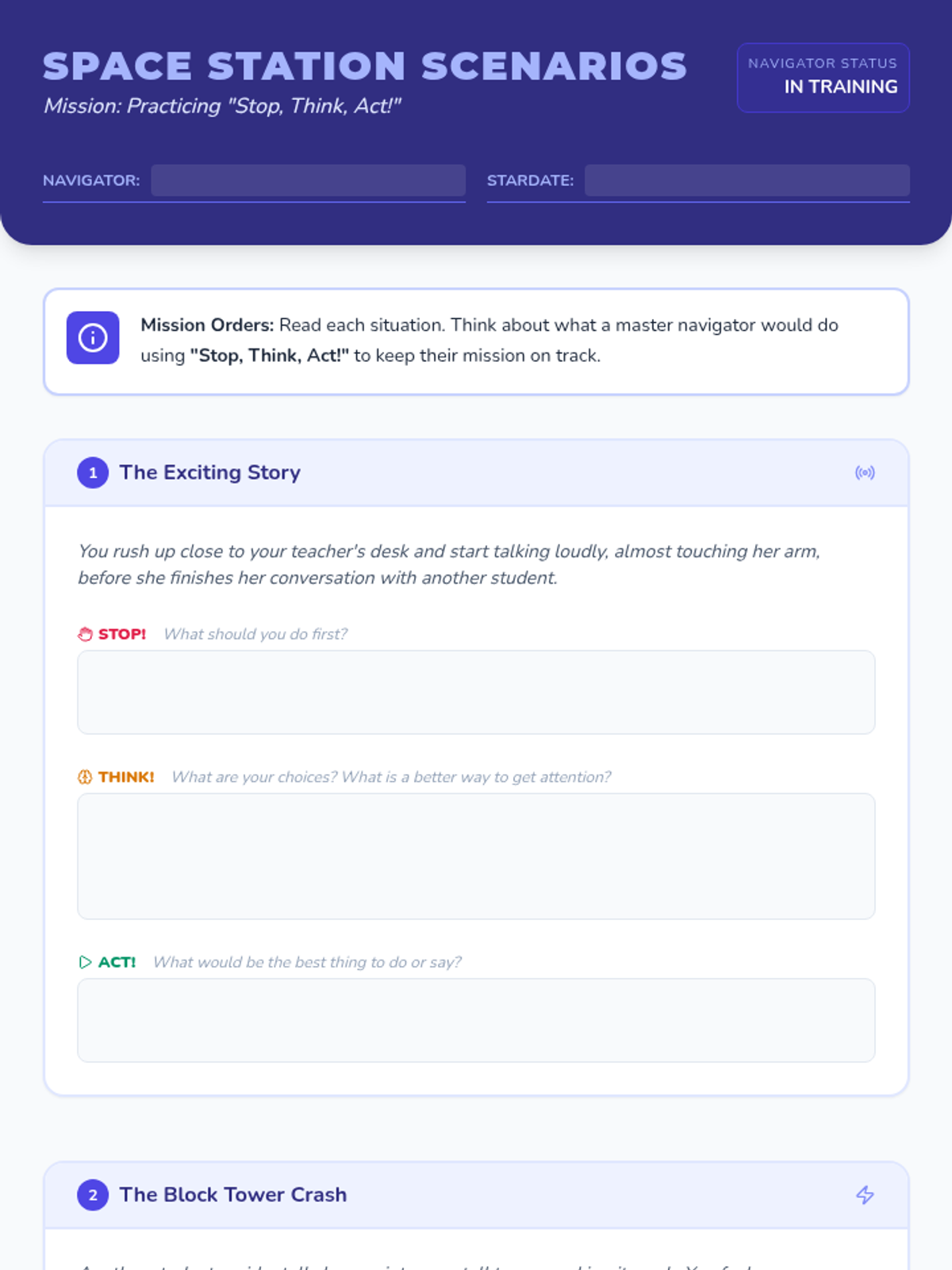 A 15-minute, Tier 3 individual lesson for 3rd grade students focusing on personal space, impulse control, and personal responsibility through a 'galactic navigator' lens.